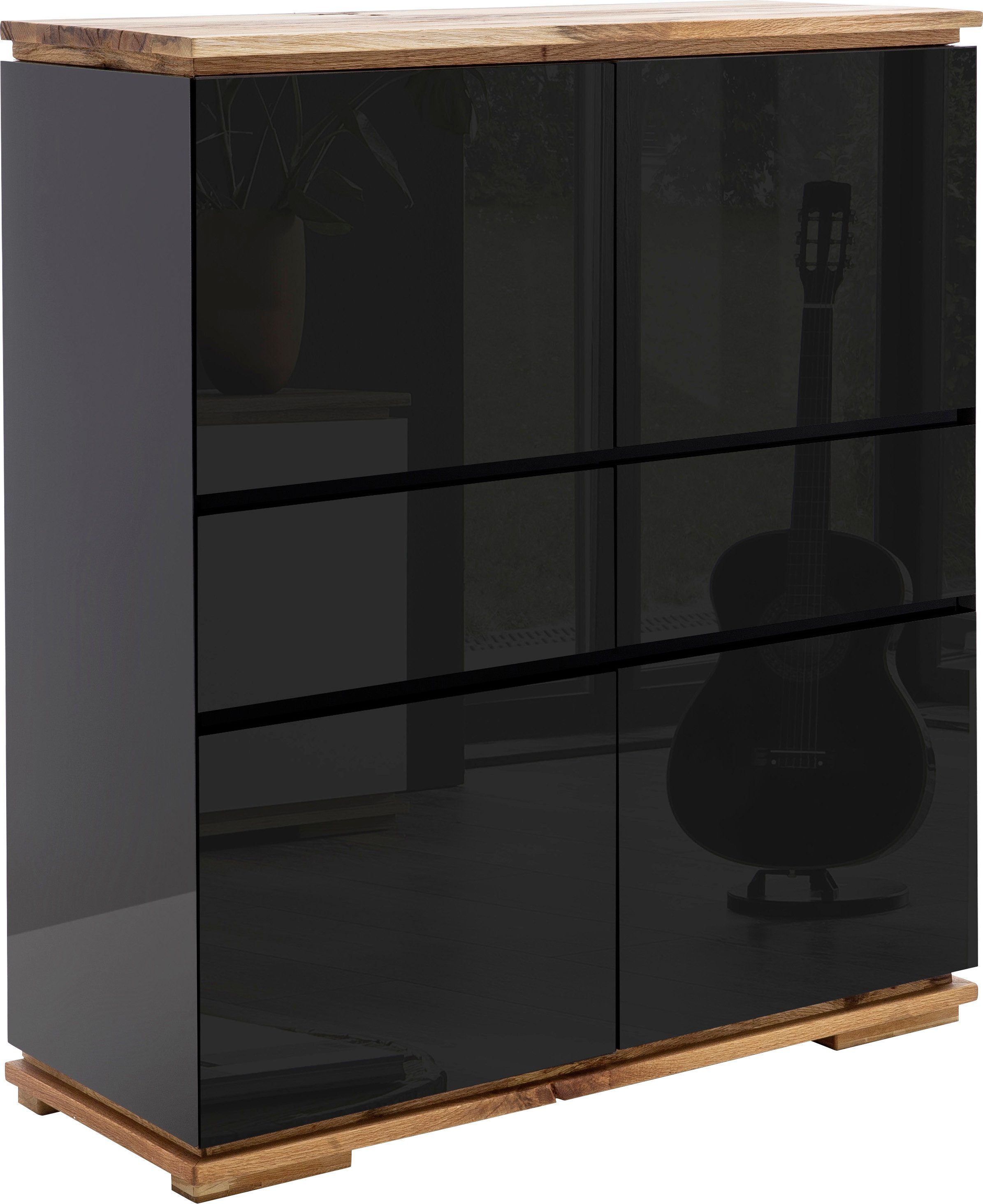 Wissenswertes | Belastbarkeit bis max. 50 kg Fachinnenmaße Tür je ca. BxHxT 48x37x34 cm Mit 4 Türen und 2 Schubkästen Oberboden und Sockel in Asteiche Massivholz geölt Schubkasteninnemaß je ca. BxHxT 42,5x10x34 cm Schubkästen mit Selbsteinzug Türen gedämpft Wahlweise Highboard in MDF schwarz Hochglanz lackiert oder weiß matt lackiert |