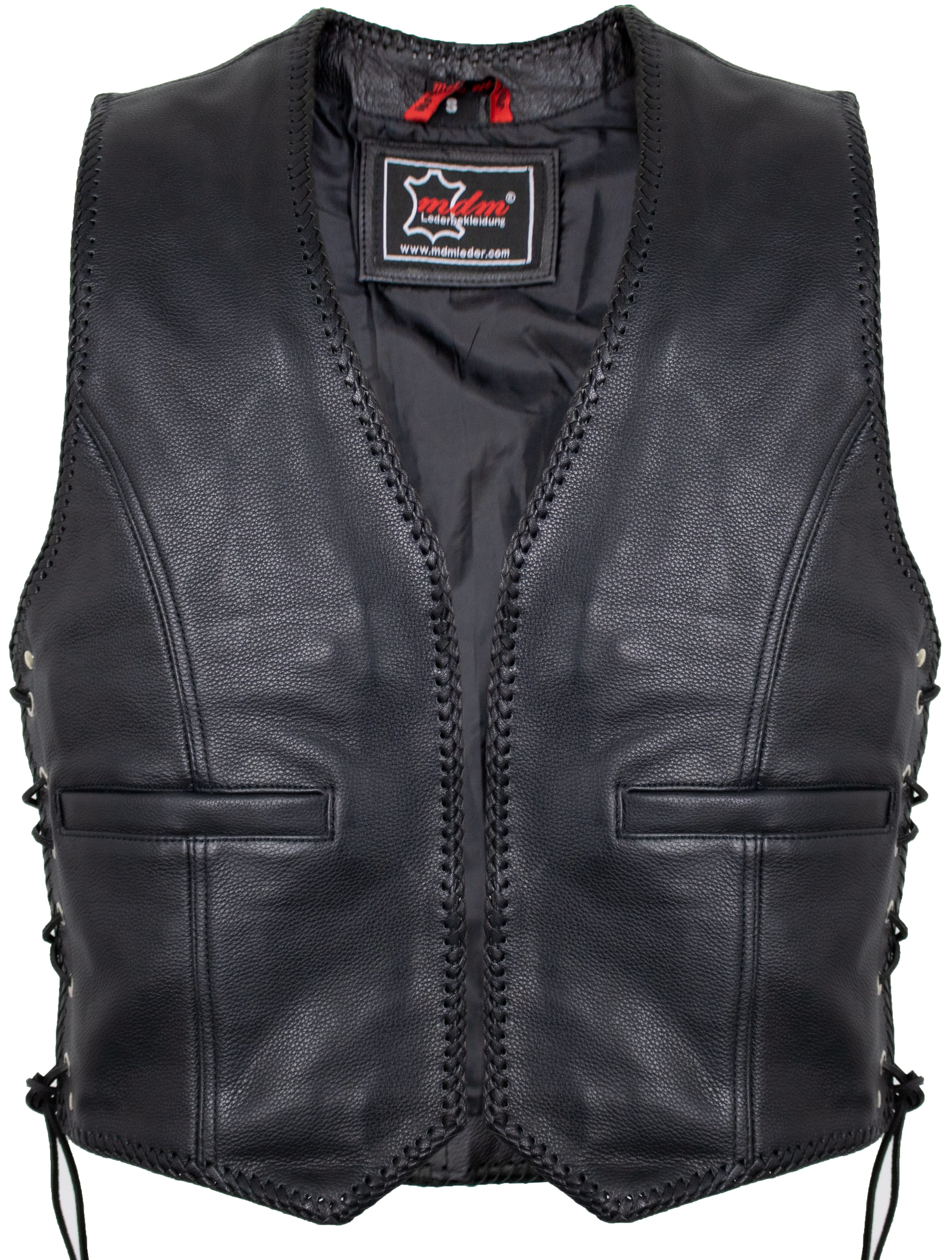 Die Weste besteht aus echtem, hochwertigem Rindsleder mit einer Dicke von 1,1 bis 1,2 mm. Das Leder ist dick und dennoch angenehm weich, was für eine lange Lebensdauer und hohen Tragekomfort sorgt. Die Grundfarbe des Leders ist klassisches Schwarz, und das Innenfutter besteht aus strapazierfähigem Polyester. Ein besonderes Highlight ist die Umrandung, die mit einem geflochtenen Lederband gestaltet wurde und der Weste einen einzigartigen, stilvollen Look verleiht. Die Weste besitzt keine vorgefertigten Verschlüsse, was sie ideal für individuelle Anpassungen macht. Sie ist mit zwei Außentaschen und zwei Innentaschen ausgestattet, die ausreichend Stauraum bieten. Dank der seitlichen Schnürung kann die Weste um bis zu 5 cm pro Seite erweitert werden. Dadurch lässt sie sich problemlos auch über einer Jacke tragen. Diese Weste ist die perfekte Wahl für alle, die ein robustes und zugleich individuelles Kleidungsstück suchen.