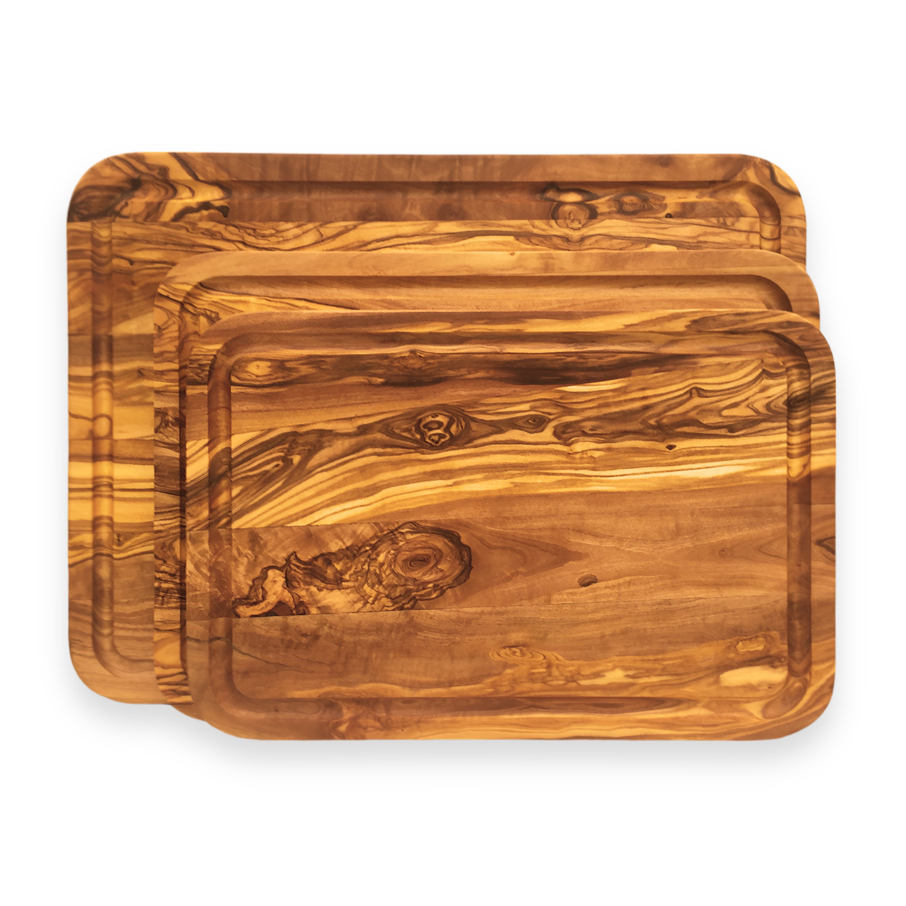 Die natürliche, rötlich-braune Maserung und die glatte Oberfläche des Olivenholzes machen das Servierbrett zu einem dekorativen und funktionalen Küchenaccessoire.
