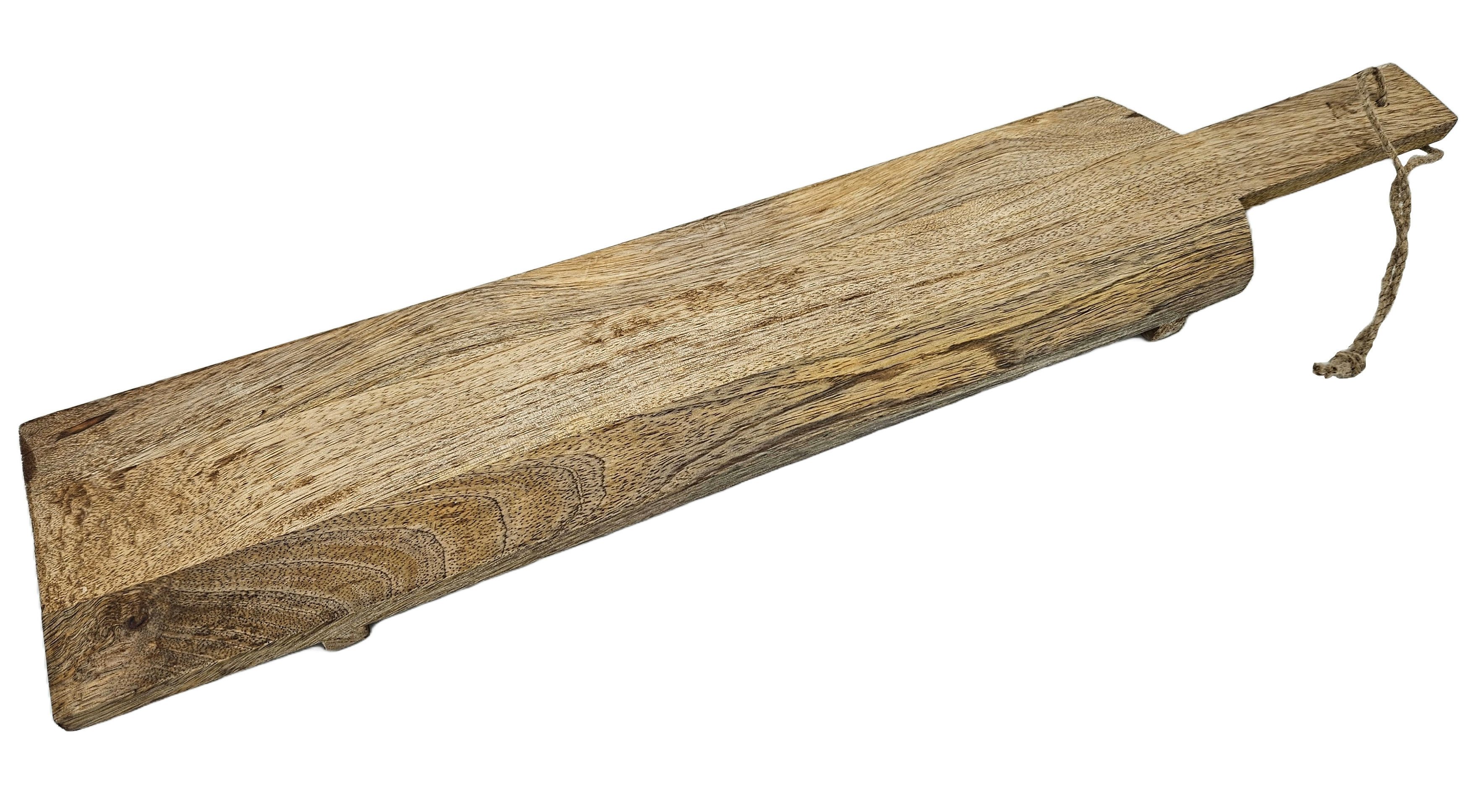 Massive Servierplatte in länglicher Form aus Mangoholz mit Füßen, Griff und Kordel. Das Tablett ist für Lebensmittel geeignet.