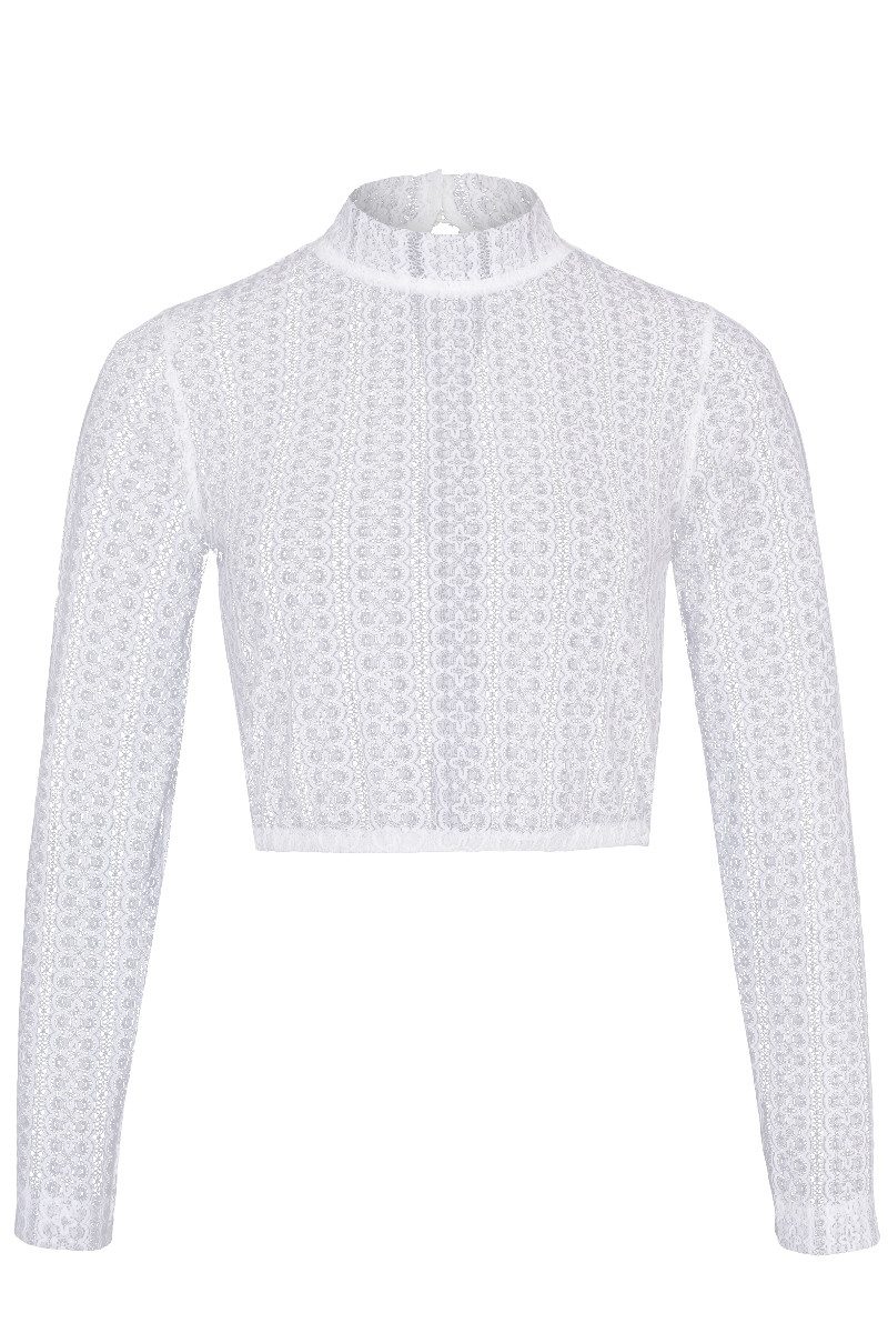 Die faszinierende, hochgeschlossene Dirndlbluse "Mona" besteht komplett aus längselastischer, semitransparenter Spitze und hat ein bezauberndes Muster aus Ornamentik-Linien und stilisierten Blüten im Streifen-Look. Zudem hat sie lange Ärmel und einen verstärkten Rundhals-Stehkragen, der hinten mit zwei Knöpfen und elastischen Knopfschlaufen geschlossen wird. Der elastische Saum sorgt für einen perfekten Sitz; die Bündchen sind leicht elastisch. Bitte beachten Sie bei der Retro-Dirndlbluse den Größenzuschlag bei Розмір 48.