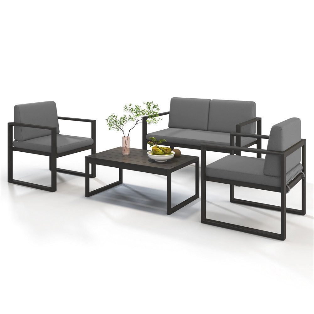 Das Sitzensemble bietet mit seinem modernen Design eine stilvolle Möglichkeit, sich zu entspannen. Die dicken Kissen sorgen für hohen Sitzkomfort und schaffen eine Atmosphäre, in der man das Leben in vollen Zügen genießen kann. Die einzelnen Elemente lassen sich je nach Wunsch neu anordnen und verleihen soeine persönliche Note. Dank der pflegeleichten und wasserabweisenden Kissen sowie des stabilen Untergestells aus Aluminium ist das Sitzensemble rostfrei. Um das Produkt vor Materialermüdung und Verfärbungen zu schützen, empfiehlt es sich jedoch, eine Schutzabdeckung zu verwenden.