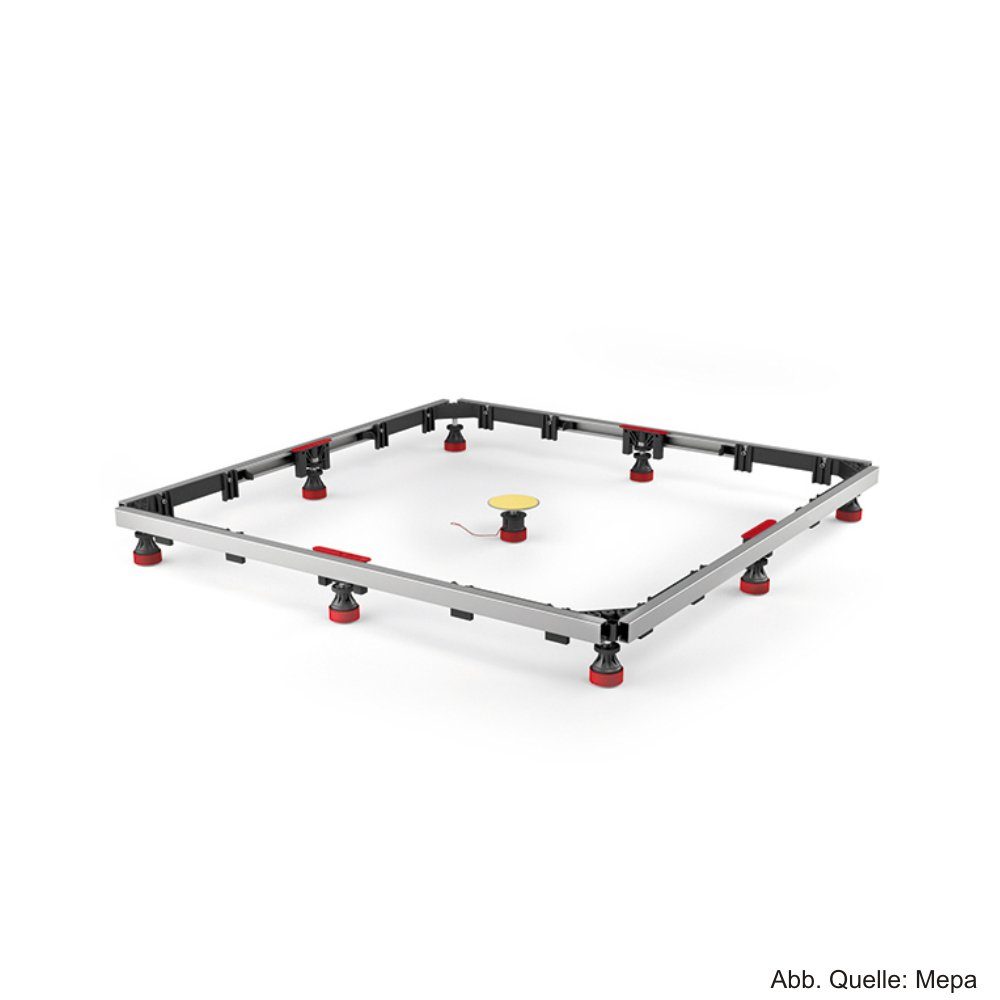 MEPA Montagerahmen SF für Rechteck-Stahl-/Mineralguss- und Acryl-Duschwannen bis 120x120 cm, 150182 - Eigenschaften: für extra- und superflache rechteckige Stahl-Duschwannen und Mineralguss-/Acryl-Duschwannen mit glattem Untergrund. Flexibel ablängbar und einfach einstellbar. Всі Montageschritte erfolgen bequem von oben und bieten durch das durchdachte Konzept einen fachgerechten und standstabilen Einbau. In Verbindung mit Erweiterungsset Ultratief und Extrahoch sind Einbauhöhen von 55 bis 230 mm. Bei Verwendung mit Mineralguss-/Acryl-Duschwannen mit glattem Untergrund die Hinweise beachten. Geeignet für: Duschwannen Wannenmaterial: Stahl Abmessungen: 70x70 cm - 120x120 cm Höhenverstellbarkeit: 125 mm Einbauhöhe von bis: 65-190 mm Wannenkörper: 70x70 cm - 120x120 cm Lieferumfang: 8 höhenverstellbare Schraubfüße 1 EasyLift-Wannenfuß separat zur mittleren Abstützung ADS (Anti-Dreh- und Schallschutz-System) 4 Bodenlaschen zur Fixierung mit Befestigungsmaterial Adapterhülsen 25 mm und 50 mm mit Schraubgewinde 1 Ecktraverse zur variablen Montage des Wannenfußes im Eckbereich bei besonderen Einbausituationen MP150182