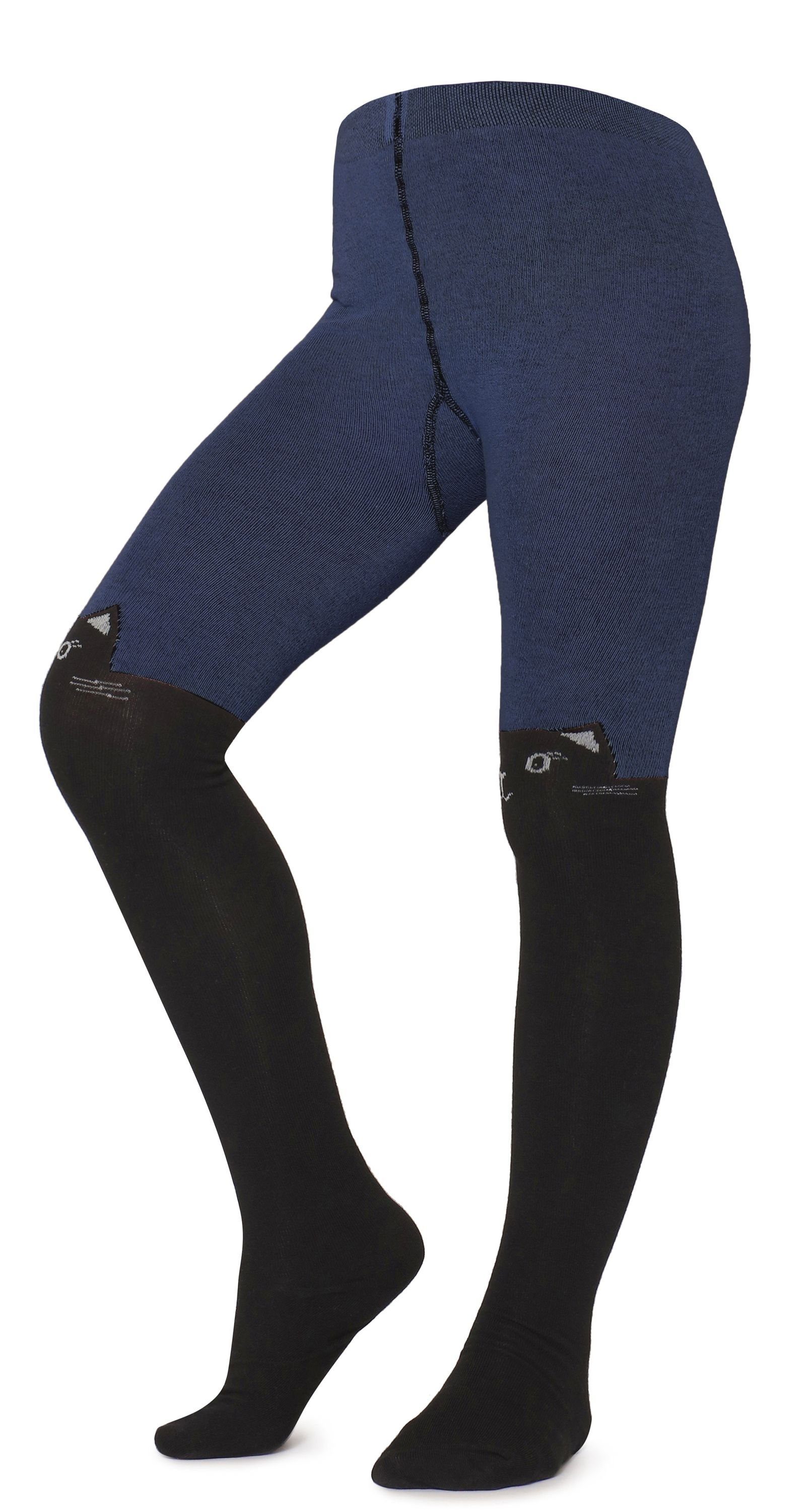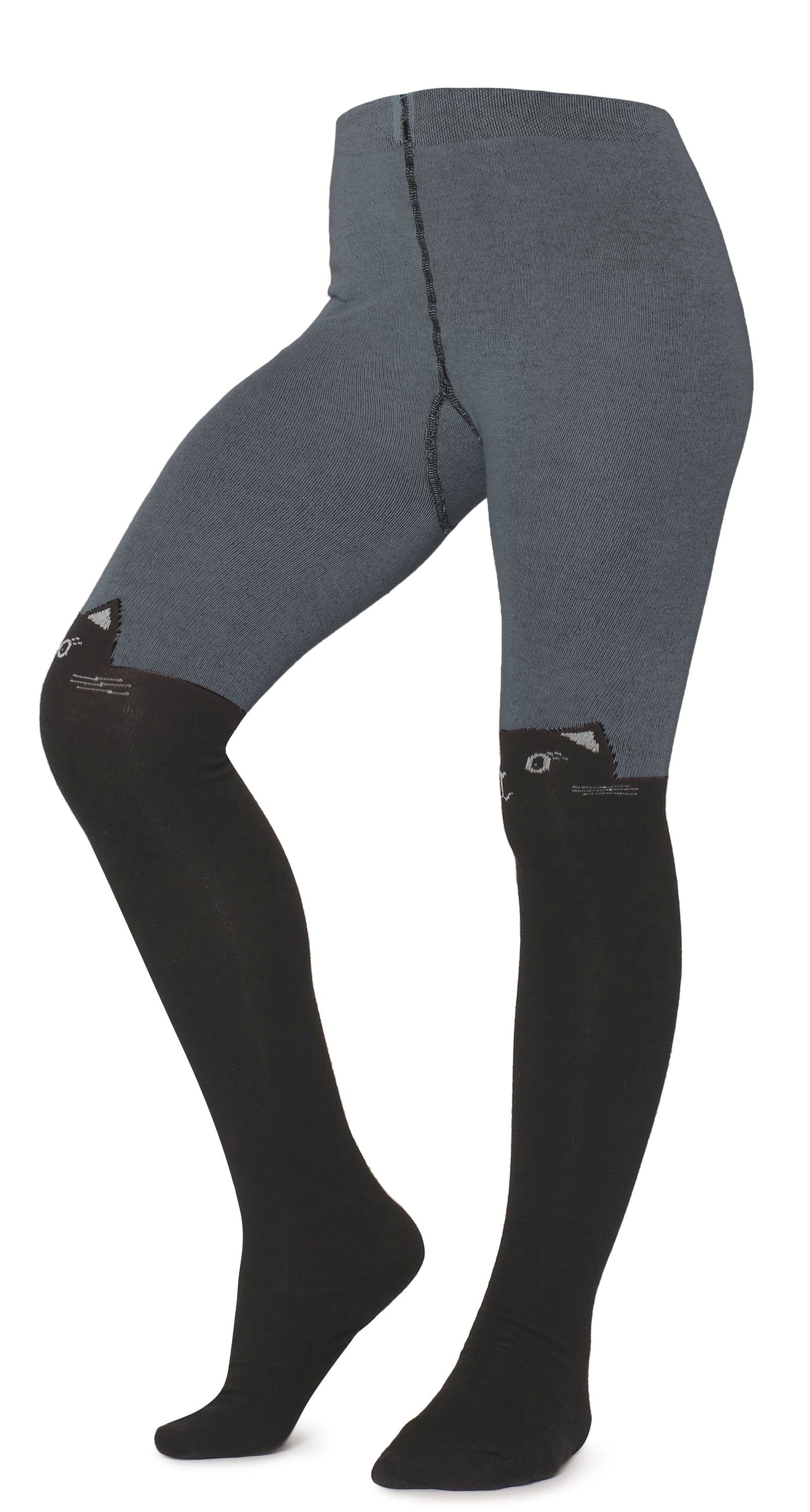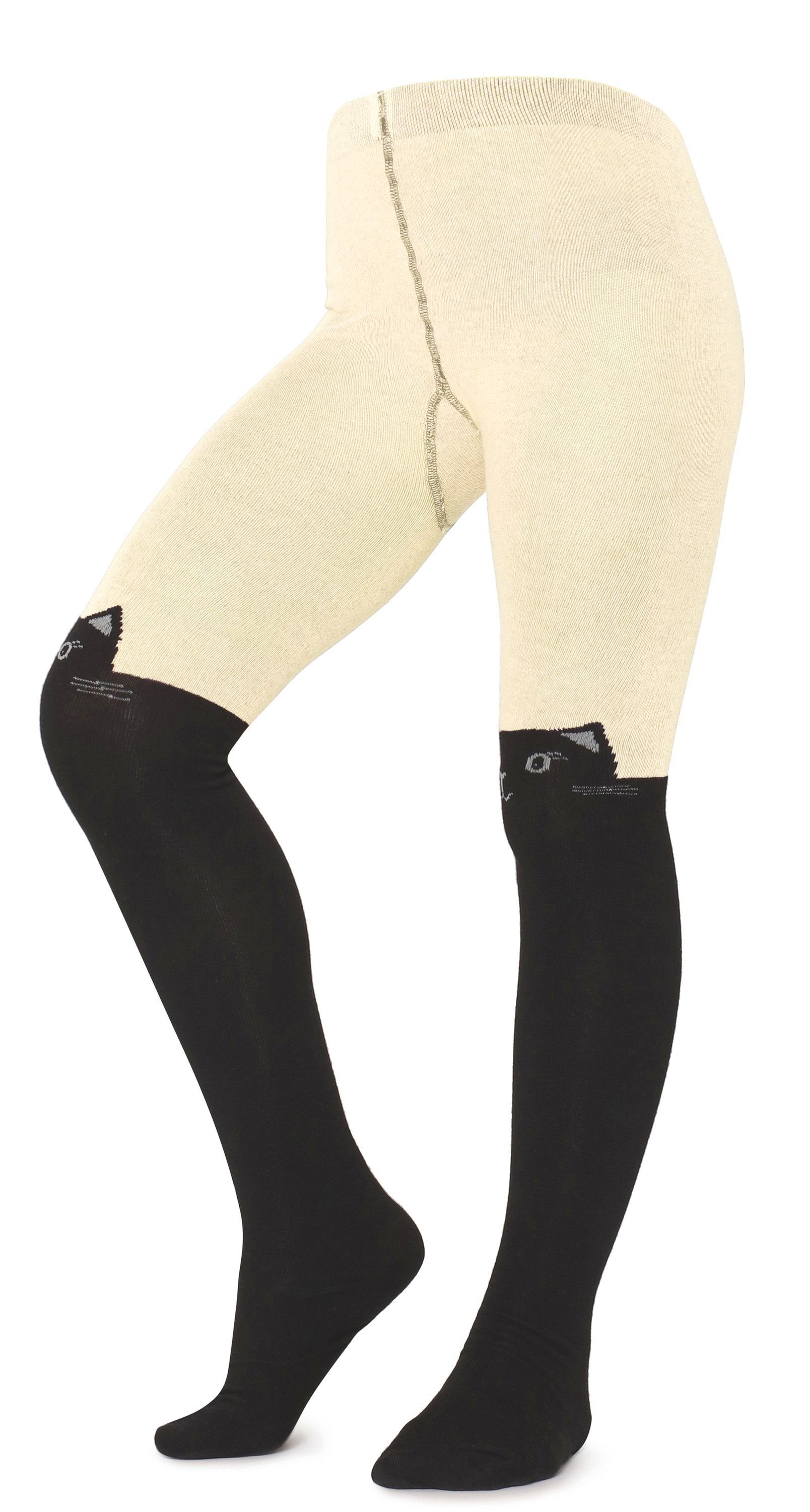 Die Strumpfhose imitiert Kniestrümpfe und hat ein niedliches Katzen-Muster.