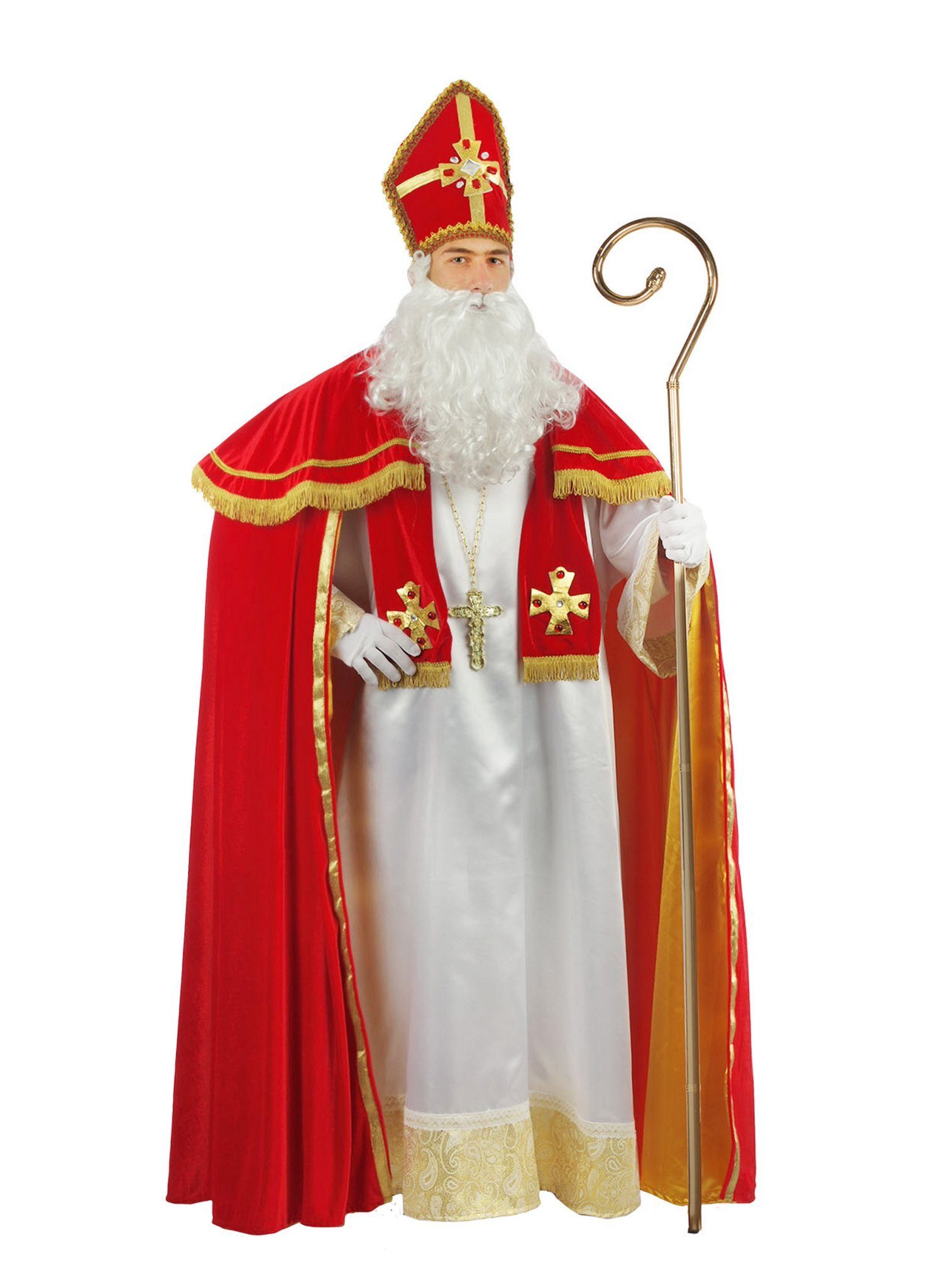Ausstattung | - Heiliger Nikolaus Kostüm vierteilig- mit Cape- mit Tunika- mit Stola- mit Mitra- ohne Bart, Handschuhe und Stab |