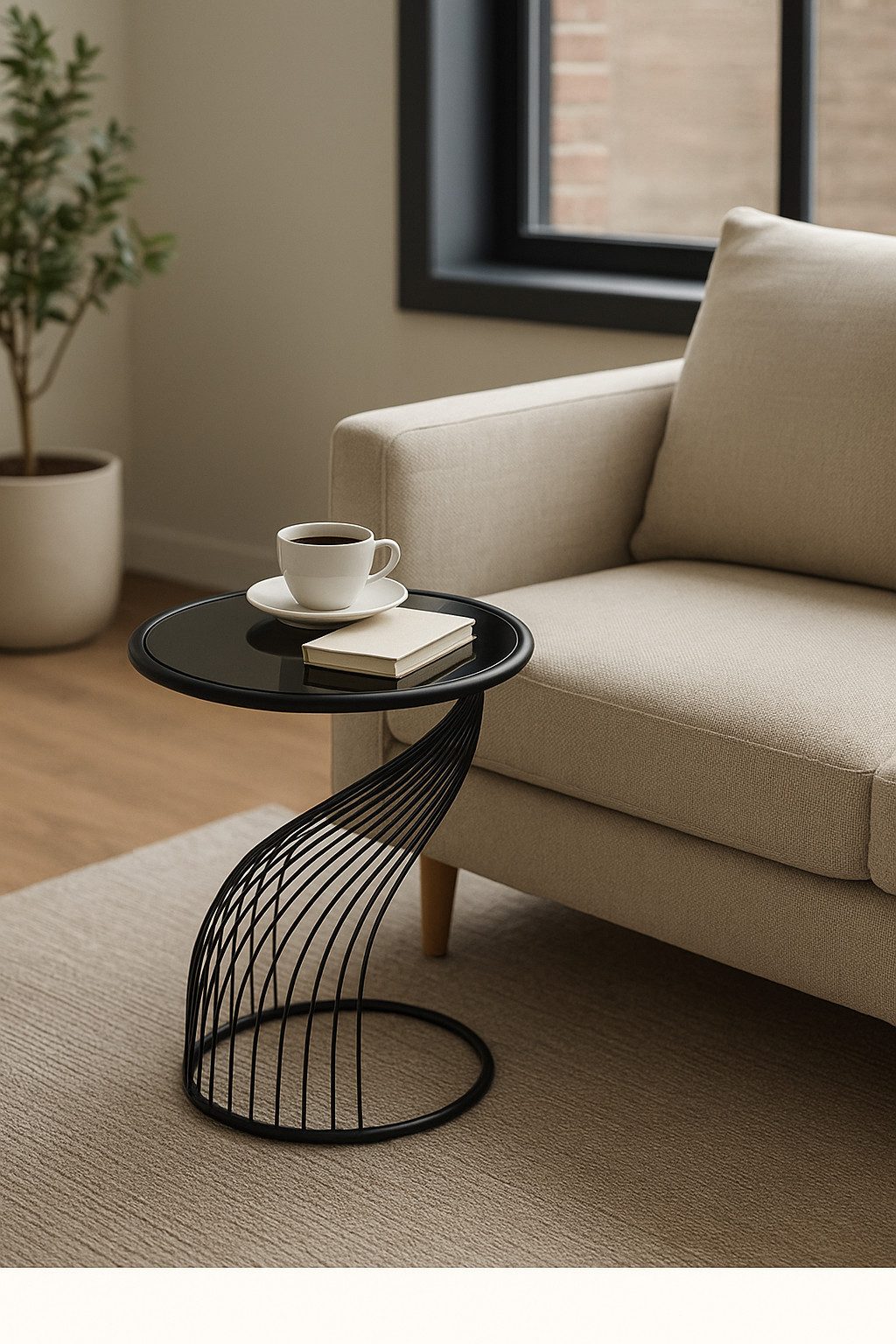 Der Beistelltisch Nova verbindet moderne Eleganz mit einem Hauch Extravaganz. Die filigrane, spiralförmige Struktur des schwarzen Metallgestells harmoniert perfekt mit der runden Glasplatte und verleiht dem Tisch eine luftige und zugleich stabile Anmutung. Nova ist nicht nur funktional, sondern auch ein echtes Design-Statement – ideal, um in Wohn- oder Schlafbereichen stilvolle Akzente zu setzen. Ob neben dem Sofa, als Nachttisch oder als dekorativer Blickfang im Flur: Nova passt sich vielseitig an und überzeugt durch seine hochwertige Verarbeitung. Eigenschaften: Material: Glasplatte mit schwarzem Metallgestell Verwendung: Ideal als Beistelltisch, Dekotisch oder Nachttisch Kategorie: Wohnaccessoires / Beistelltisch Design: Modern, rund mit außergewöhnlicher Form Farbe: Schwarz Maße: Höhe: 52,5 cm Durchmesser: 38,5 cm