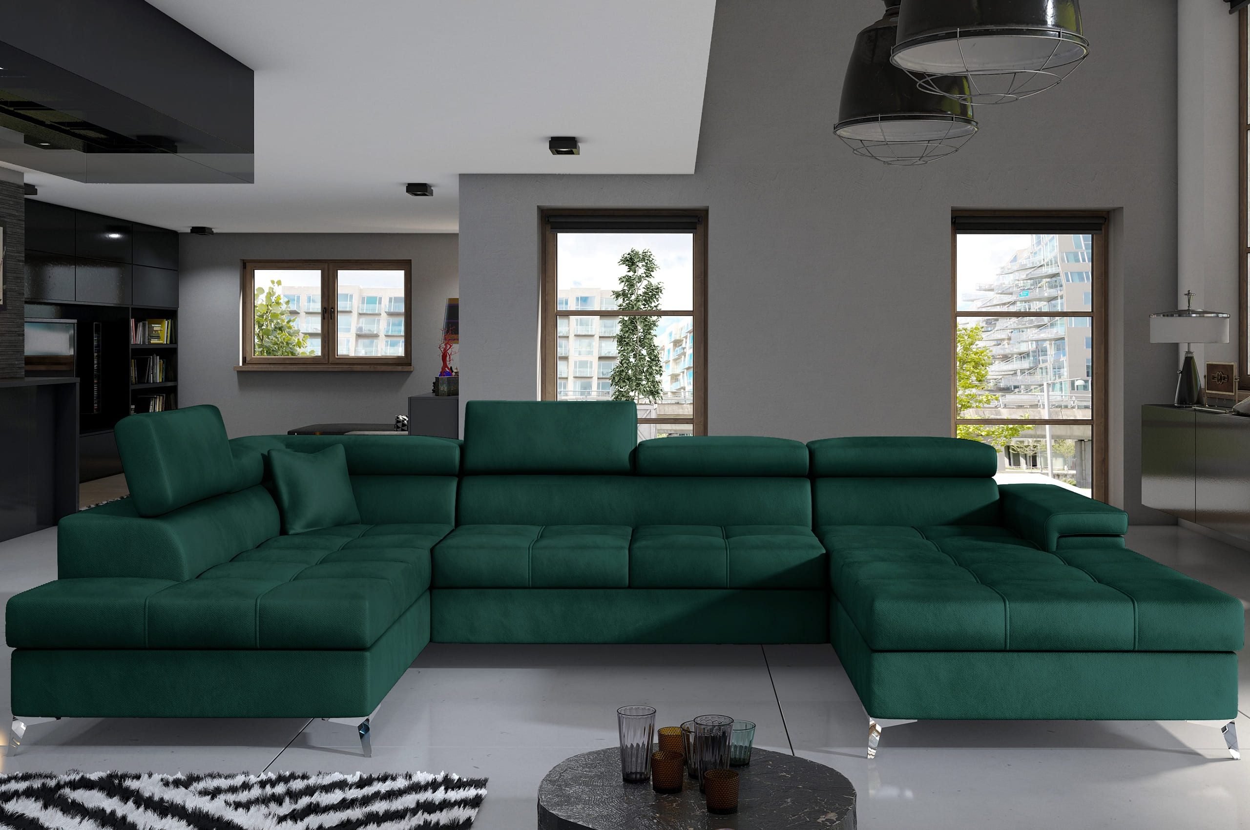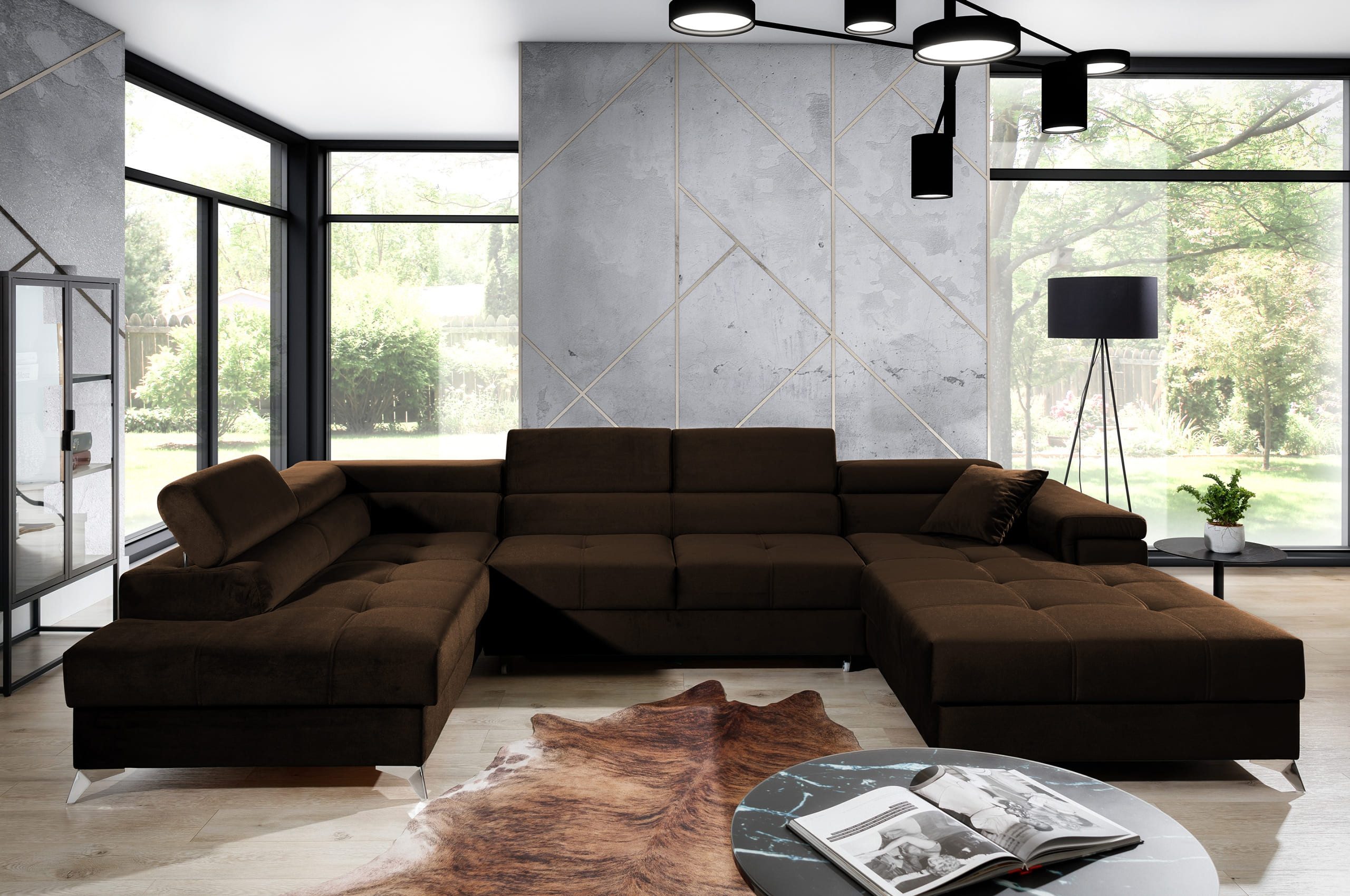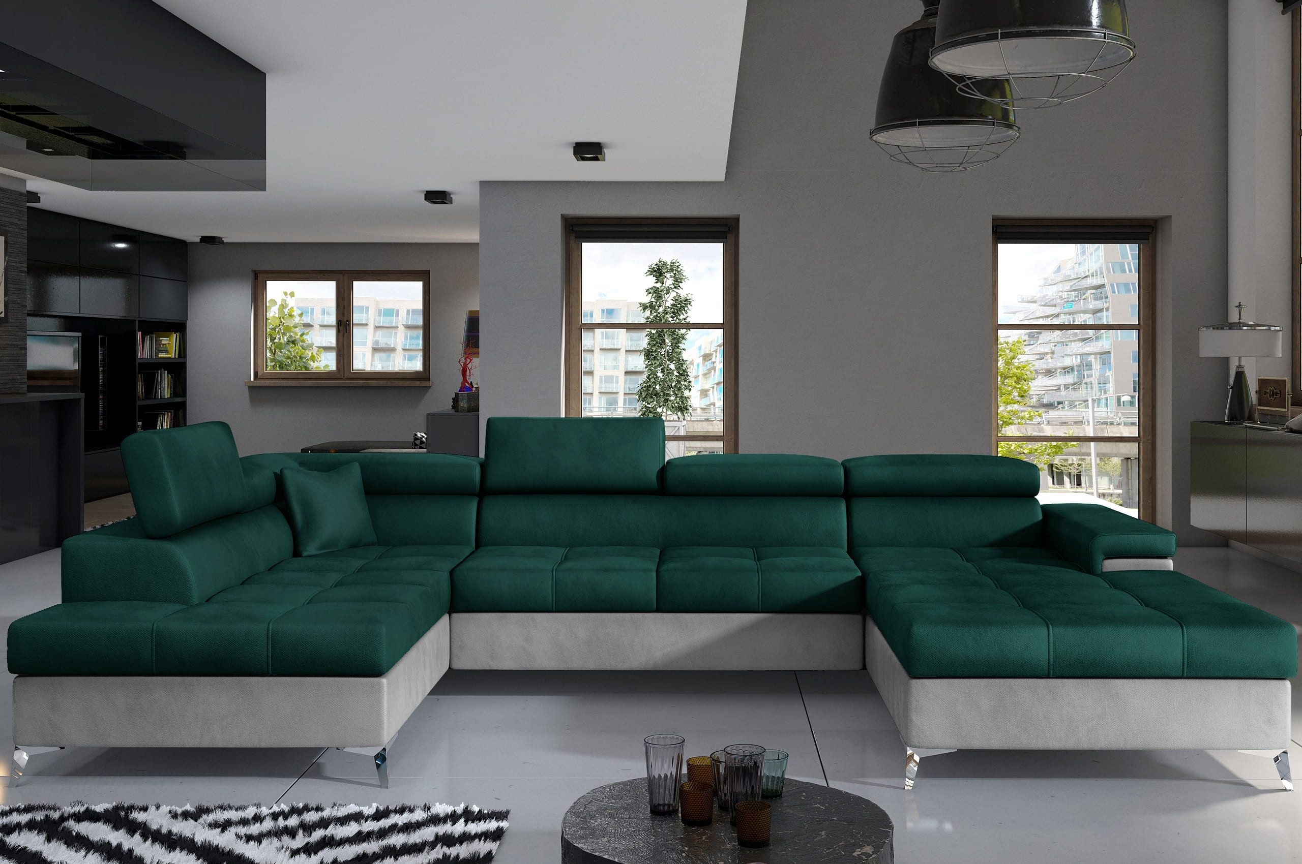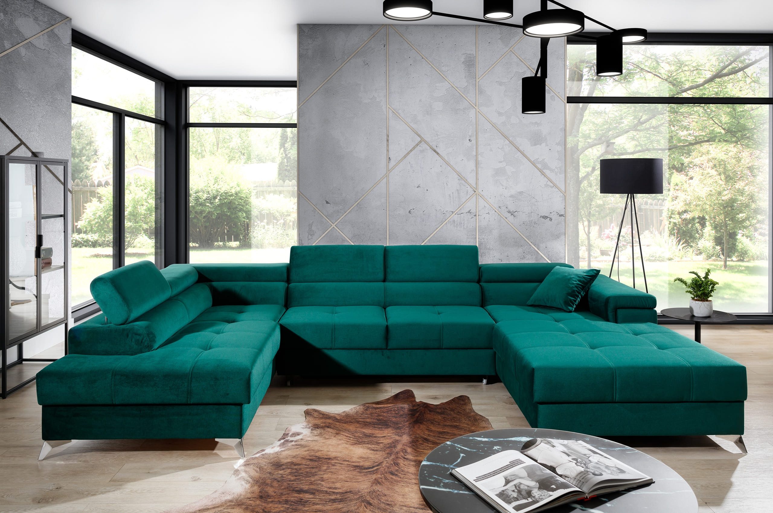 Die Wohnlandschaft Eduard von MF-Design vereint modernes Design mit luxuriösem Komfort. Durch den samtigen Veloursstoff erhält Eduard eine elegante Optik, die jedem Raum eine besondere Note verleiht. Mit einer Розмір von 337 x 205 x 88 cm bietet diese großzügige Wohnlandschaft viel Platz zum Entspannen. Die Schlaffunktion und die Liegefläche von 127 x 273 cm verwandeln das Sofa im Handumdrehen in einen bequemen Schlafplatz.