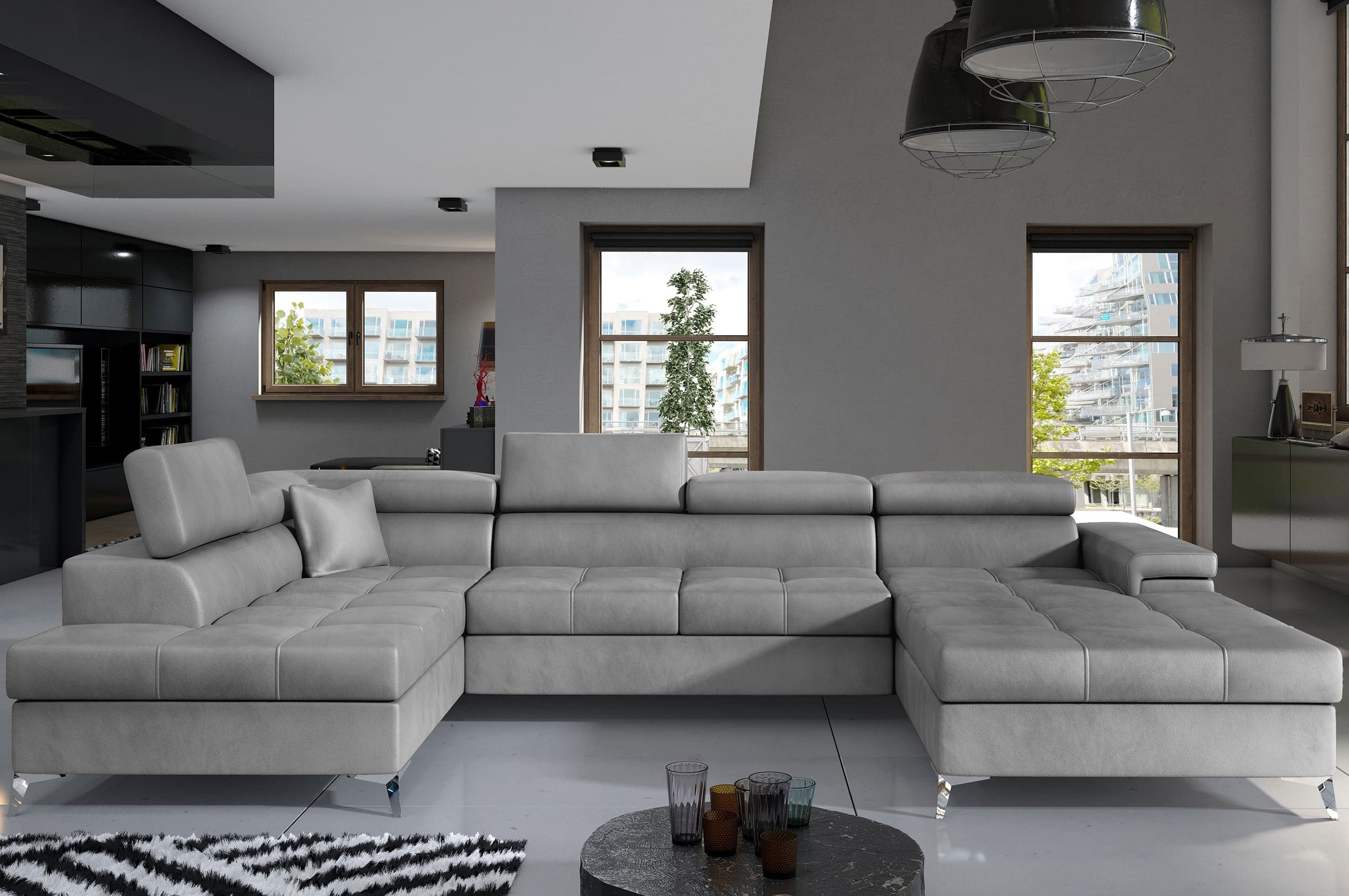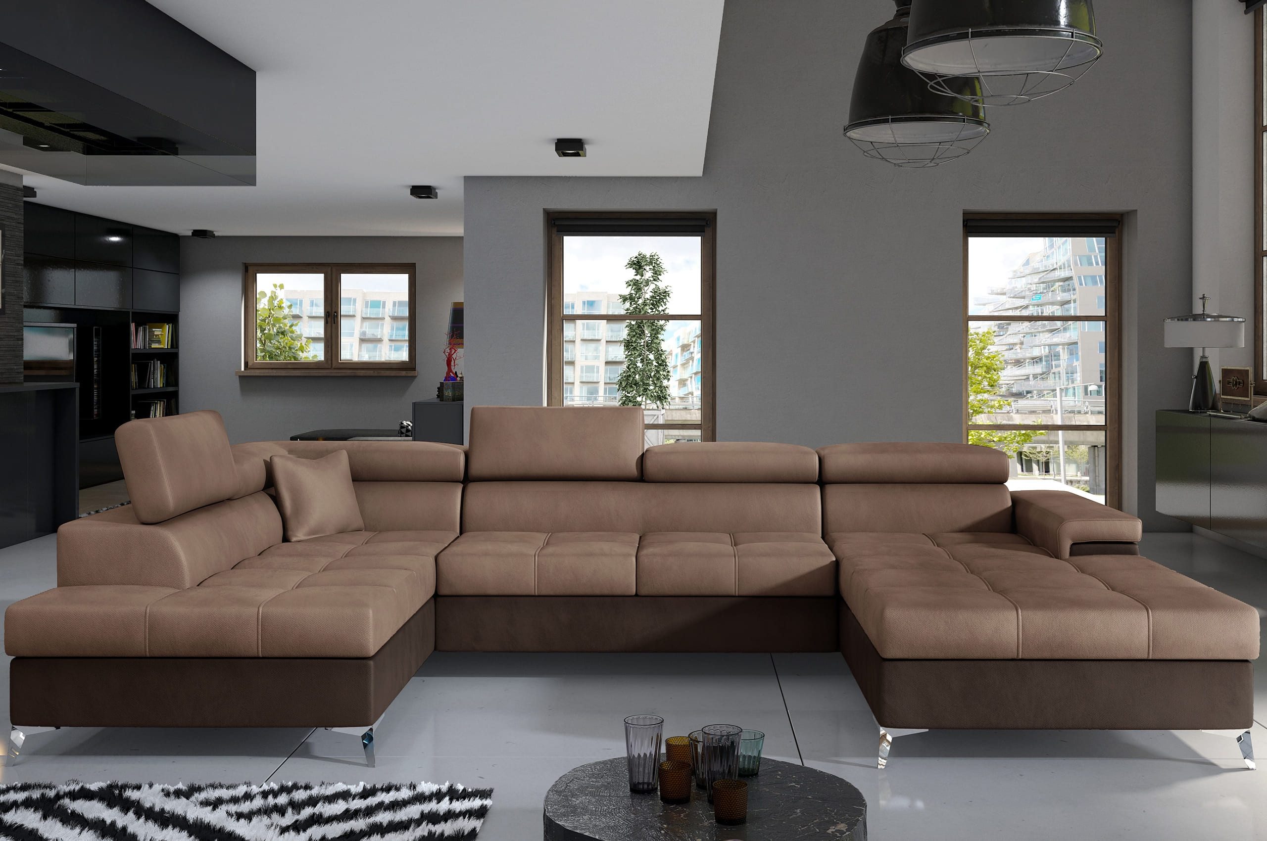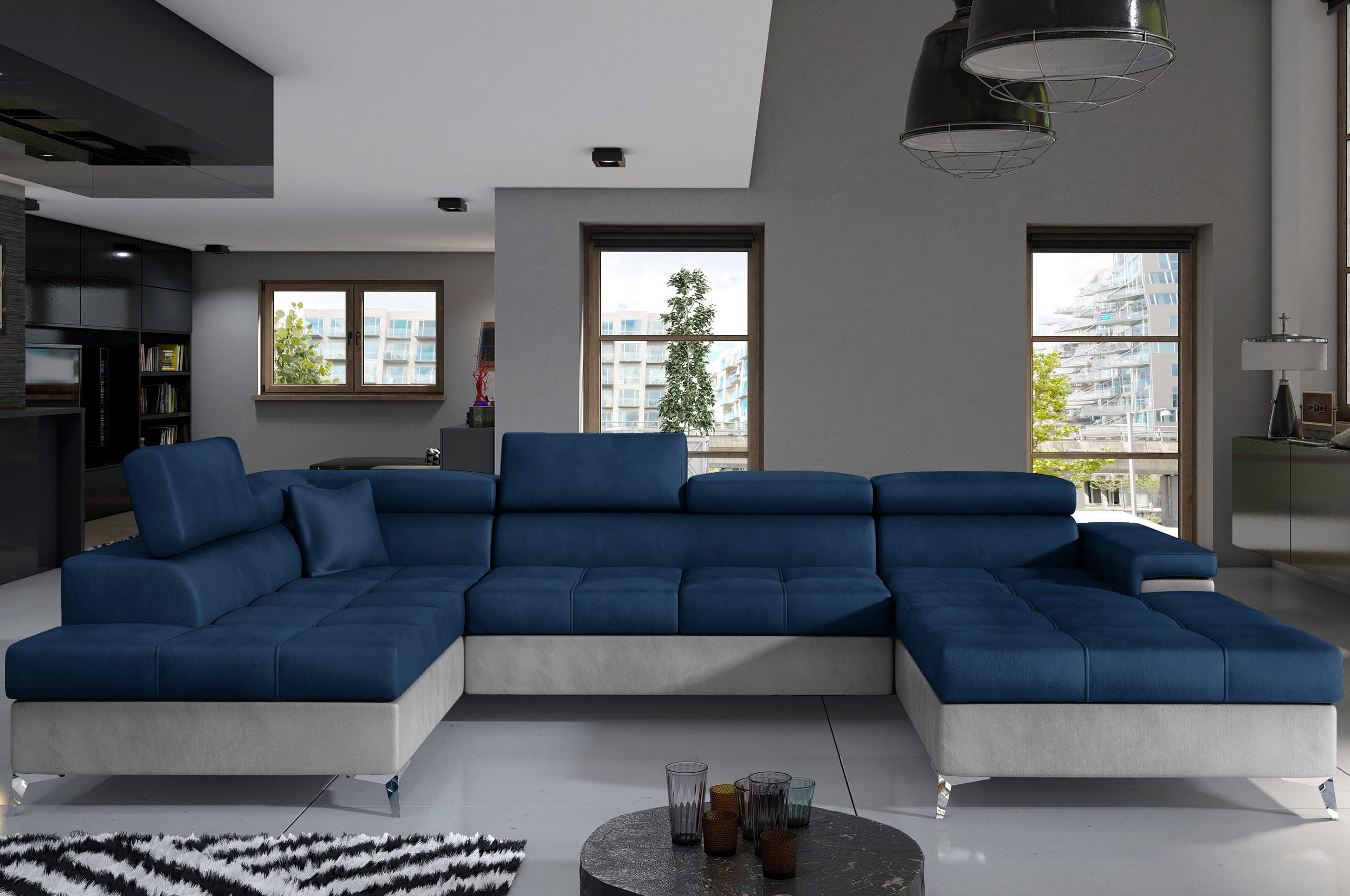 Ausgestattet mit der Dolphin-Funktion ist das Ausklappen des Schlafbereichs einfach und benutzerfreundlich. Der Bettkasten in der Ottomane schafft zusätzlichen Stauraum. Verstellbare Kopfstützen und breite Armlehnen sowie der hochwertige HR-Schaum im Sitz sorgen für hohen Komfort. Die Wohnlandschaft ist sowohl als linke als auch rechte Stellvariante verfügbar und in verschiedenen Farbkombinationen erhältlich, um Ihrem Stil gerecht zu werden.