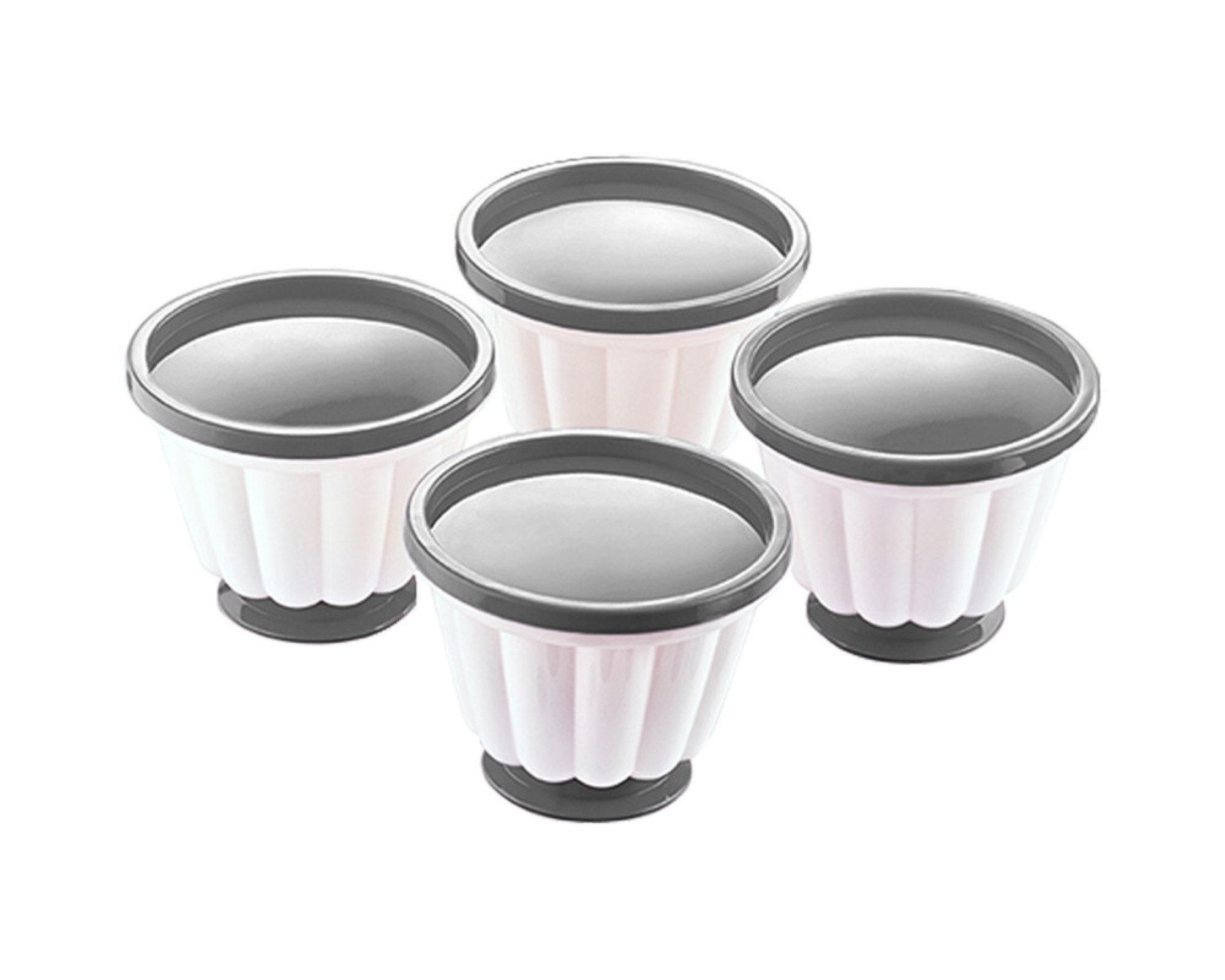 Dieses 4-teilige Puddingform-Set bietet die perfekte Grundlage für die Zubereitung kleiner, formschöner Desserts wie Puddings oder Gelees in ansprechender Gugelhupfform. Die Förmchen sind aus hochwertigem, robustem Kunststoff gefertigt und präsentieren sich in einer stilvollen Kombination aus Grau und Weiß.