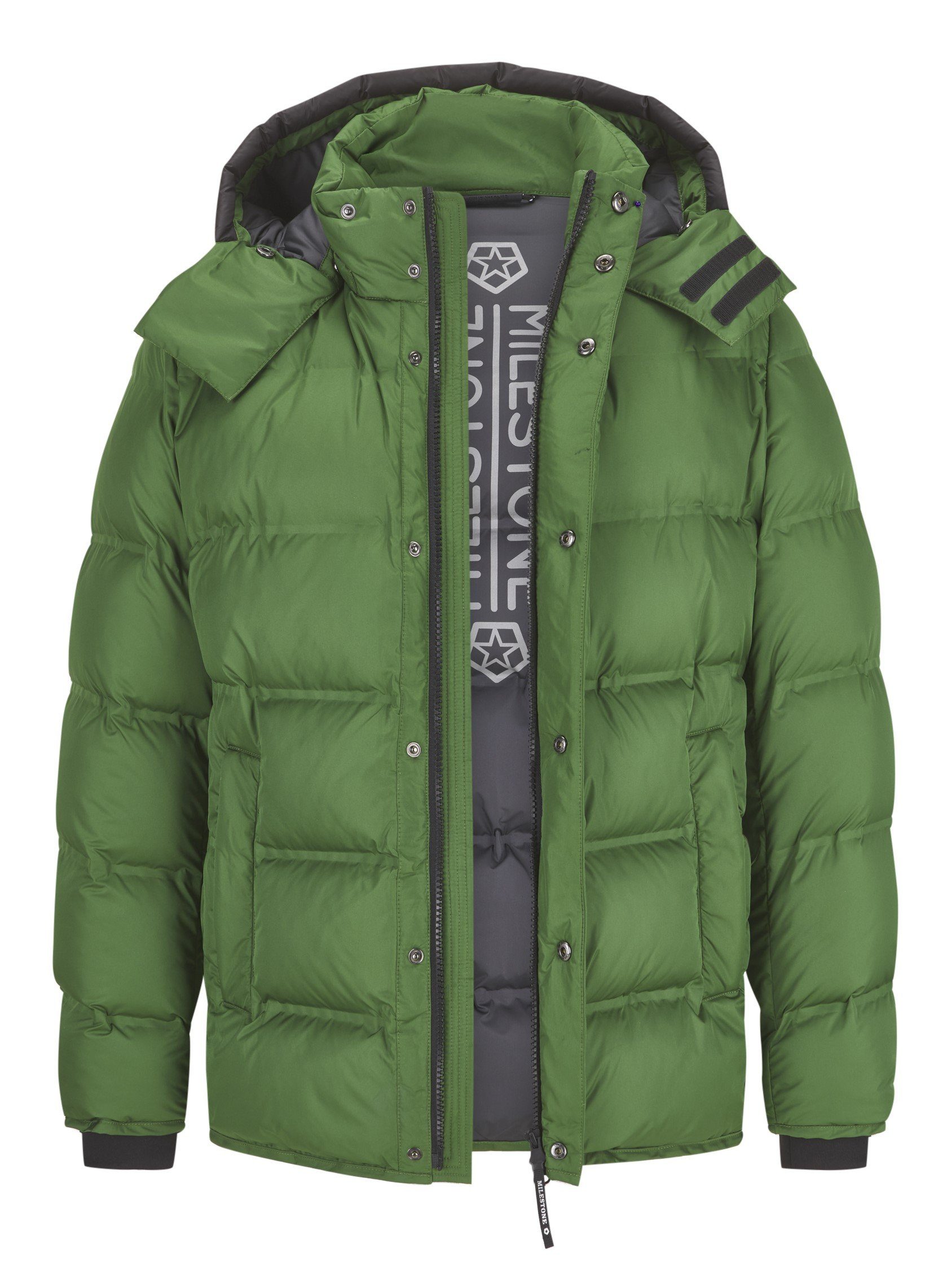 Sportive Steppjacke von Milestone in normaler Passform. Wärmender Materialmix mit einer Steppfüllung aus Daunen, Federn und Polyester, einer abnehmbaren Kapuze, einem verdecktem 2-Wege Reißverschluss mit Druckknopfleiste, paspelierten Einschubtaschen mit Zippern, Windfangbündchen und feinem unifarbenem Steppfinish. Responsible Down Standard: Der Responsible Down Standard (RDS) hat eine zu 100% tierleidfreie Daunengewinnung zum Ziel. Er definiert verbindliche Mindeststandards an das Tierwohl und stellt somit die ethisch einwandfreie Herkunft der Daunen sicher.