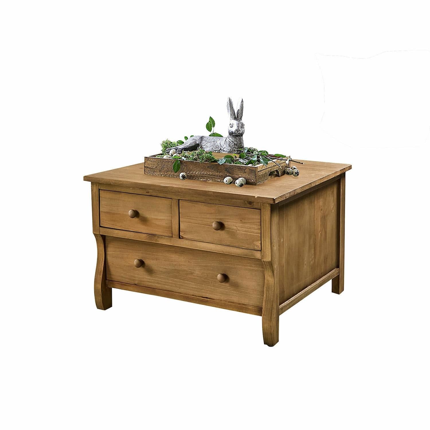 Couchtisch und Kommode in einem. Ingesamt drei Schubfächer bieten ausreichend Stauraum. Fügt sich in den Vintage-Stil perfekt ein. Eine gelungene Mischung aus Couchtisch und Kommode macht dieses Möbelstück im Landhaus-Stil so vielseitig. Denn dank der drei Schubfächer lässt sich einiges verstauen. Der Korpus ist aus massivem Kiefernholz getischlert – dazu gehören die Seiten, die in Kassetten-Manier von Holzleisten gerahmt sind und die schön geschwungenen Holzbeine, die einen festen Stand garantieren. Abgerundet wird der Tisch durch das antike Oberflächenfinish, das den typischen Shabby-Chic verleiht. Ein echtes Lieblingsstück, das ländlichen Charme mit einem Hauch Nostalgie in Ihr Wohnambiente bringt.