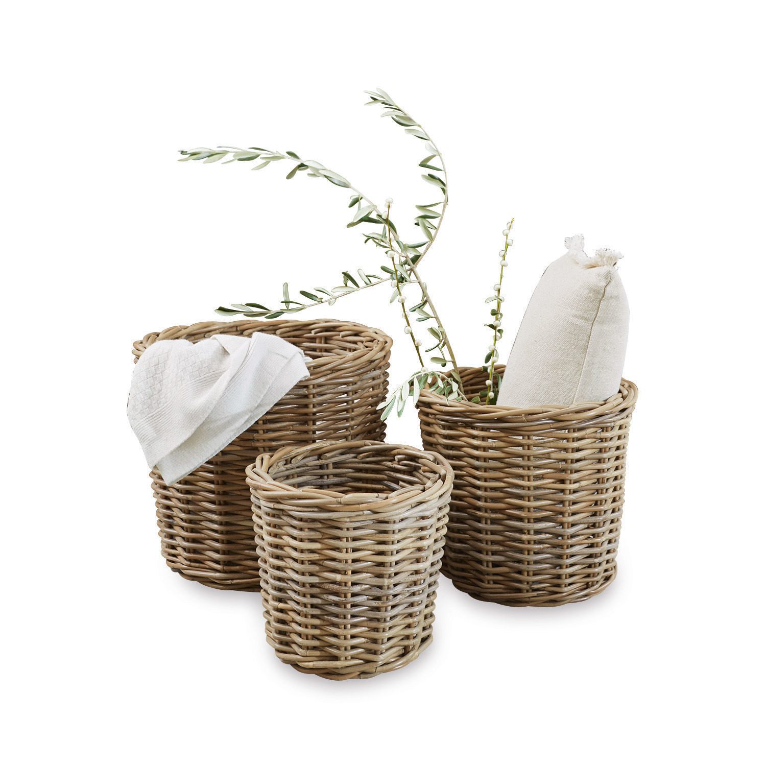 Aus Rattan handgeflochten. Drei Größen im Set. Natürliche Zierde und praktische Aufbewahrung zugleich. Der Look ist zeitlos und klassisch. Diese drei hochwertigen und attraktiven Körbe sind nicht nur eine schöne Dekoration im Landhaus-Stil, sie zaubern auch ganz leicht Ordnung in jeden Raum. Kleinere Dinge lassen sich bestens darin verwahren, und auch Obst und Gemüse könnten Sie in den Körben wunderbar in der Küche arrangieren. Die Schönheit der Natur spiegelt sich in diesem Trio, sodass es einen harmonischen Akzent zu vielen Wohnstilen setzt. Auch im Bad, am Schminktisch oder für eine Bastelecke leisten die drei wertvollen Körbe gute Dienste. Hiermit haben Sie immer alles gut sortiert zur Hand.