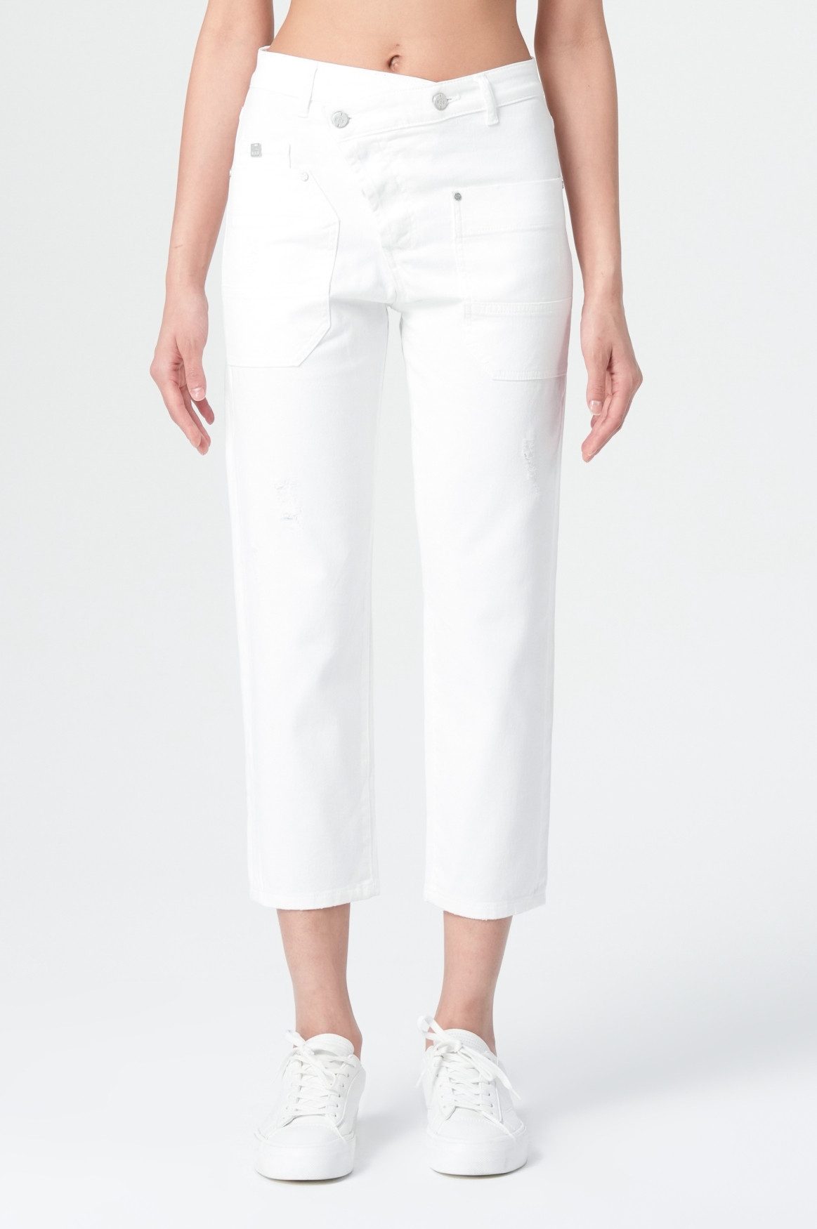 Ira Damen Boyfriend Jeans Weiß – Zeitlos elegante Cropped Jeans für den SommerDie Ira Boyfriend Jeans in strahlendem Weiß ist das perfekte Statement-Piece für deine Sommergarderobe. Aus einem hochwertigen Materialmix aus 98% Baumwolle und 2% Elastan gefertigt, bietet sie dir angenehmen Tragekomfort und optimale Bewegungsfreiheit. Die cropped Довжина endet elegant über dem Knöchel und sorgt für eine moderne Silhouette. Der Boyfriend Fit zeichnet sich durch seinen lässigen, leicht lockeren Schnitt aus, der deinem Look eine entspannte Note verleiht, ohne dabei die feminine Linie zu verlieren.Exquisite Feinheiten für deinen Sommer-StyleDiese weiße Sommer-Jeans besticht durch ihre durchdachten Designelemente. Die klassische Knopf- und Reißverschluss-Kombination vorne wird durch funktionale Gürtelschlaufen ergänzt. Praktische Fronttaschen sowie die charakteristischen Gesäßtaschen mit cleanem Design runden das zeitlose Erscheinungsbild ab. Die dezente Labelapplikation am Bund auf der Rückseite setzt einen subtilen Markenakzent. Besonders angenehm: Der leichte Stretchanteil sorgt dafür, dass sich die Hose perfekt an deine Figur anpasst, während die gerade geschnittenen Beine eine schmeichelhafte Form bieten. Kombiniere sie mit weißen Sneakern für einen monochromen Look oder setze mit farbigen Tops gekonnte Kontraste – die Ira Boyfriend Jeans ist dein vielseitiger Begleiter durch die warme Jahreszeit.
