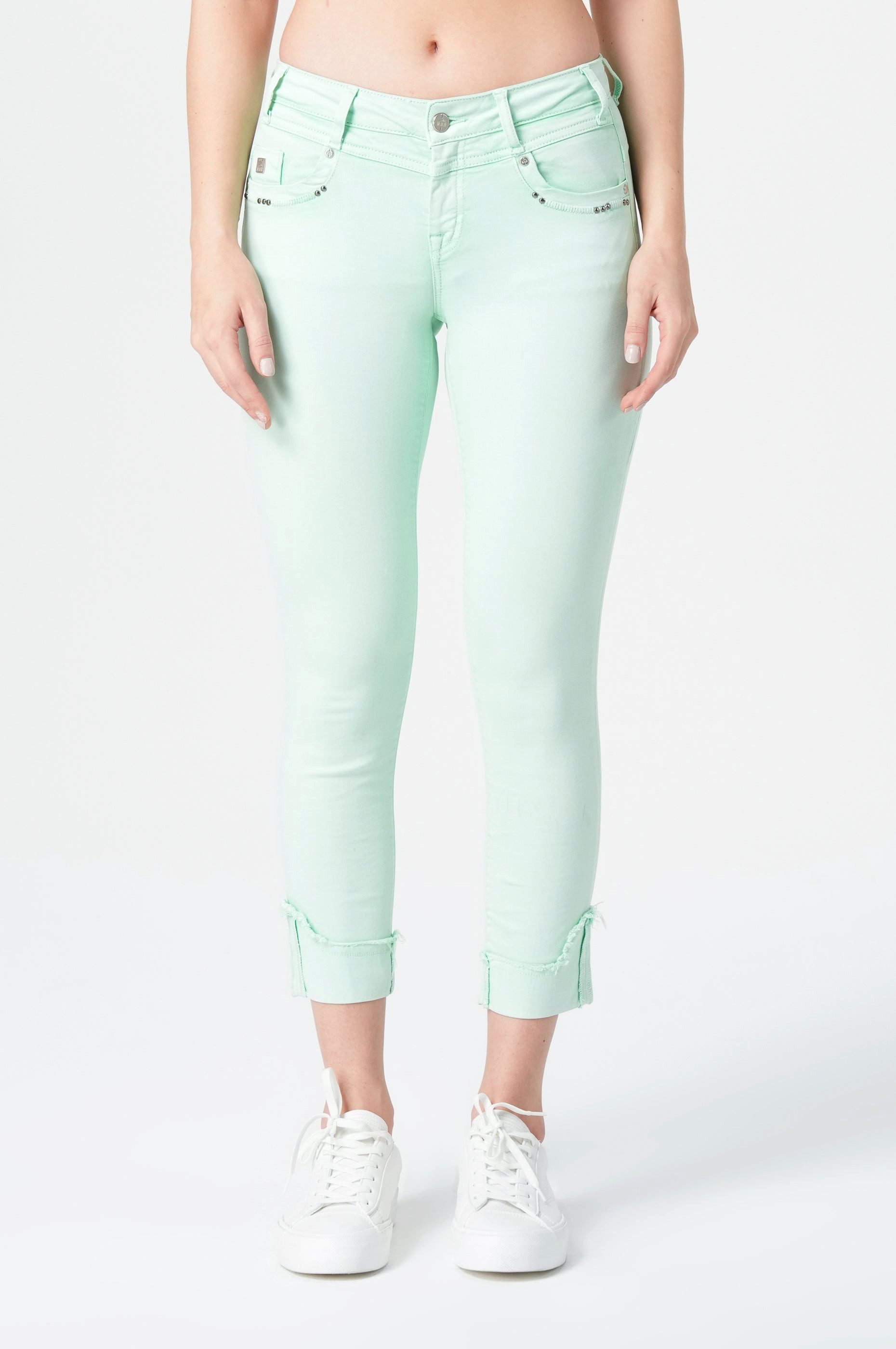 Rita Damen Regular Fit Bio‑Mint – Komfort in frischer Pastell-NuanceDie Rita Damen Regular Fit Jeans in Bio Mint bringt erfrischende Farbakzente in deine Frühjahrsgarderobe. Diese ausdrucksstarke Coloured Denim begeistert mit ihrer zarten, pastelligen Mintfarbe – der Trendton der Saison, der deinen Look sofort mit Leichtigkeit erfüllt. Die präzise Materialkomposition aus 91% Baumwolle, 6% Polyester und 3% Elasthan sorgt für perfekten Sitz mit der idealen Balance zwischen feminin-schmeichelnder Form und angenehmer Bewegungsfreiheit. Die cleane, gleichmäßige Farbgebung ohne Waschungseffekte verleiht der Jeans eine moderne, frische Ausstrahlung.Lässige Details für deinen individuellen StilDie besondere Raffinesse dieser Jeans zeigt sich in den durchdachten Details. Die 7/8-Довжина mit den charakteristischen Umschlägen betont deine Knöchel auf feminine Weise und schafft eine optimale Proportion zu Sneakers und Plateausohlen. Die dezenten Metallelemente an den Taschen setzen subtile Akzente zum soften Mintton. Der mittelhohe Bund mit seinem geraden Beinverlauf kreiert eine schmeichelhafte Silhouette, die deine Figur gekonnt in Szene setzt. Kombiniere sie mit weißen Basics für einen frischen, monochromen Look oder setze spannende Kontraste mit Marine oder Koralle. Die Rita Jeans ist der perfekte Begleiter für sonnige Tage – vom Stadtbummel bis zum Strandcafé – und bringt sofort sommerliche Lebensfreude in dein Outfit.