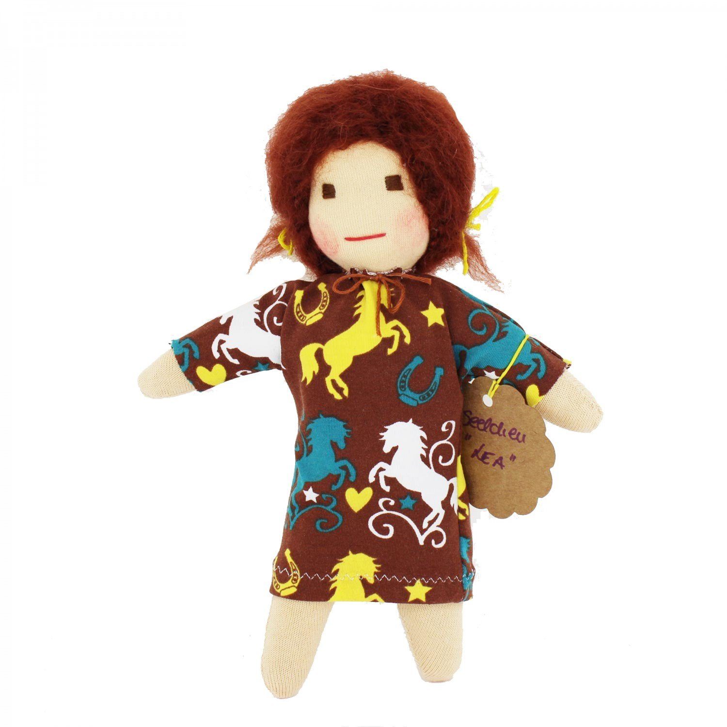 Das Seelchen ist in aufwendiger Handarbeit aus natürlichen Materialien entstanden und lädt zum Kuscheln und Spielen ein. Kopf und Körper des Seelchens sind aus Trikotstoff gemacht und mit Schafwolle gefüllt. Lea hat braune Haare, in mühevoller Häkelarbeit erschaffen und zu zwei Zöpfen gebunden. Sie trägt ein schickes Kleidchen mit Pferden, ebenfalls handgenäht, das die Mäuse an- und ausziehen können.