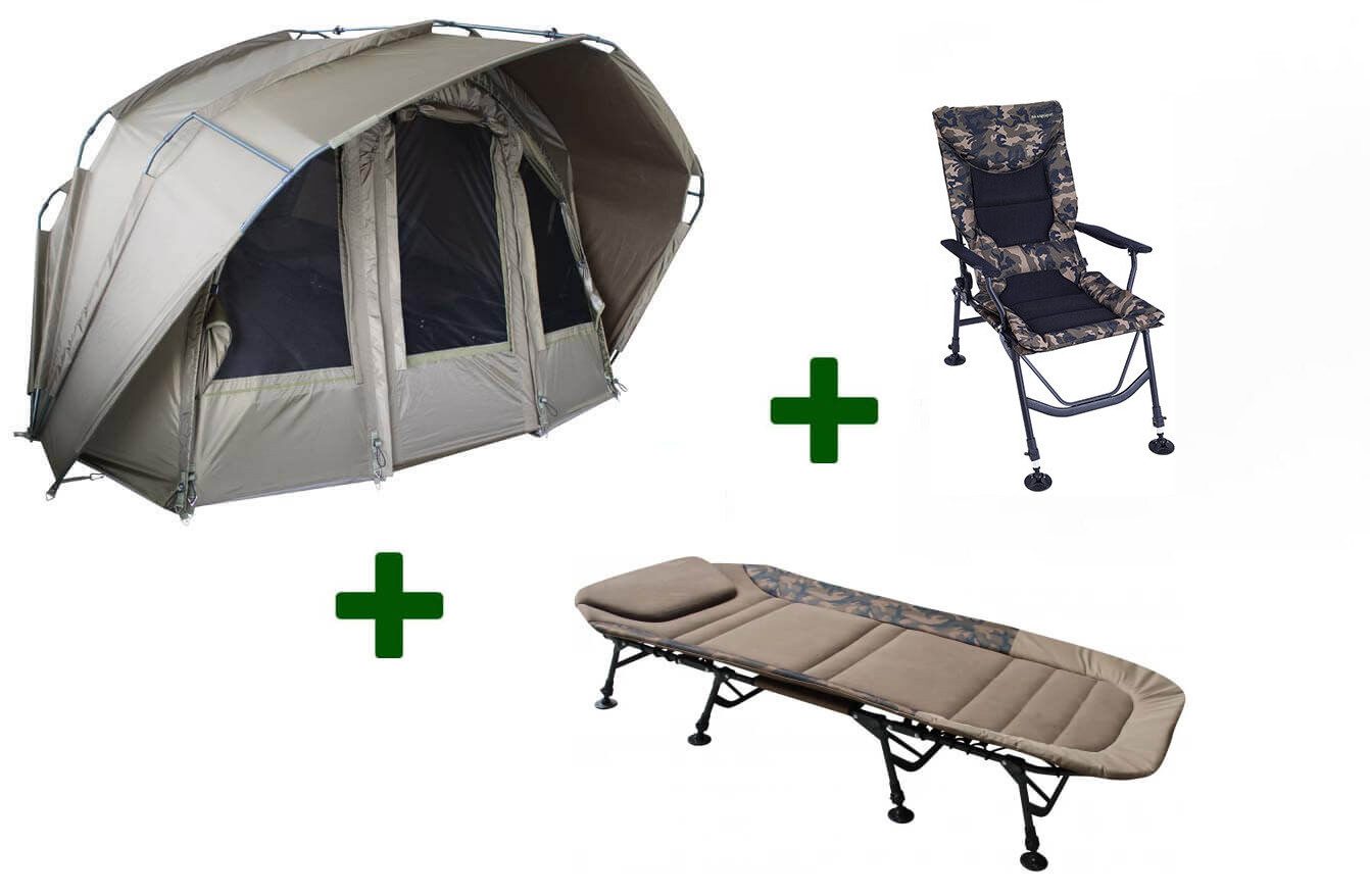 Das Starterset für ambitionierte Karpfenangler. Eins der beliebtesten 2 Mann Angelzelte und dazu das MK Fort Knox Camo 8-leg X-Flat Bedchair und den MK Kingsize Recliner Carp Chair.