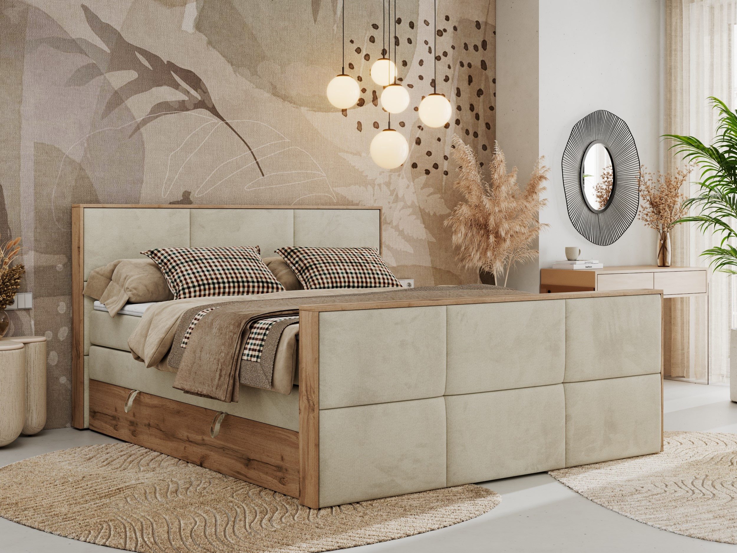 Das gepolsterte Kopfteil und der gepolsterte Fußteil verleihen dem Stauraumbett einen edlen Look und sorgen für zusätzlichen Komfort. Dekorative Steppungen und Ziernähte setzen stilvolle Akzente und unterstreichen das exklusive Design. Dekorative Elemente aus hochwertigsten Möbelplatten garantieren Stabilität, Langlebigkeit, aber auch Eleganz. Das Boxspringbett mit Matratze verfügt über eine Möbelplattenverarbeitung am Bettkästen und am Kopfteil. Die Farbe der Möbelplatte am Bettrahmen und Kopfteil ist Wotan Eiche.