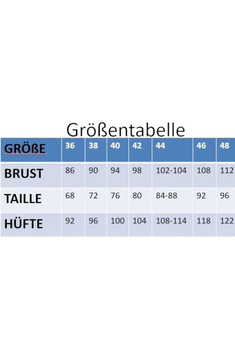 Maße des Produkts auf dem Bild: Größe: 38, Brustumfang: 92 cm, Taille: 72 cm, Hüfte: 100cm, Vorderlänge: 155 cm
