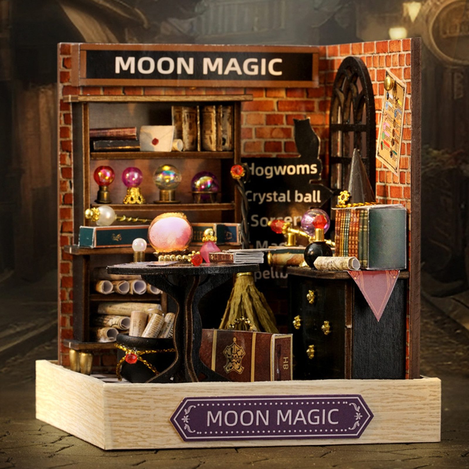 Präzise gelaserte Holzteile, Miniaturmöbel, Stoffe, Kunststoffdetails, Metallbeschläge, LED-Lichtset, nummerierte Teile und eine bebilderte Anleitung.