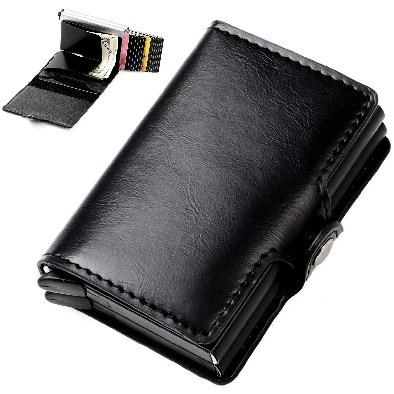 Innovatives Schiebesystem: Mit nur einem Hebeldruck gleiten die Karten einzeln aus dem Etui, sodass Sie Ihre gewünschte Karte mühelos finden können.