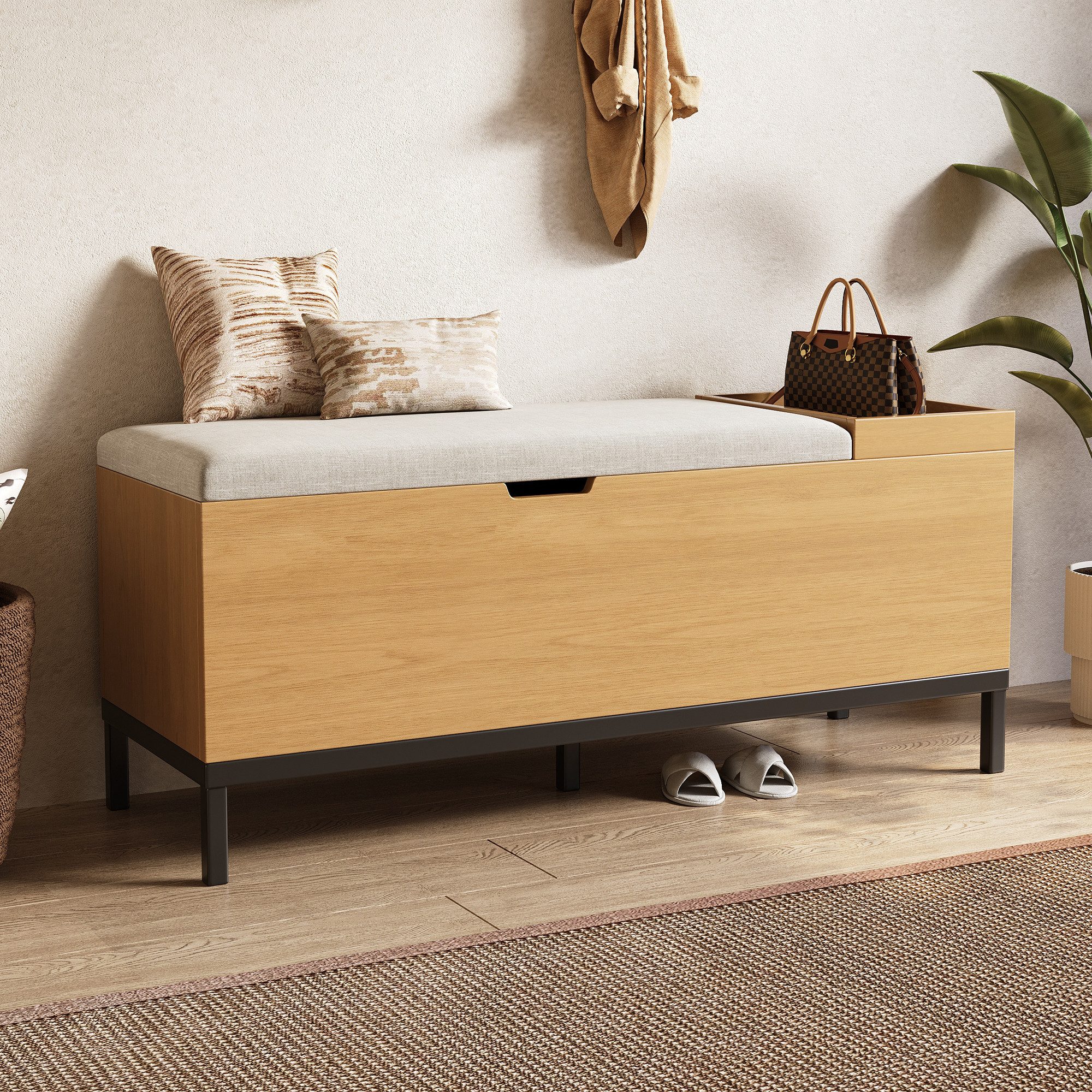 Die Schuhbank besticht durch eine natürliche Holzmaserung kombiniert mit einem hellgrauen Stoffbezug, der sich harmonisch in Flur, Wohnzimmer oder Schlafzimmer einfügt. Dieses zeitlose Design ergänzt jede Einrichtung.