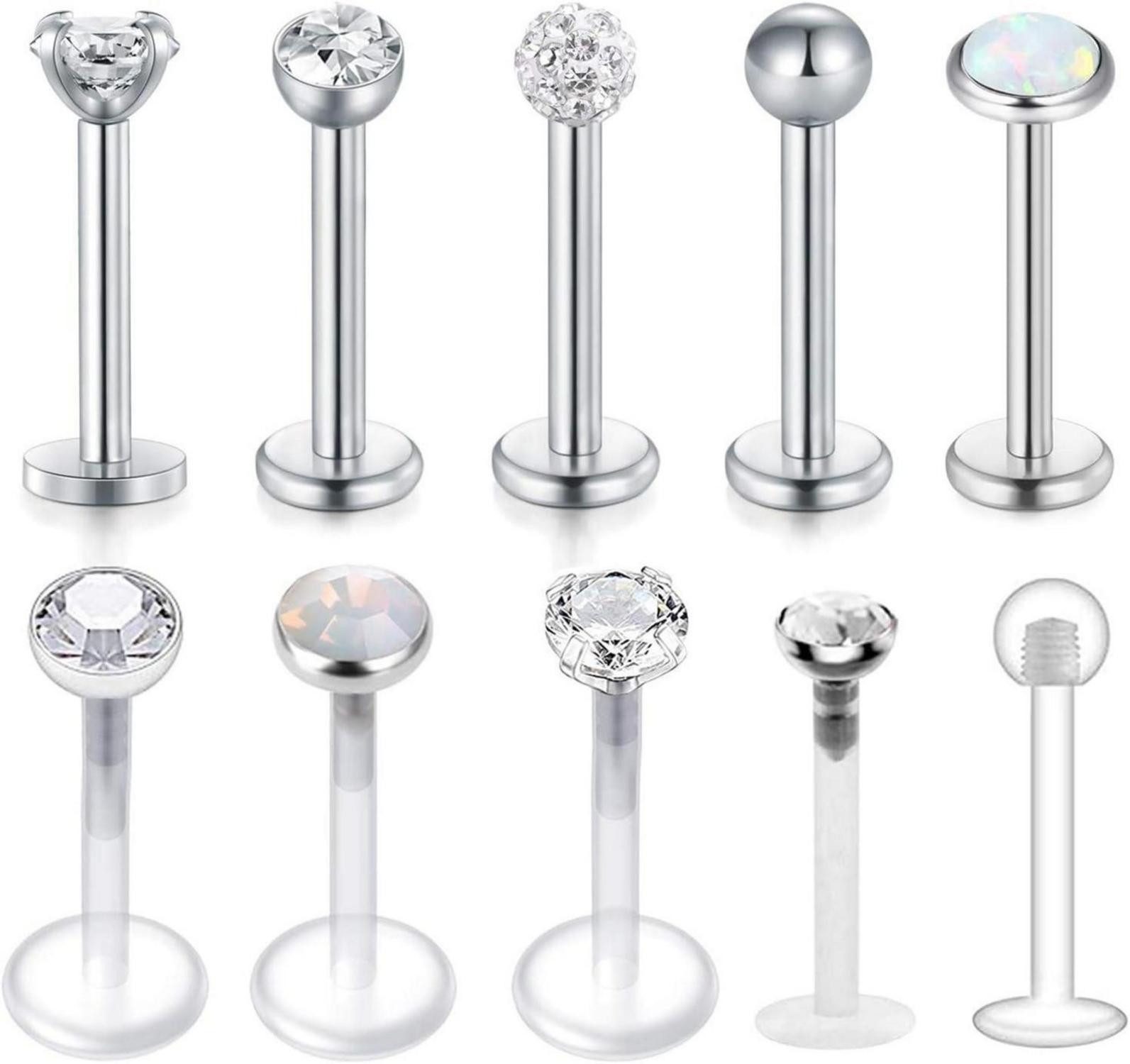 Hochwertiges Lippen- und Ohrpiercing von MODRSA. Dieses Piercing ist vielseitig einsetzbar und kann sowohl als Lippen- oder Ohrstecker, Tragus, Helix oder Conch Piercing getragen werden. Das durchsichtige Acryl in Kombination mit dem Chirurgenstahl verleiht dem Piercing eine stilvolle und moderne Optik. Jedes Paket enthält 10 Stück und kommt mit einem kostenlosen Geschenk Samtbeutel.