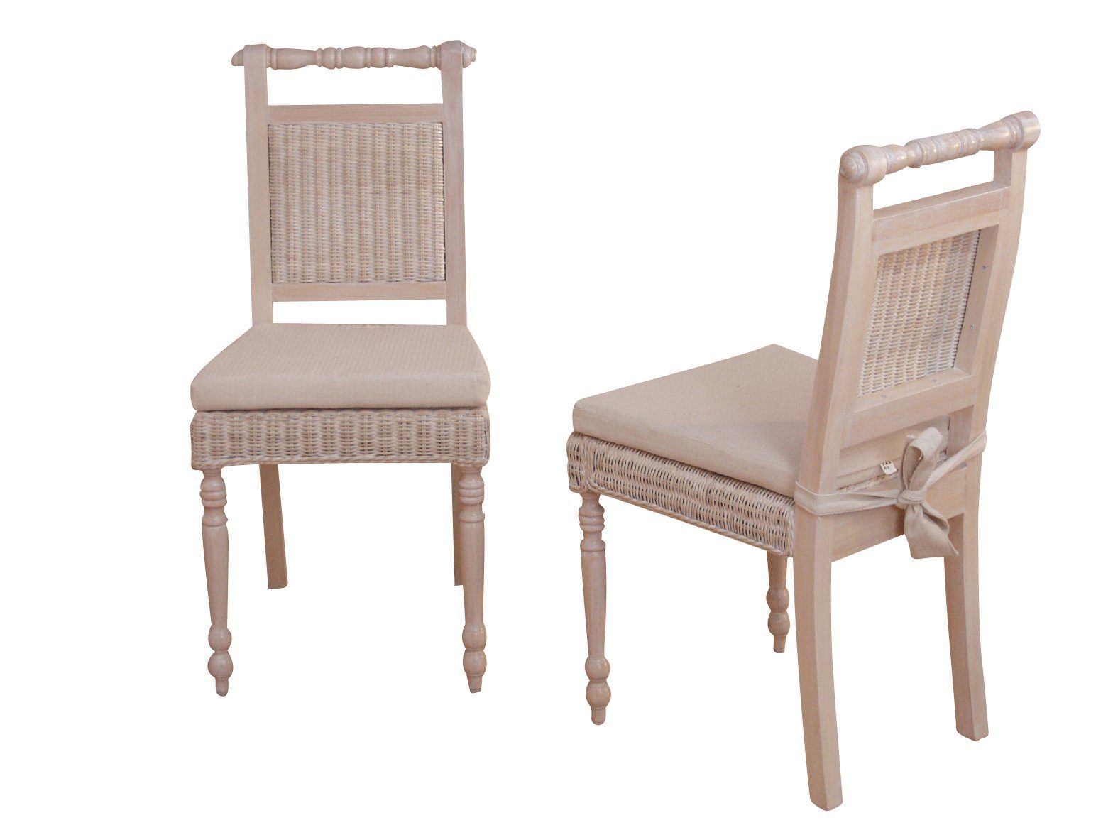 Schöner Rattanstuhl mit gedrechselten Beinen und gedrechselter Griffleiste im Rücken aus Massivholz Pinie, wahlweise lieferbar in drei Farben, gebeizt und lackiert. Sitz und Rücken sind mit Rattangeflecht, handgeflochten, ebenfalls farbig gebeizt und lackiert. Inklusive schaumstoffgepolstertem Sitzkissen, mit einem vanille-cremefarbenen Stoffbezug (100% Polyester), mit praktischen Befestigungsbändern. Dieser stilvolle Rattanstuhl im 2er-Set lässt sich mit einer Vielzahl von Tischen kombinieren und ist ein Blickfang im Essbereich. Maße ca. cm: B/H/T 46/96/54. Sitzhöhe ca. 47 cm. Lieferung erfolgt flach verpackt im Paket mit Aufbauanleitung.