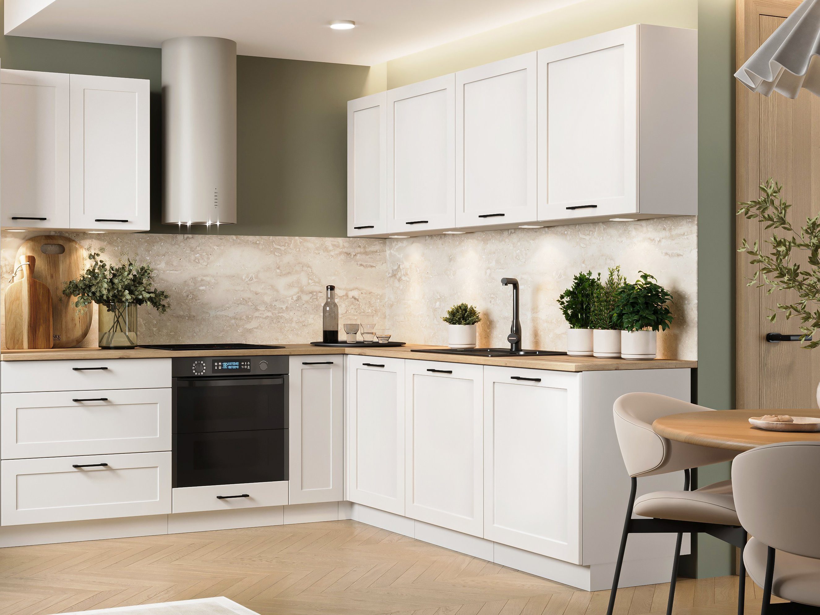 Die Küchenkollektion Adele vereint klassischen Landhausstil mit modernen Elementen. Angeboten mit Rahmenfronten in Mattweiß und schwarzen Metallgriffen, bietet sie zeitlose Eleganz für jede Küche.