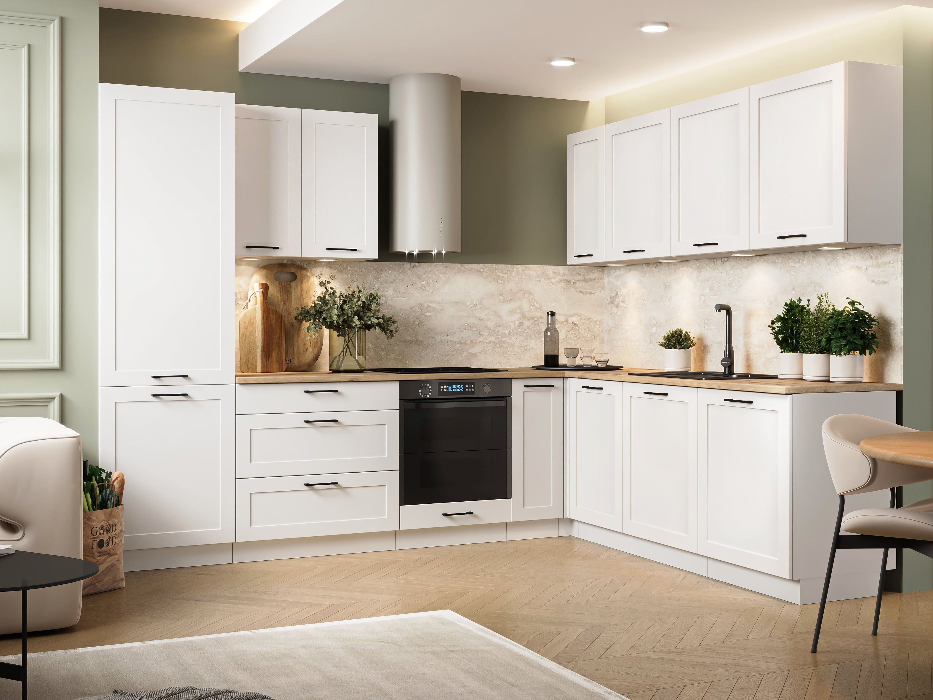 Die Küchenkollektion Adele vereint klassischen Landhausstil mit modernen Elementen. Angeboten mit Rahmenfronten in Mattweiß und schwarzen Metallgriffen, bietet sie zeitlose Eleganz für jede Küche.