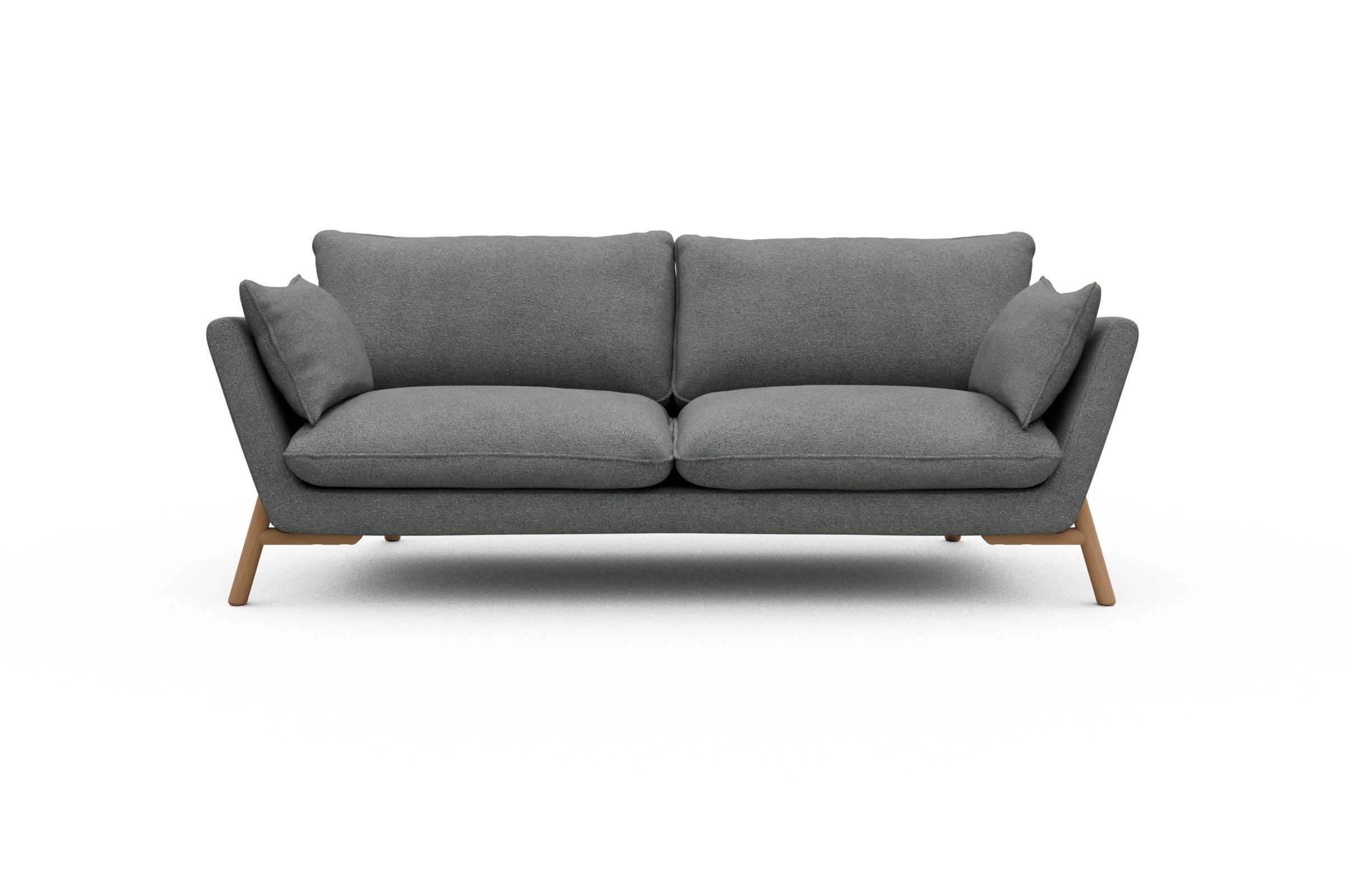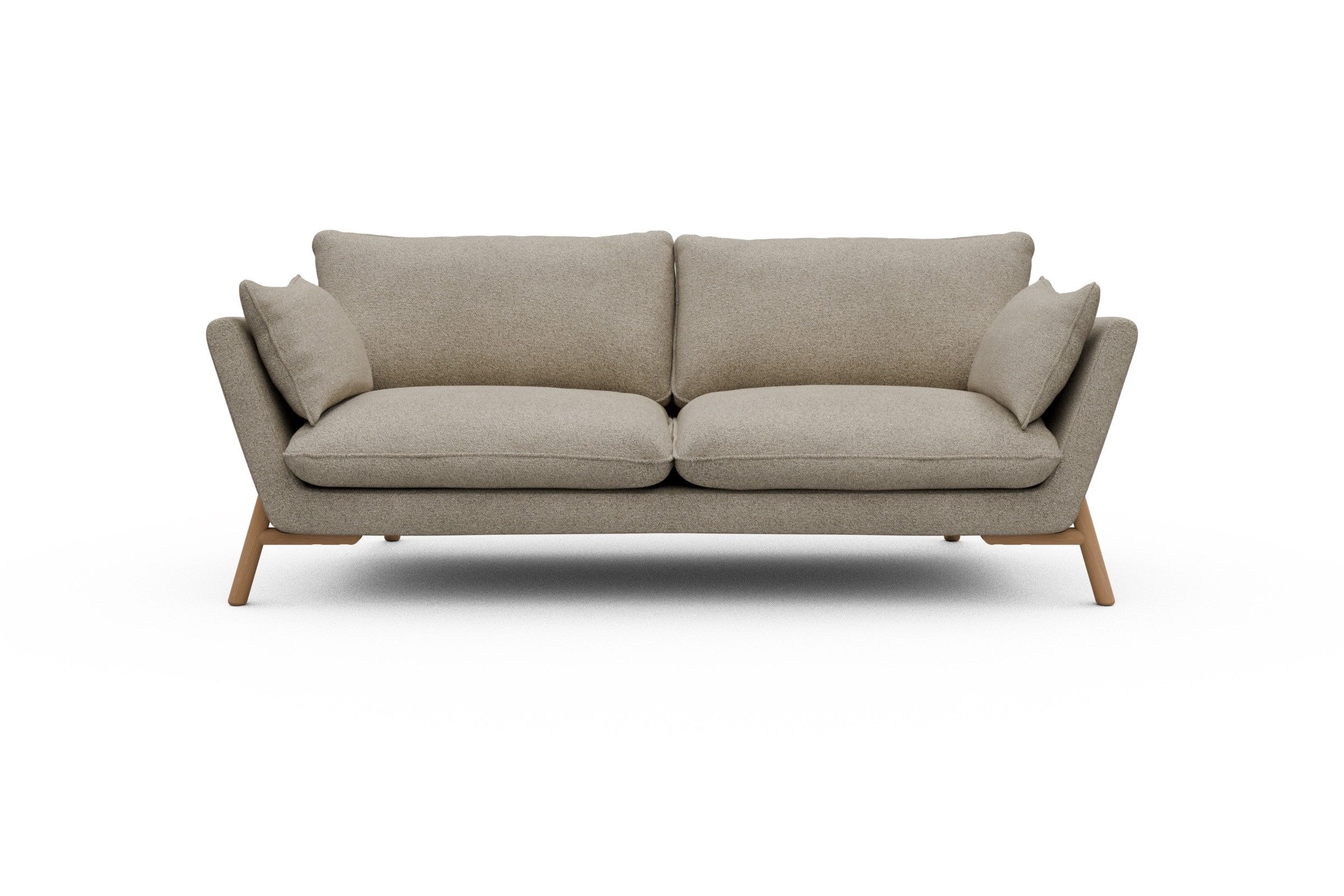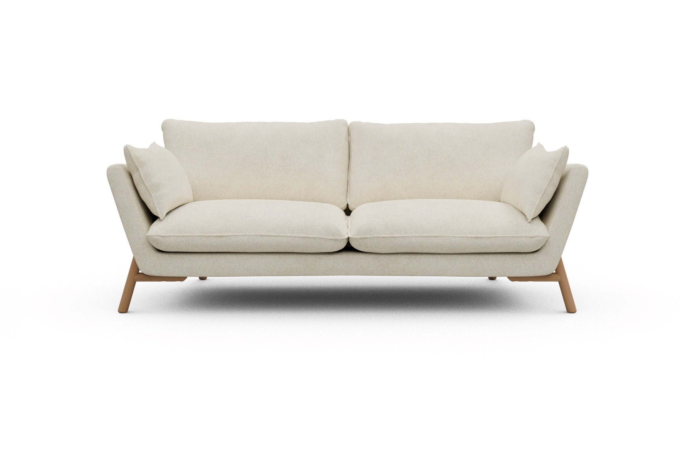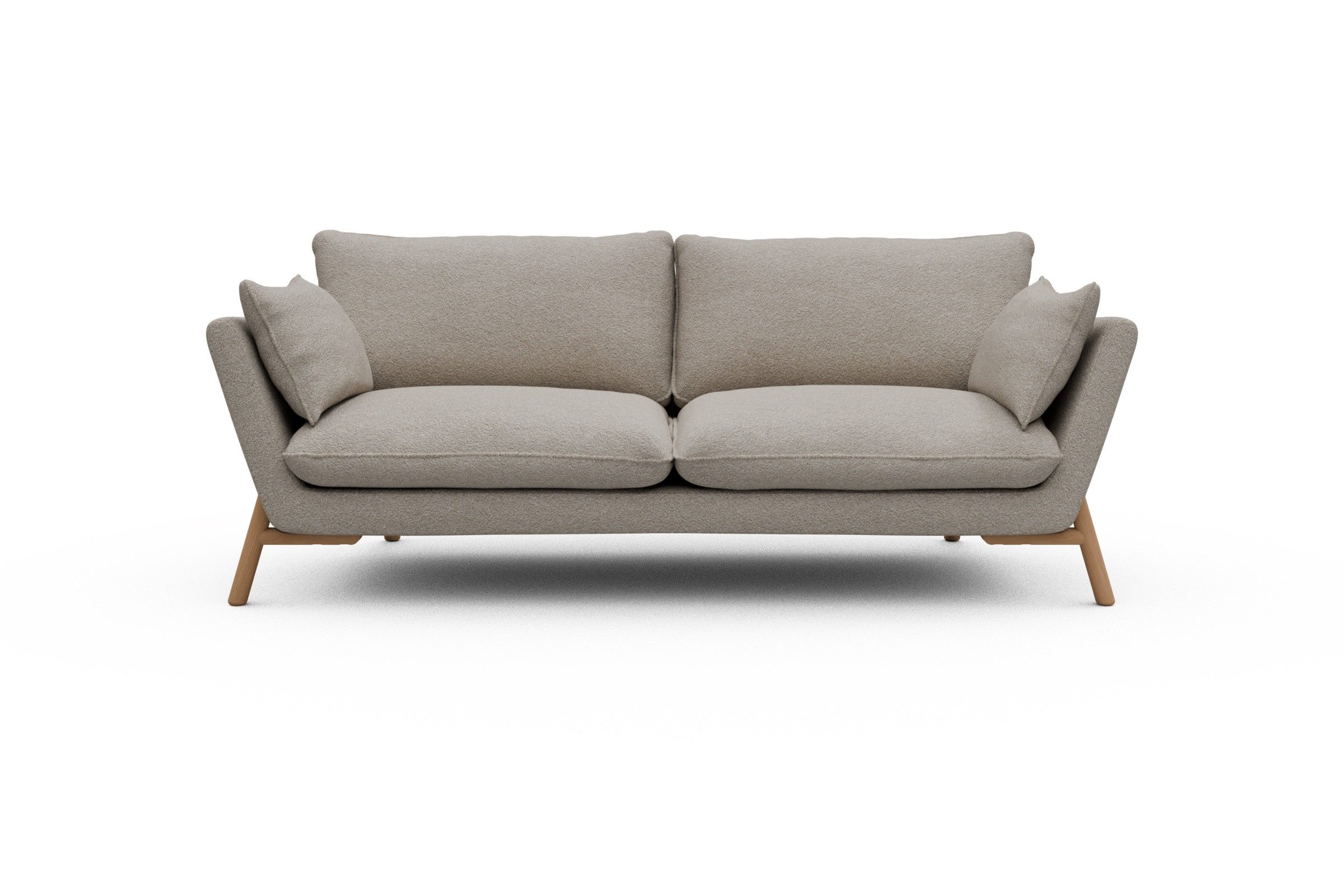 Die lackierten Eichenfüße in Natur setzen einen warmen Kontrast zum Bouclé-Stoff und sorgen für skandinavische Leichtigkeit. Stabilität? Check. Denn das Untergestell aus Massivholz mit Metallunterstützung bringt eine Extraportion Langlebigkeit mit. Und ja, Emil wurde in Europa handgefertigt – mit viel Liebe zum Detail und ganz ohne Möbel-Massenware-Vibes.