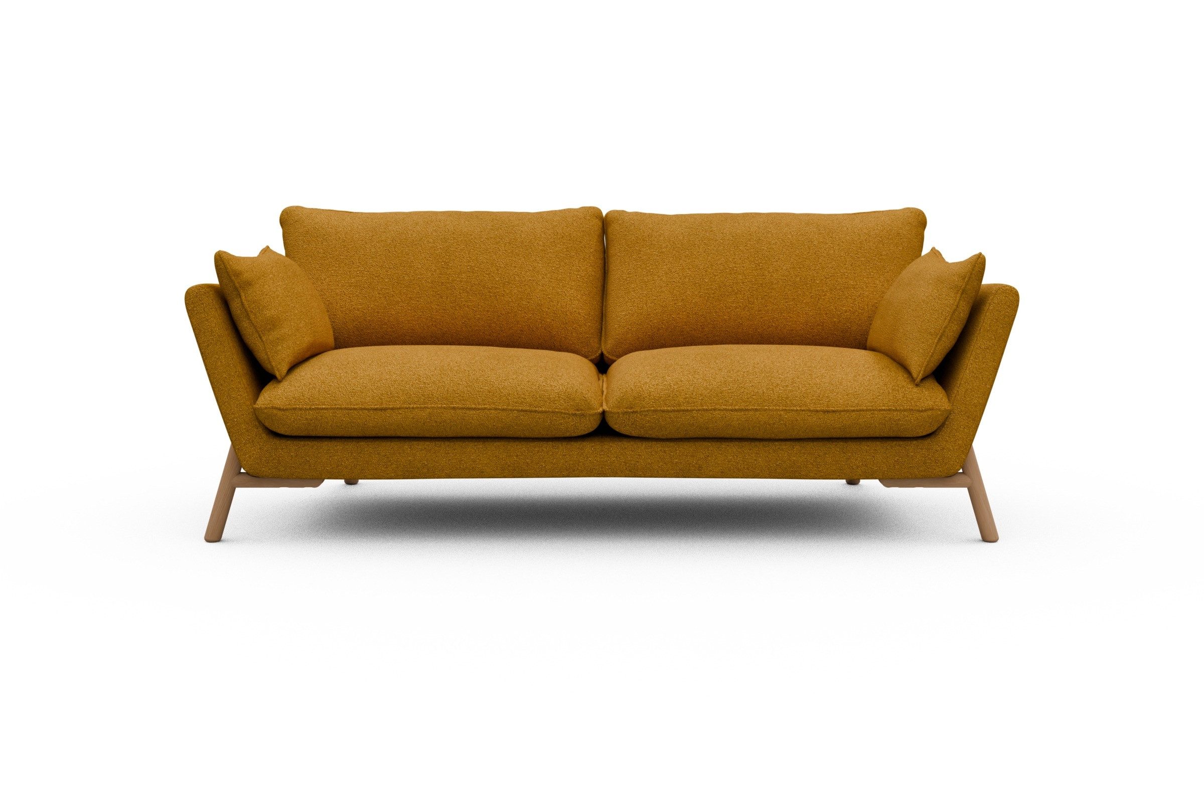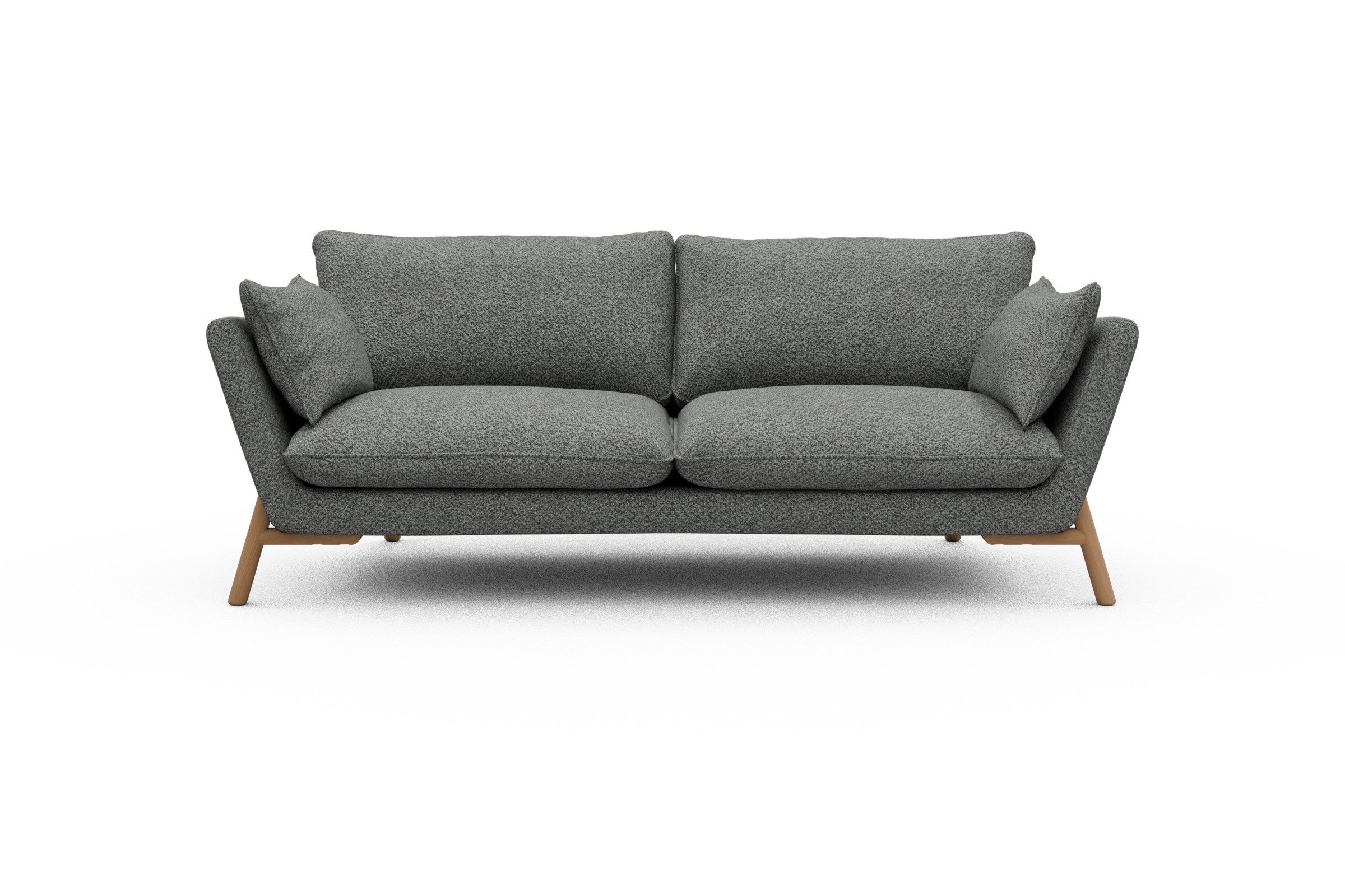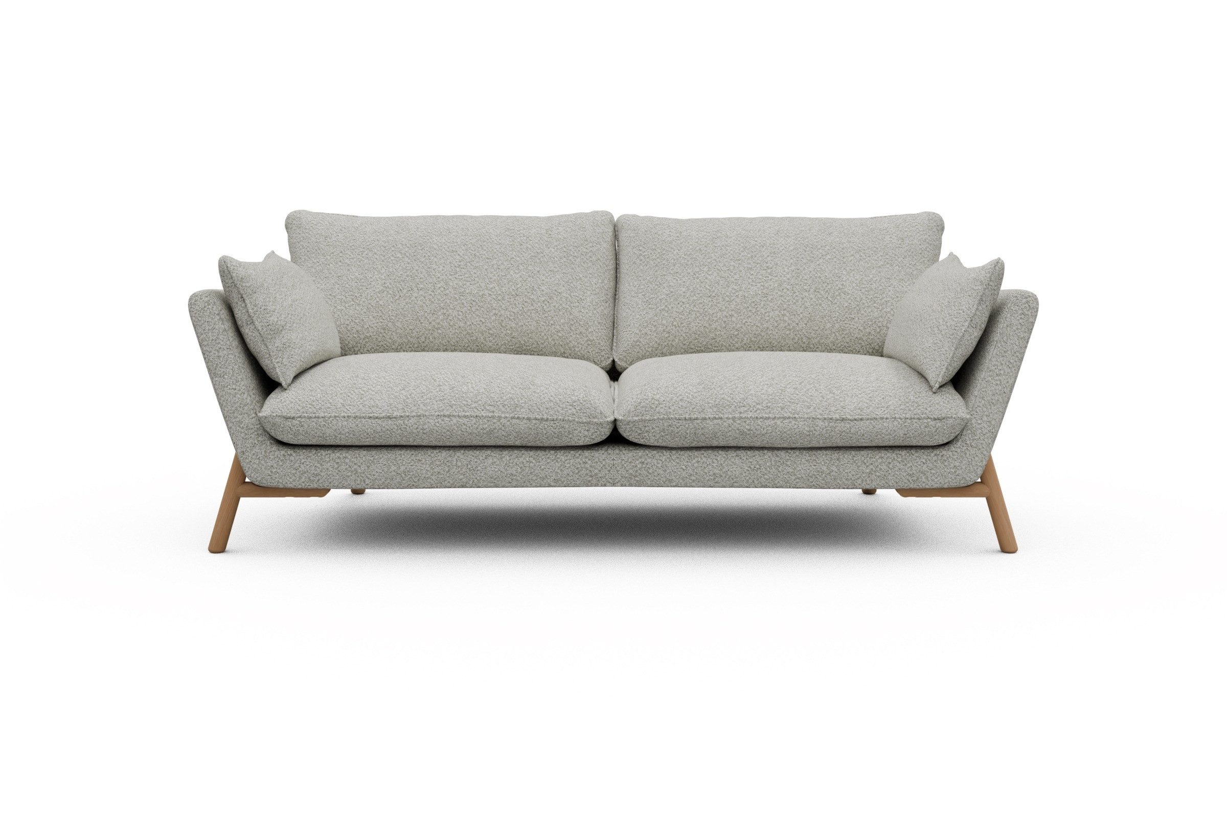 Die lackierten Eichenfüße in Natur setzen einen warmen Kontrast zum Bouclé-Stoff und sorgen für skandinavische Leichtigkeit. Stabilität? Check. Denn das Untergestell aus Massivholz mit Metallunterstützung bringt eine Extraportion Langlebigkeit mit. Und ja, Emil wurde in Europa handgefertigt – mit viel Liebe zum Detail und ganz ohne Möbel-Massenware-Vibes.