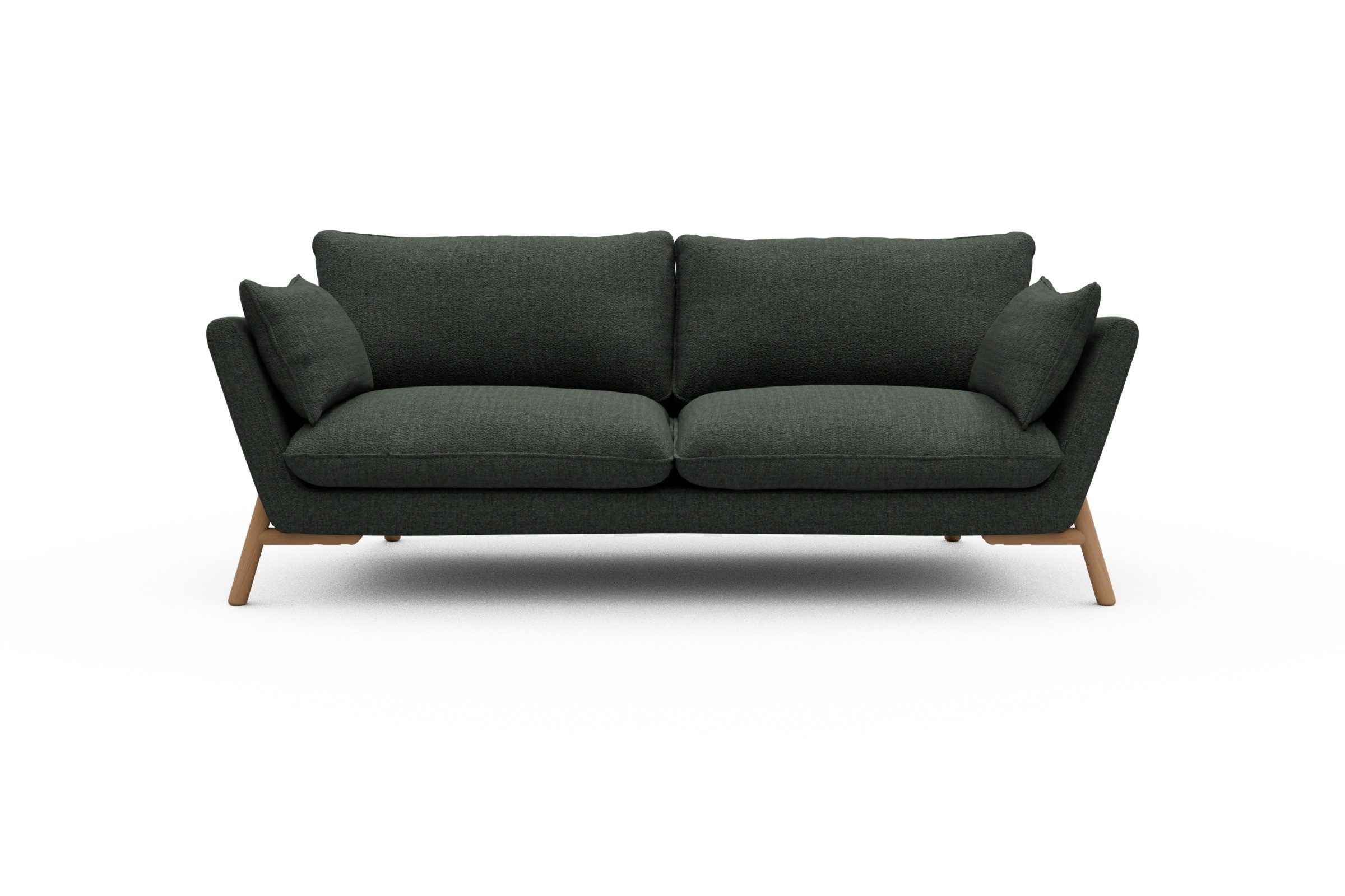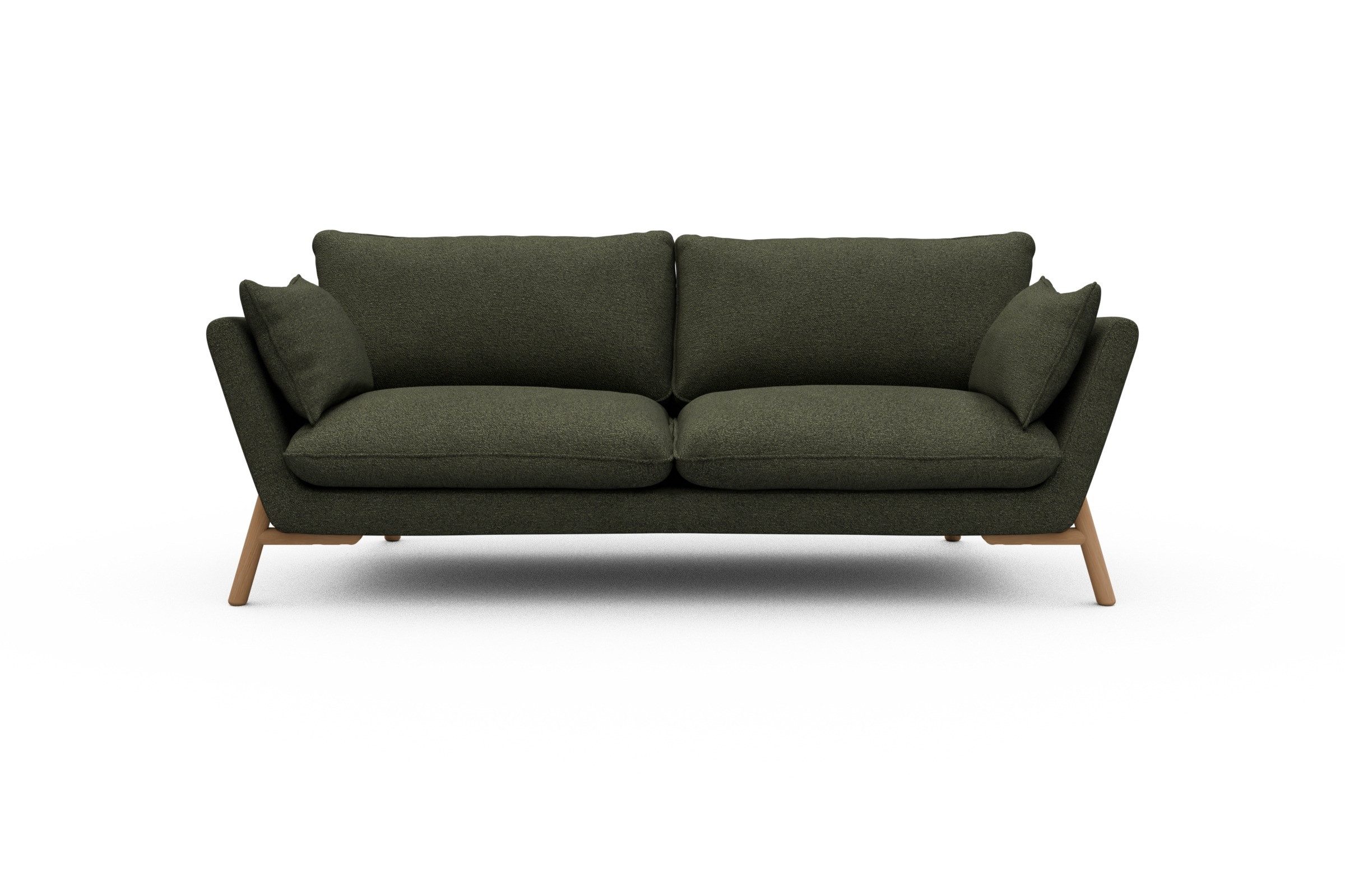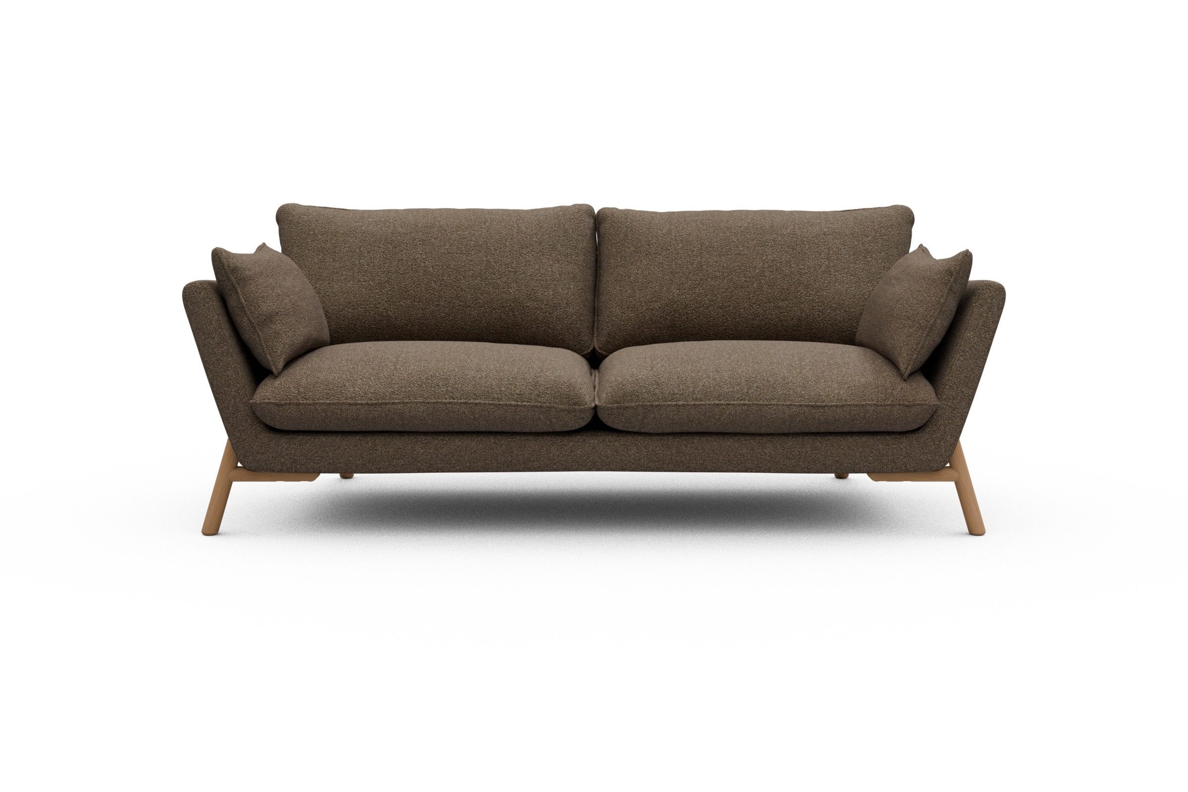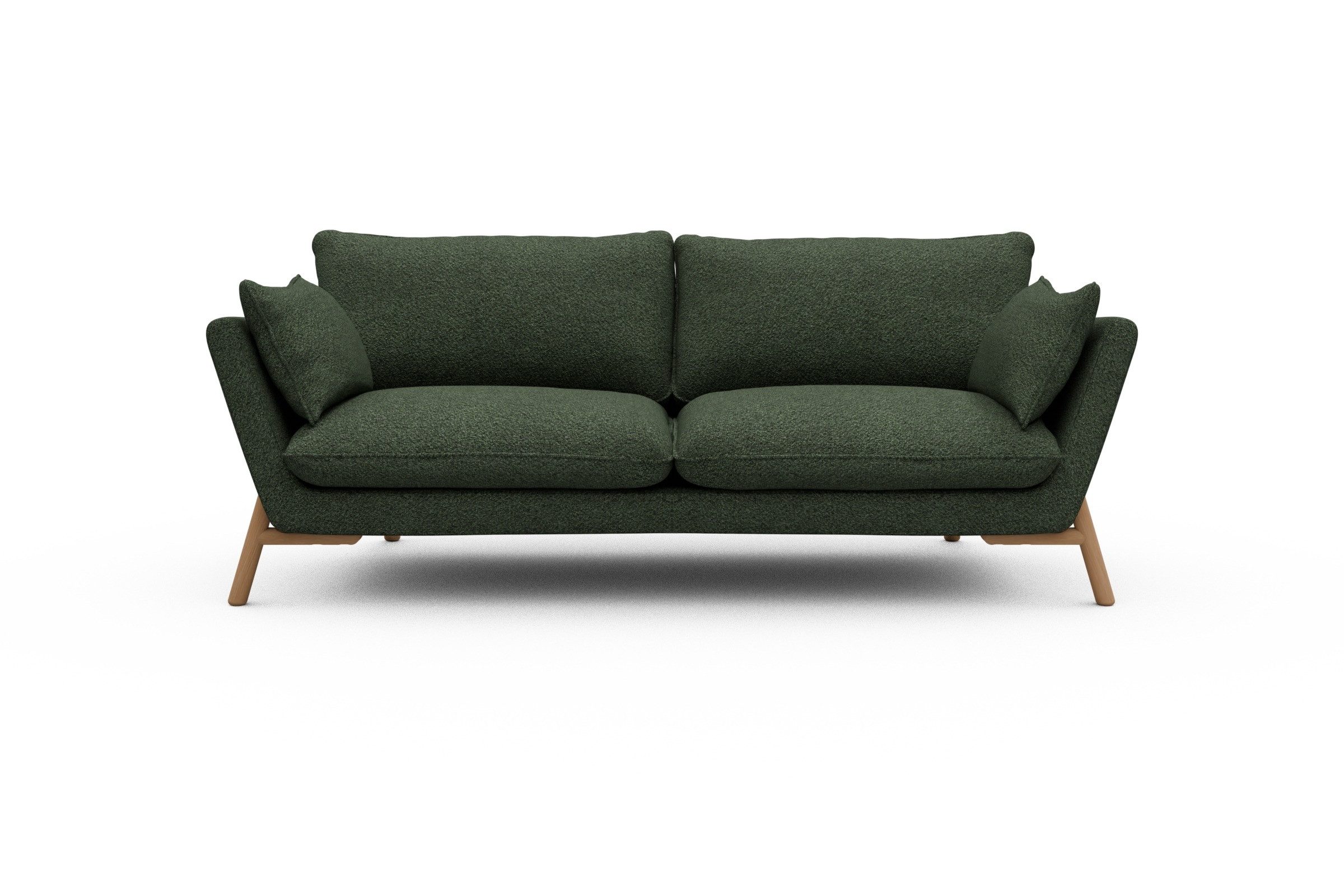 Die lackierten Eichenfüße in Natur setzen einen warmen Kontrast zum Bouclé-Stoff und sorgen für skandinavische Leichtigkeit. Stabilität? Check. Denn das Untergestell aus Massivholz mit Metallunterstützung bringt eine Extraportion Langlebigkeit mit. Und ja, Emil wurde in Europa handgefertigt – mit viel Liebe zum Detail und ganz ohne Möbel-Massenware-Vibes.
