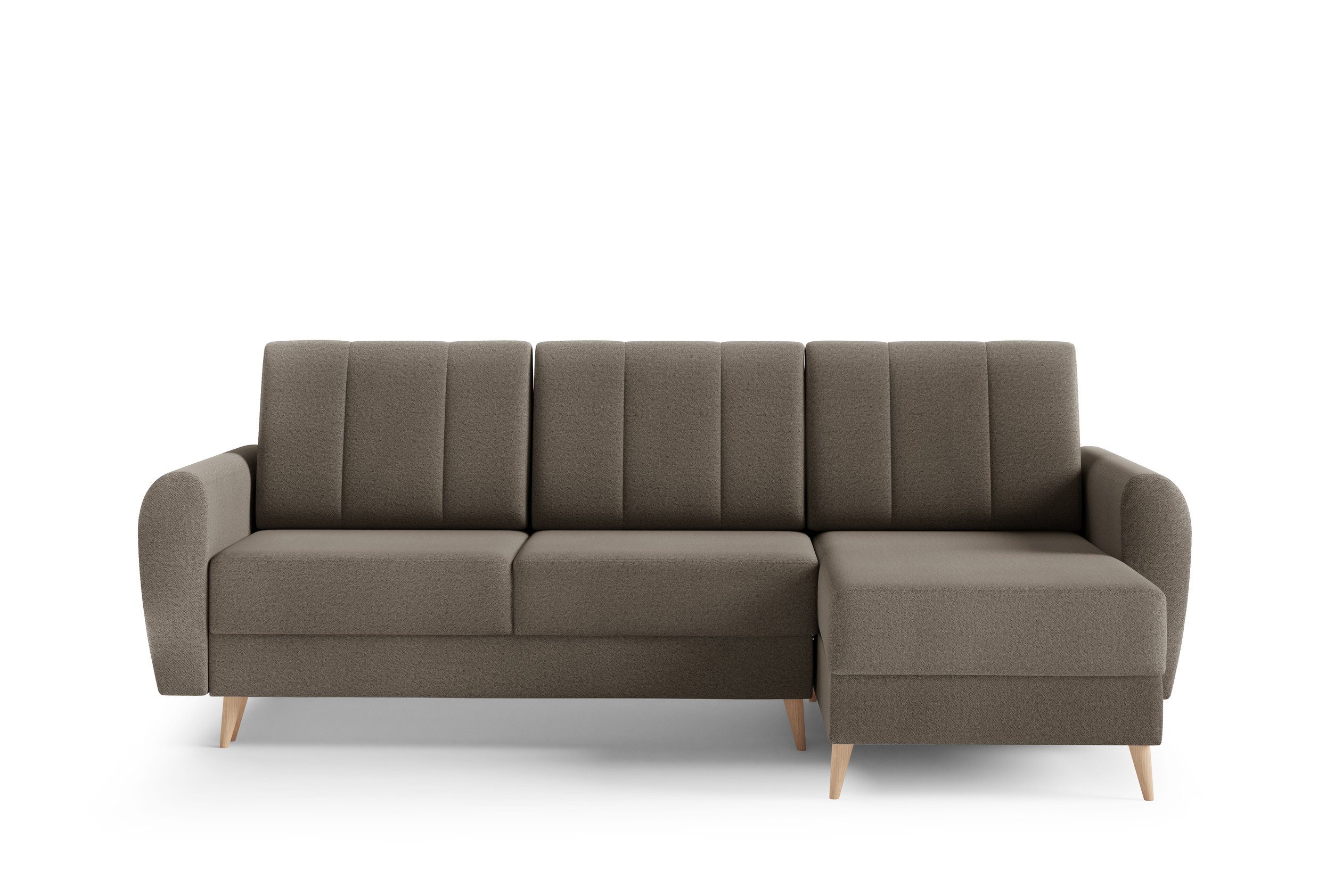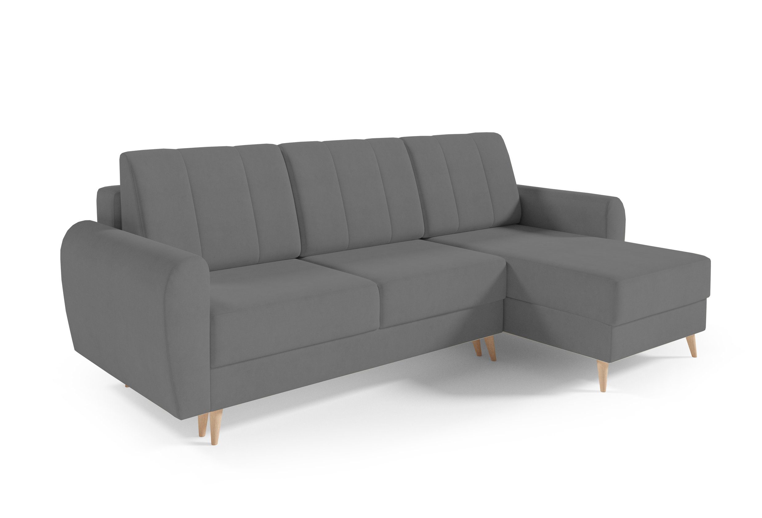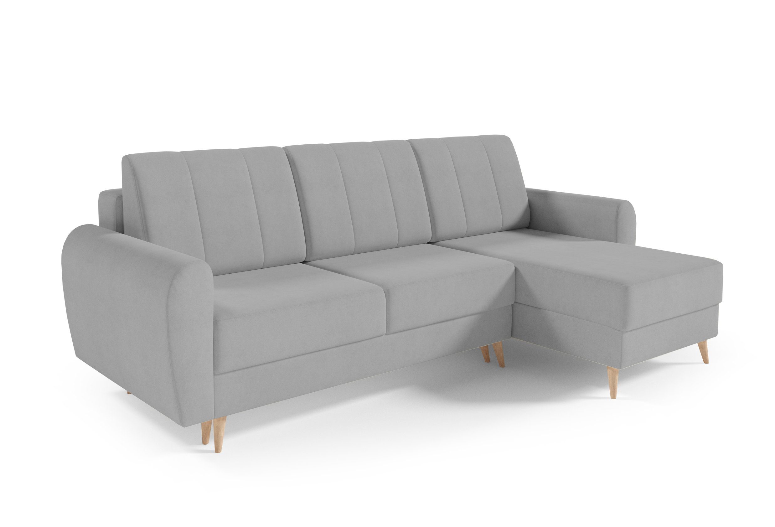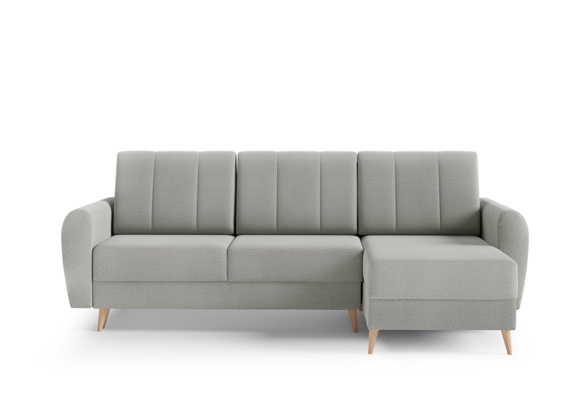 Das Ecksofa DEILA I hat eine leichte Form und ruht auf subtilen Beinen. Das Sofa passt gut in moderne, loftartige oder skandinavische Interieurs. Bemerkenswert sind hier die Rückenkissen und die zarten Armlehnen. Die Füllung des Ecksofas mit Schlaffunktion besteht aus hochwertigen, gewellten Federn. Das Möbel ist mit einer komfortablen Schlaffunktion vom Typ Moss-Automatik ausgestattet, die sowohl im Alltag als auch bei gelegentlichem Besuch von Gästen gut funktioniert. Das Möbel verfügt außerdem über einen funktionellen Bettzeugbehälter. Das Ecksofa mit Schlaffunktion ist in verschiedenen Farbausführungen erhältlich.