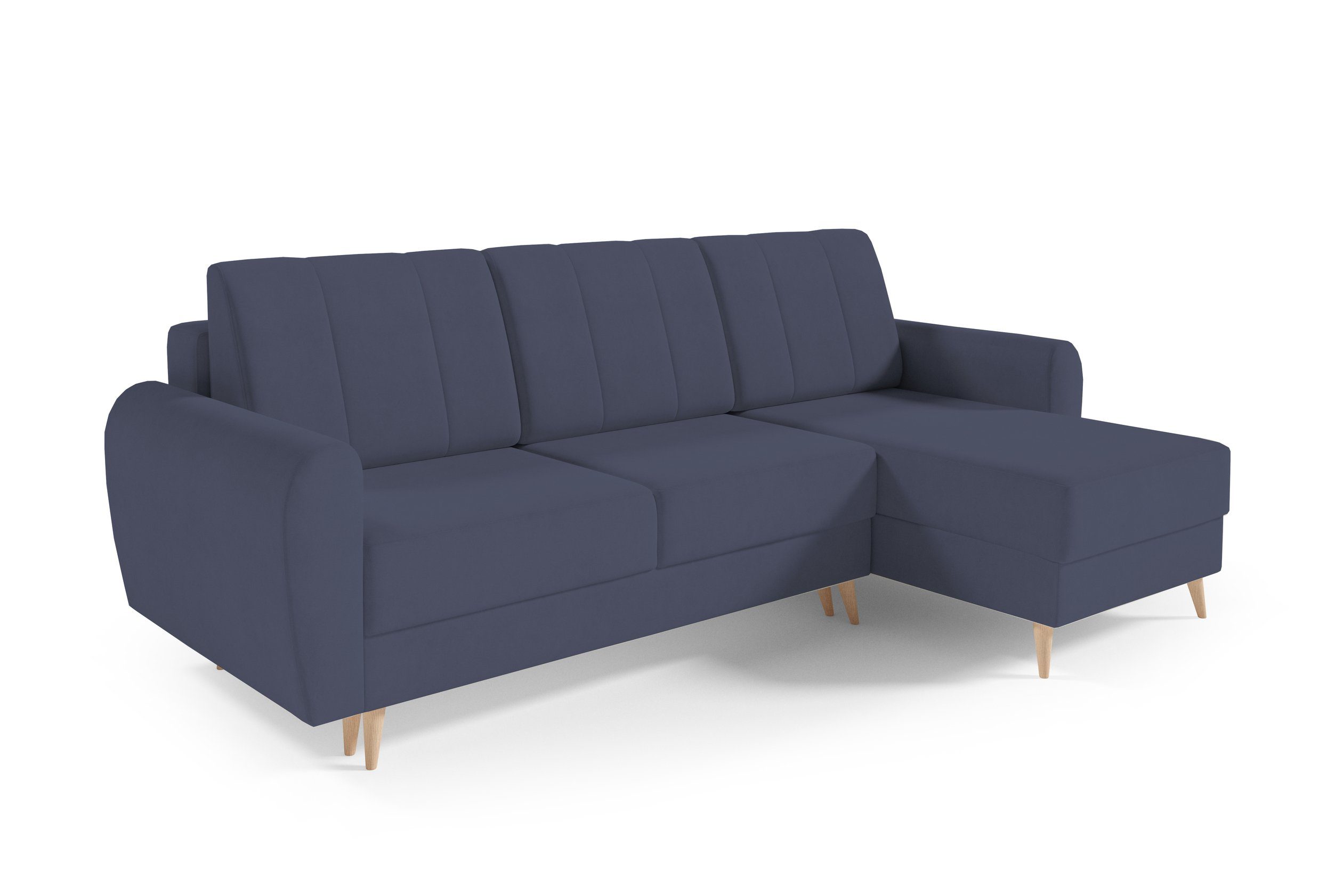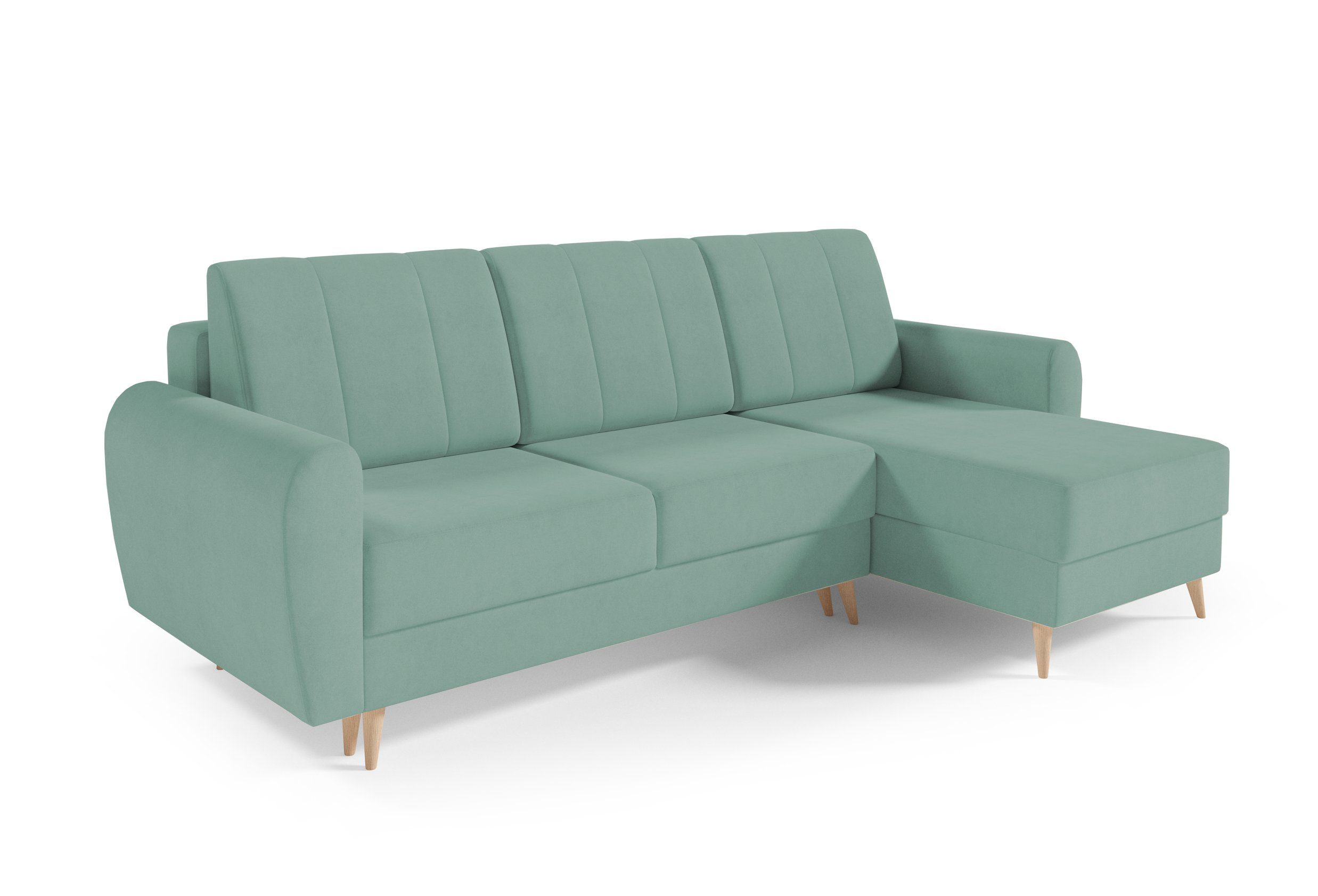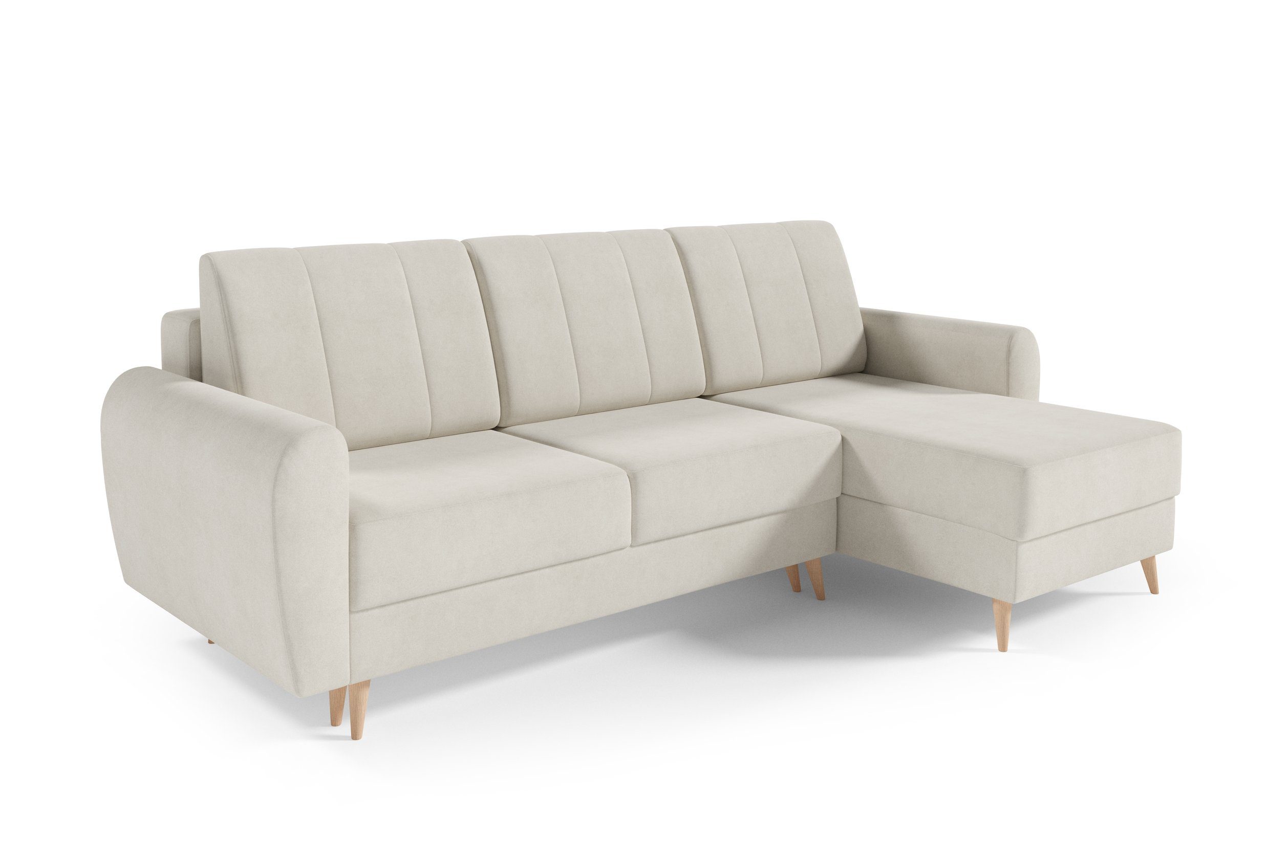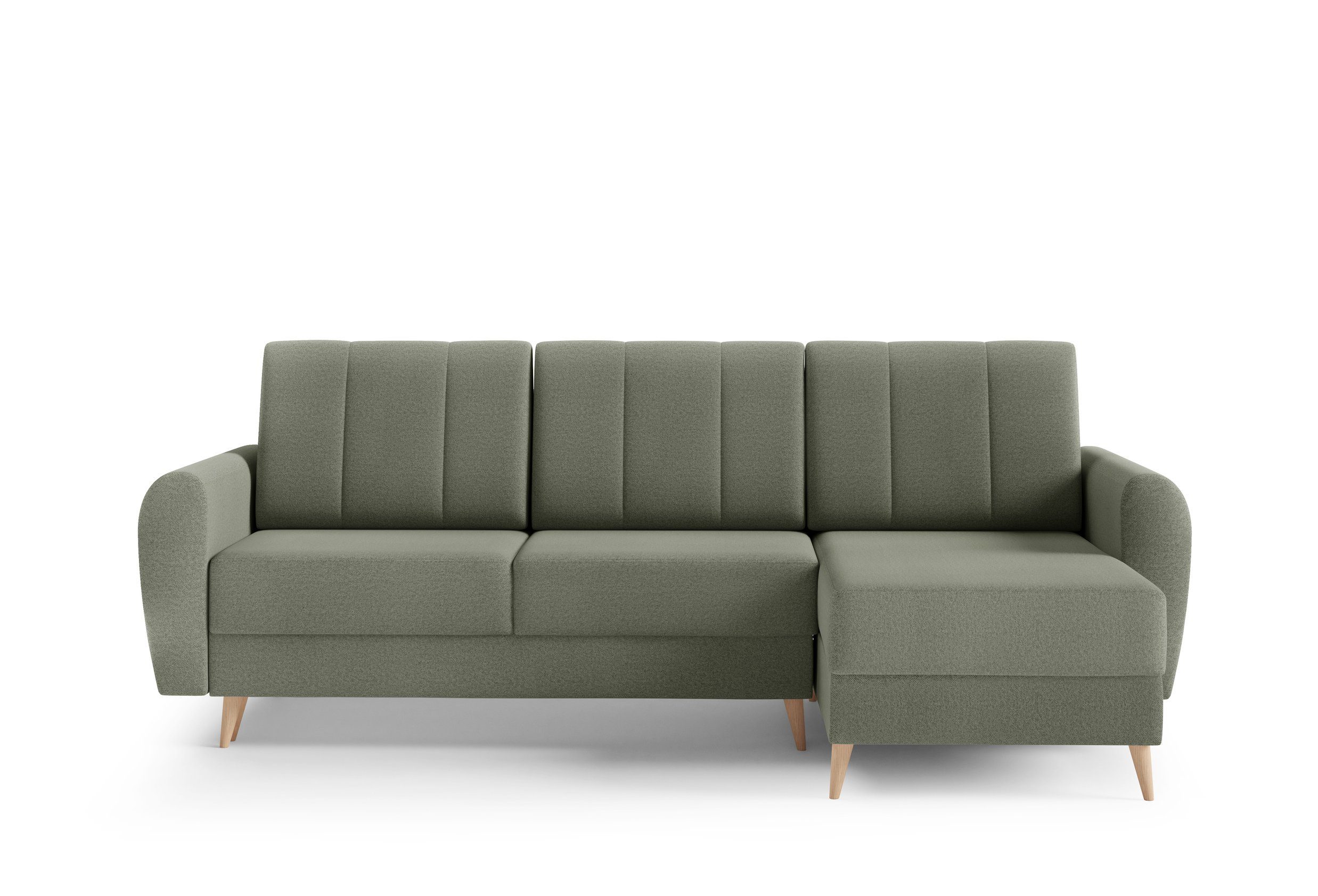 Das Ecksofa DEILA I hat eine leichte Form und ruht auf subtilen Beinen. Das Sofa passt gut in moderne, loftartige oder skandinavische Interieurs. Bemerkenswert sind hier die Rückenkissen und die zarten Armlehnen. Die Füllung des Ecksofas mit Schlaffunktion besteht aus hochwertigen, gewellten Federn. Das Möbel ist mit einer komfortablen Schlaffunktion vom Typ Moss-Automatik ausgestattet, die sowohl im Alltag als auch bei gelegentlichem Besuch von Gästen gut funktioniert. Das Möbel verfügt außerdem über einen funktionellen Bettzeugbehälter. Das Ecksofa mit Schlaffunktion ist in verschiedenen Farbausführungen erhältlich.