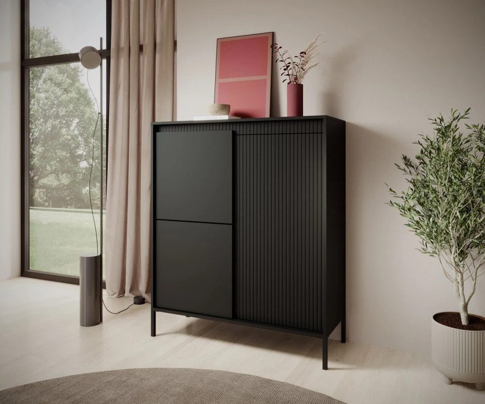 Die Rifaro-Kollektion, erhältlich in Schwarz und Beige, zeichnet sich durch ein modernes, minimalistisches Design mit einem eleganten Akzent aus. Die Verwendung von geriffelten Fronten in Kombination mit glatten, nach vorne versetzten Elementen schafft ein harmonisches Spiel von Texturen und Tiefe. Schlanke Metallbeine verleihen den Möbeln Leichtigkeit, während das grifflose Öffnen ihre klare, moderne Form betont. Schwarze Möbel bringen Eleganz und Kontrast in den Raum, während die beige Kollektion Helligkeit und Subtilität hinzufügt und so ideale Sets für zeitgemäße, stilvolle Arrangements schafft.