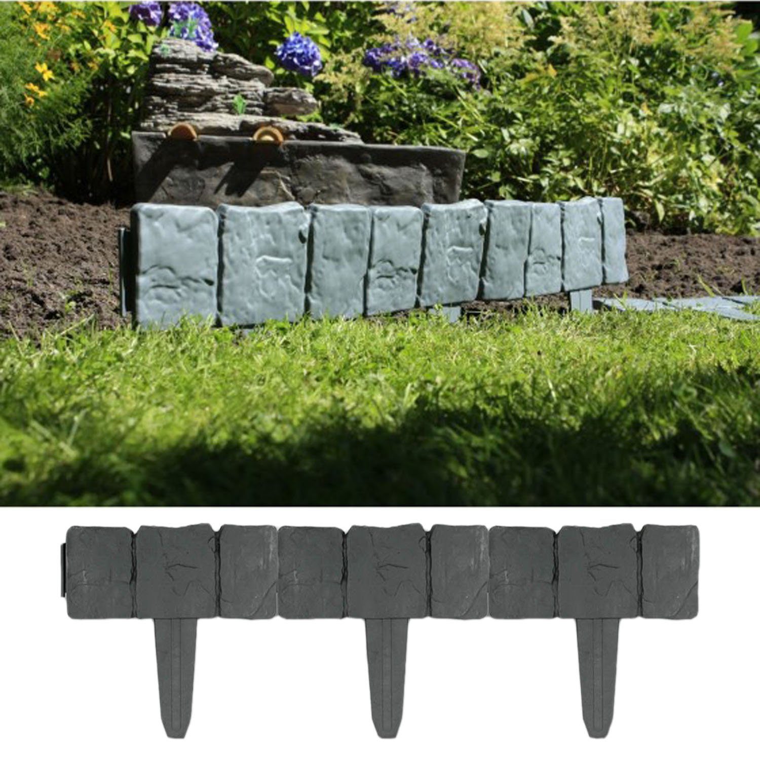 Die Beetumrandung un Schiefersteinoptik in der Farbe Grau.ist pro Einzelteil 25cm lang und 23cm hoch (inkl. Erdspieß). Über das Stecksystem lassen sich die einzelnen Module miteinander verbinden. An der Unterseite sind Erdspieße angebracht. Diese Beeteinfassung - Rasenkante ist ein nützliches Detail in Ihrem Garten.
