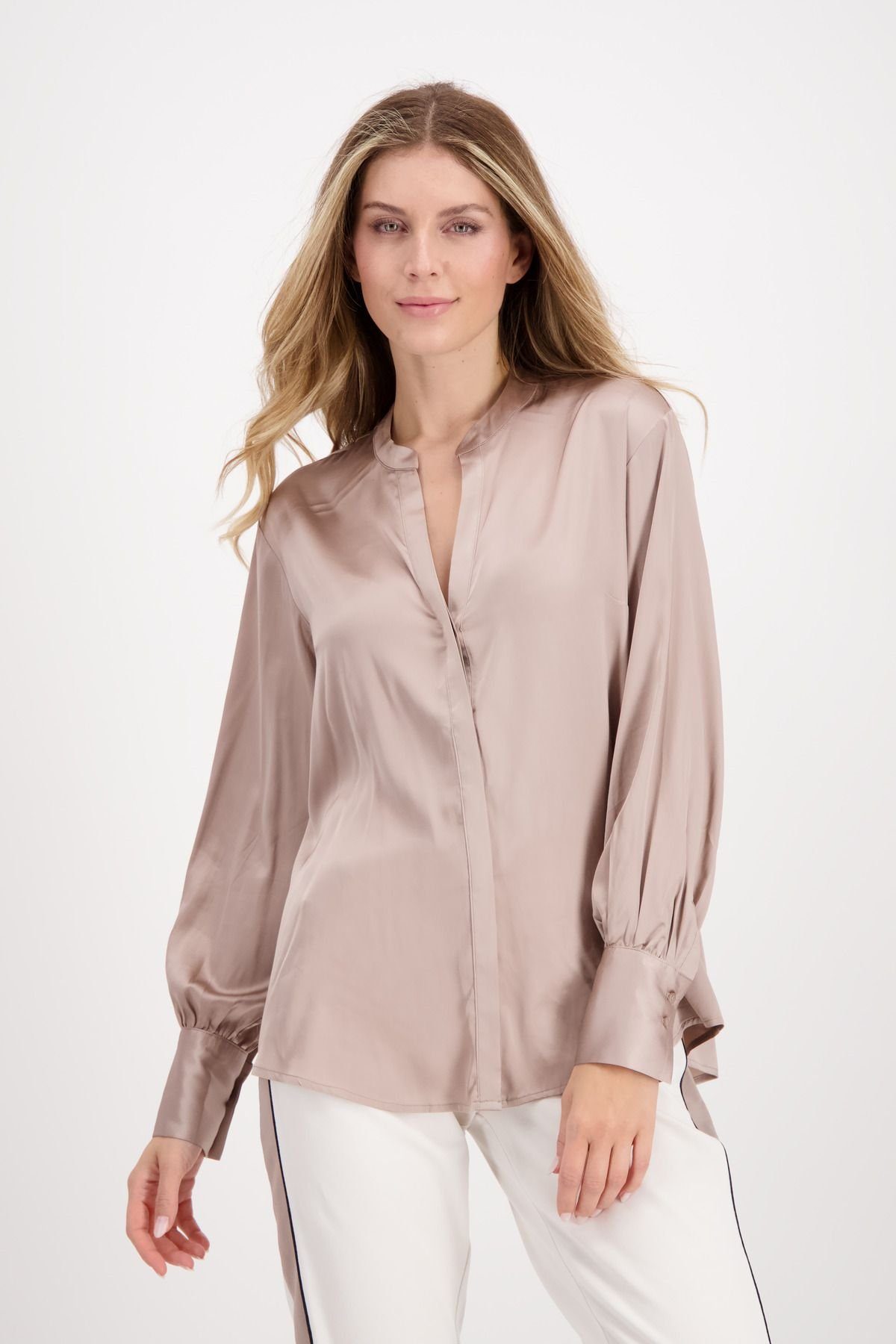 Um elegante Outfits Damen zu kombinieren ist diese Satin Bluse von monari immer eine gute Wahl. Die langen Ärmel enden mit eine Schlitz, Falten und einer Knopfmanschette, während sich auf der Rückseite eine Passe mit cooler Kellerfalte befindet. Die Form: Regular Fit mit offenem Stehkragen, Langarm und abgerundetem Saum. Die Damen Bluse erweist sich als Styling Talent in weich fließender Viskose Qualität mit Stretch. Blickfang ist mit Abstand die glänzende Satin Optik, die die Bluse elegant und modern zum Vorschein bringt. Freuen Sie sich auf elegante Kombinationen mit dieser Satinbluse. Ob in der Freizeit oder im Büro, ob zur Jeans oder Jogpants - in dieser unifarbenen Bluse machen Sie immer eine gute Figur.