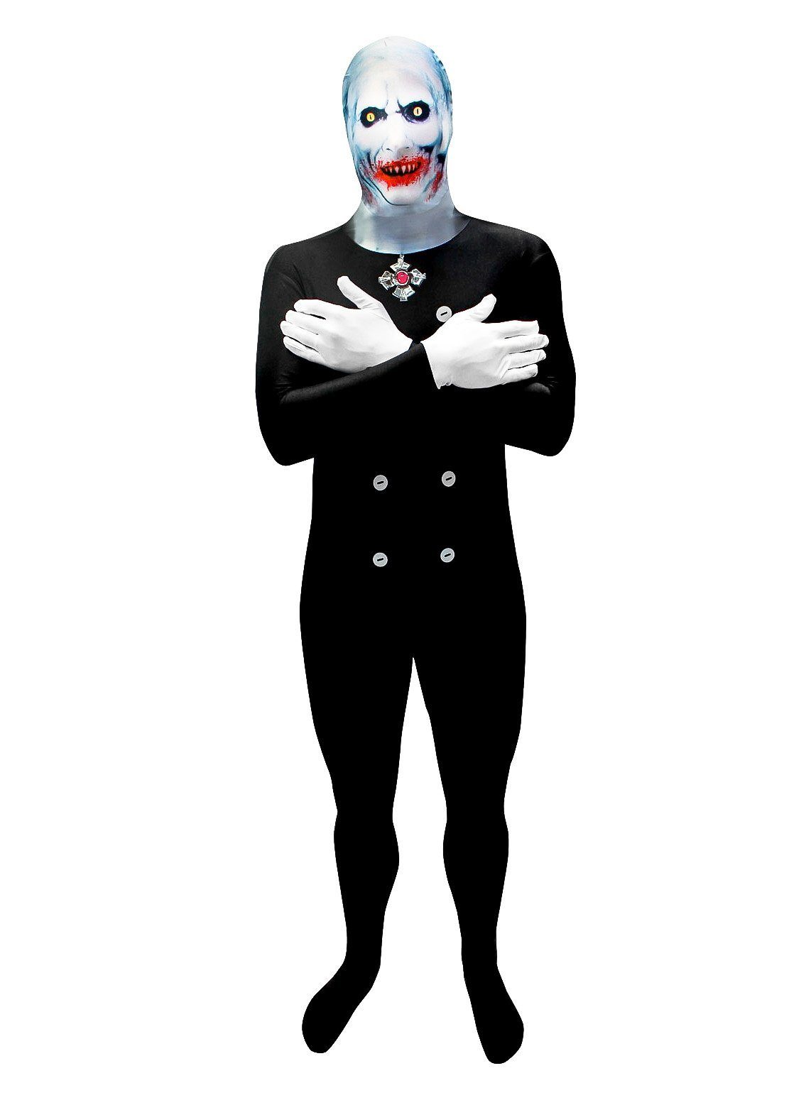 Bühne frei für den König der Vampire: Dracula! Der transsilvanische Blutsauger hat - neben unschuldigen Jungfrauen - bekanntlich ein Faible für stilvolle Gewänder, und dementsprechend gestaltet sich auch unser Morphsuit Dracula. Die aufgedruckten Knöpfe erinnern an ein edles, zweireihiges Jacket, der Amulett-Print stützt das Bild des kultivierten Adligen effektvoll. Doch spätestens, wenn man dem Grafen ins bleiche, blutverschmierte Gesicht schaut und die mörderische Zahnreihe entdeckt, dürfte klar sein, dass dieser Fürst nicht zum Nachmittags-Tee einlädt…