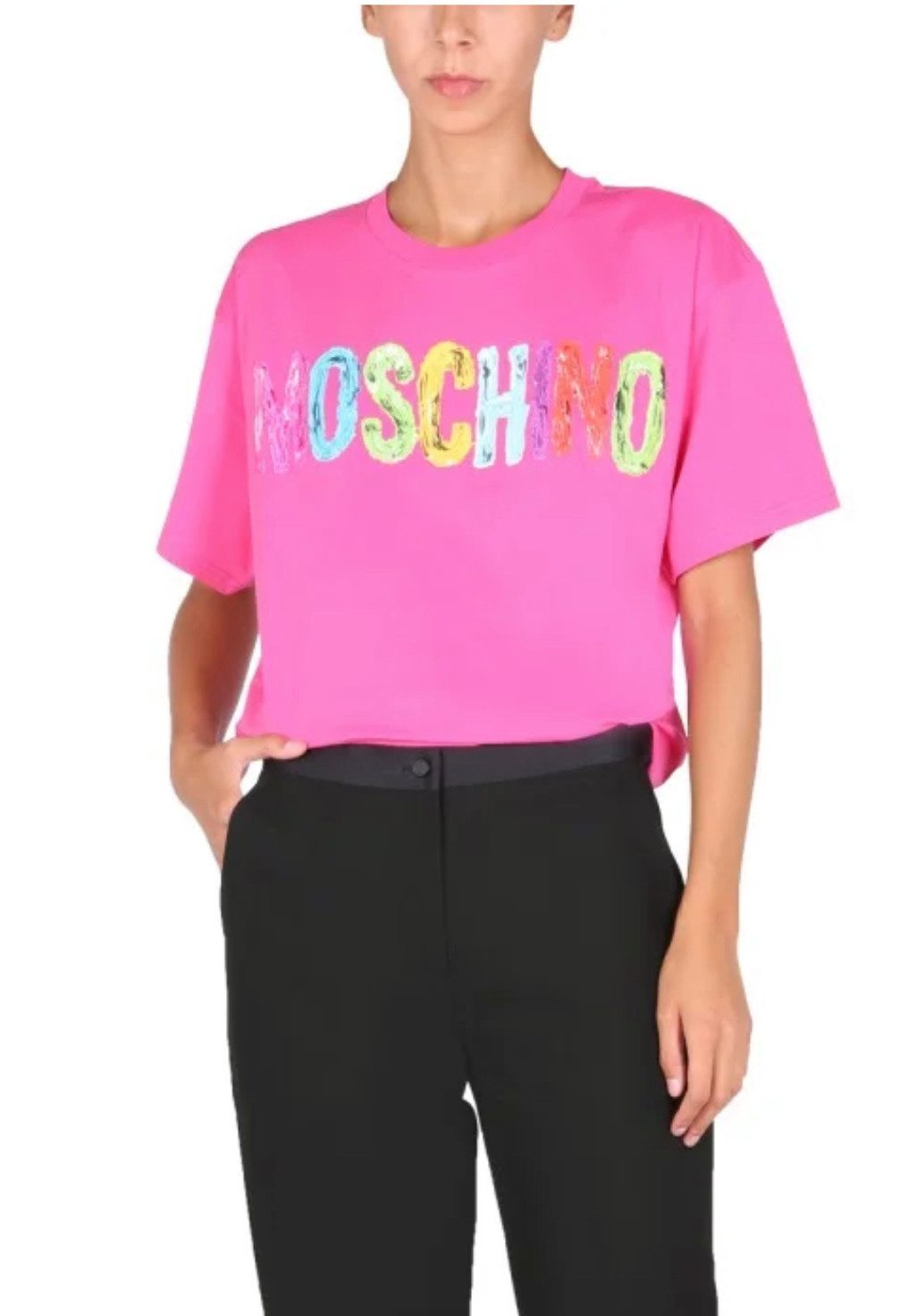 MOSCHINO Oversize T-Shirt mit Paint-Effect Logo – Statement-Shirt aus der Couture-Linie Dieses T-Shirt stammt aus der exklusivsten Linie von Moschino – MOSCHINO COUTURE. Ursprünglich als Damenmodell designt, lässt es sich durch den Oversize-Fit auch perfekt von Herren tragen. Ein echtes Unisex-Statement. Warum dieses Shirt besonders ist: Eyecatcher durch mehrfarbiges Moschino-Logo mit 3D-Optik Ideal für expressive Streetstyle-Looks Vereint Komfort, Kunst und Couture-Flair Vielseitig kombinierbar – von casual bis extravagant Design mit Charakter: Das kunstvoll gestaltete Logo wirkt wie ein aufgesprühter Farbeffekt und bringt die kreative Handschrift der Marke Moschino perfekt zur Geltung. Ein T-Shirt, das auffällt und Persönlichkeit zeigt. Markenhintergrund: Moschino wurde in den 1980ern von Franco Moschino gegründet. Heute begeistert das Label unter Jeremy Scott mit frechem Luxus, ikonischen Popkultur-Zitaten und humorvollen Designs. Die Couture-Linie steht für Premiumqualität mit modischem Augenzwinkern. Hinweis: Leichte Abweichungen zwischen Produktfoto und Original sind möglich (z. B. durch Beleuchtung oder Produktionschargen).