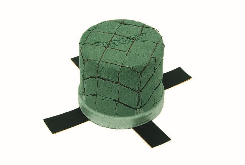 Blumen-Gesteckhalter für die Urne. Die runde Gesteckunterlage wird mittels angebrachter Klebeänder auf der Urne befestigt. 9,5 cm Durchm. bei 7.5 cm Höhe