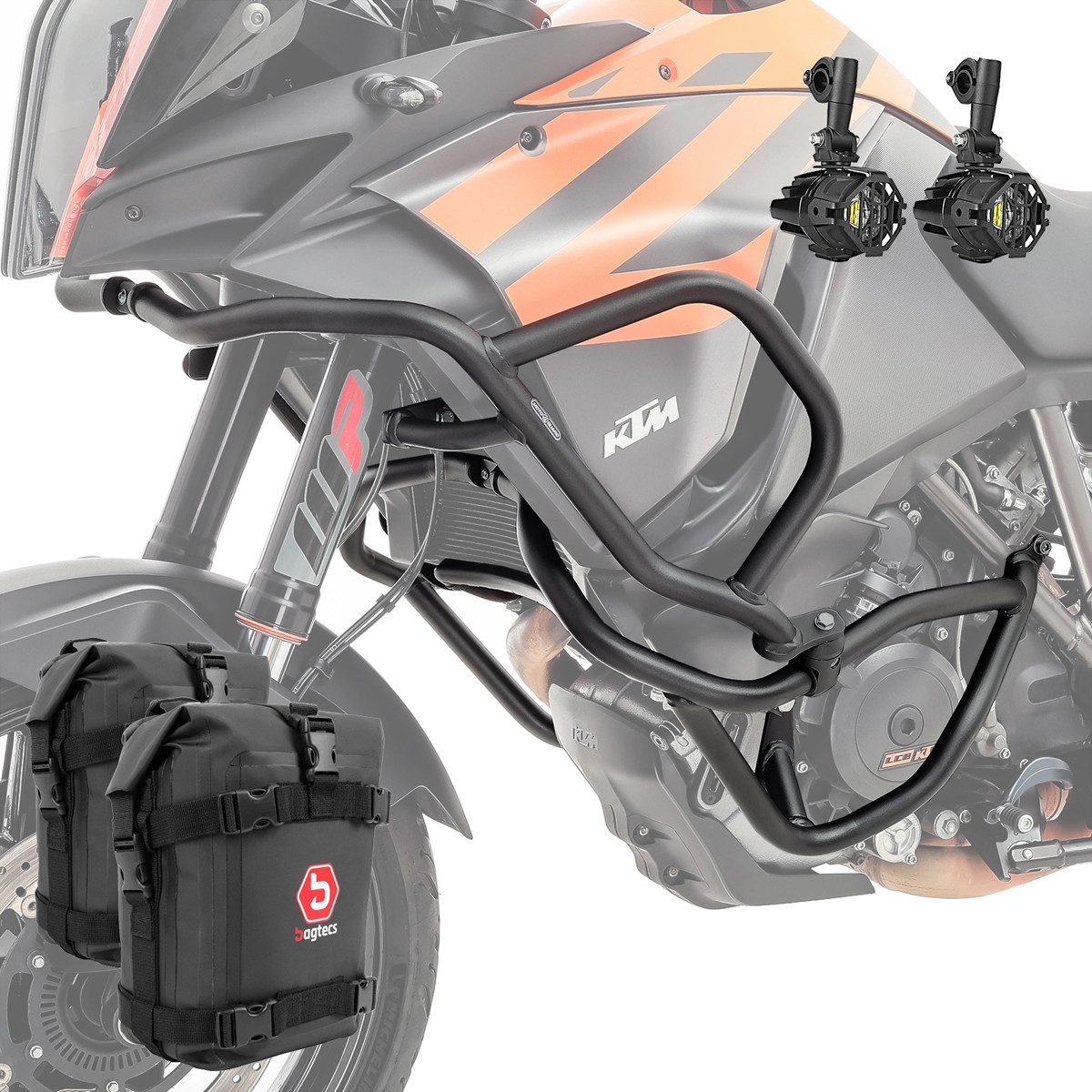 • Lieferumfang: Sturzbügel Motorschutz unten, Schutzbügel Verkleidung oben, 2x LED-Zusatzscheinwerfer, Kabelbaum mit Schalter, Schutzgitter, 2x Sturzbügeltaschen.