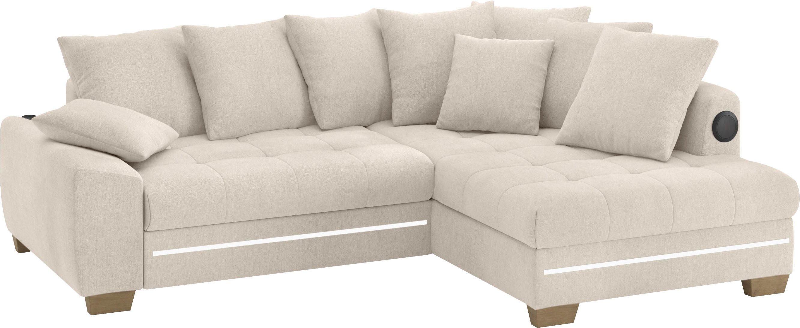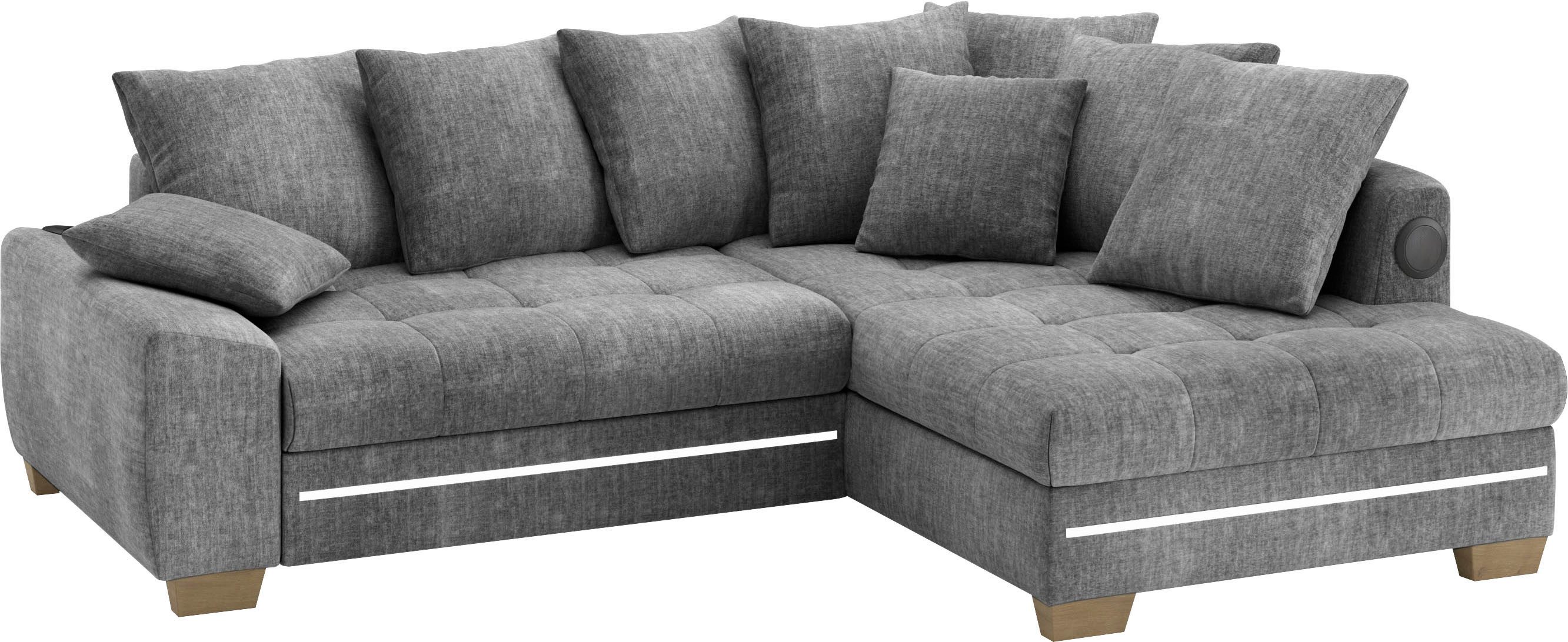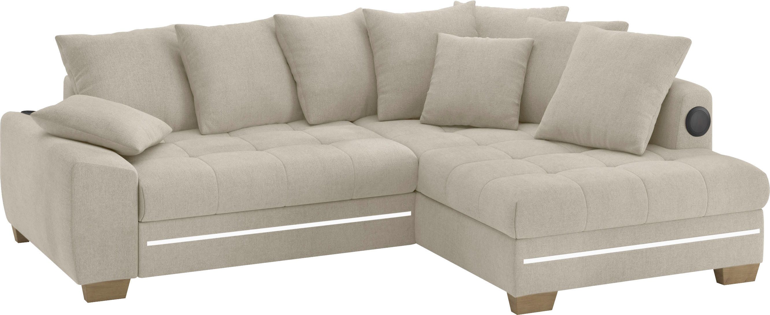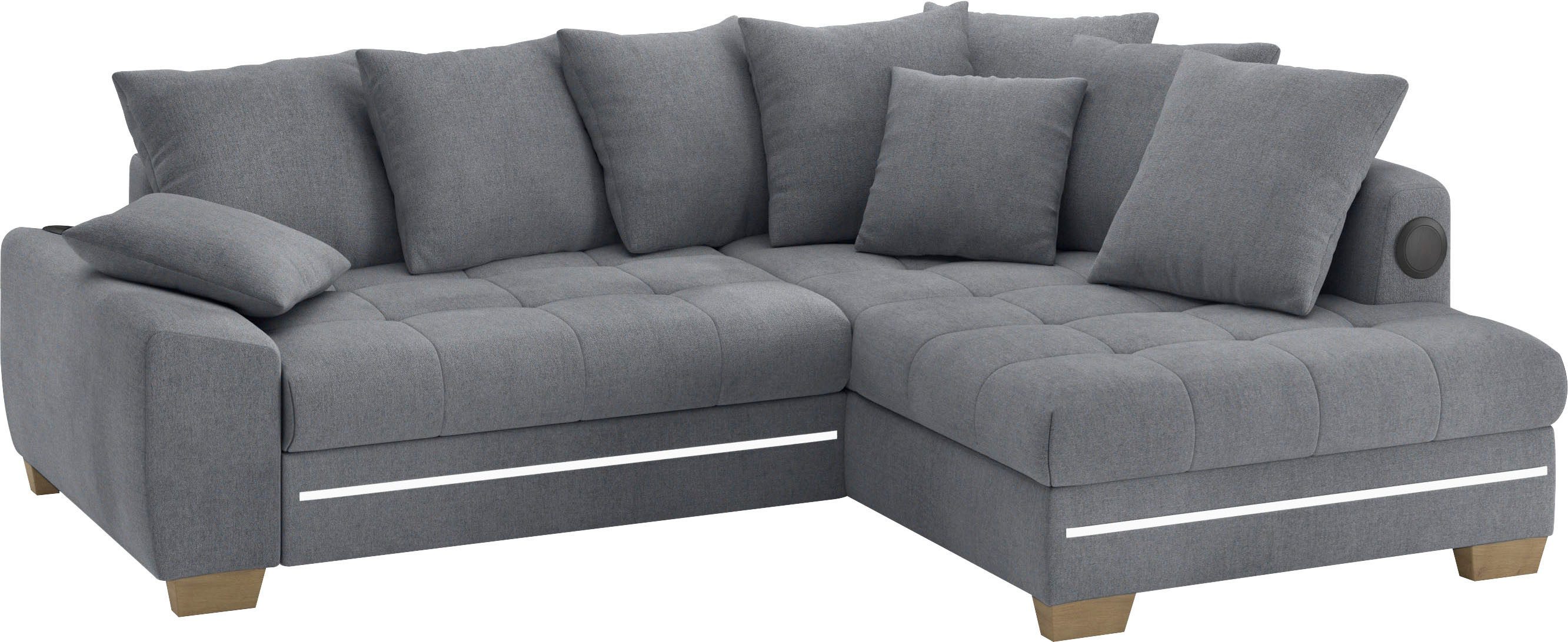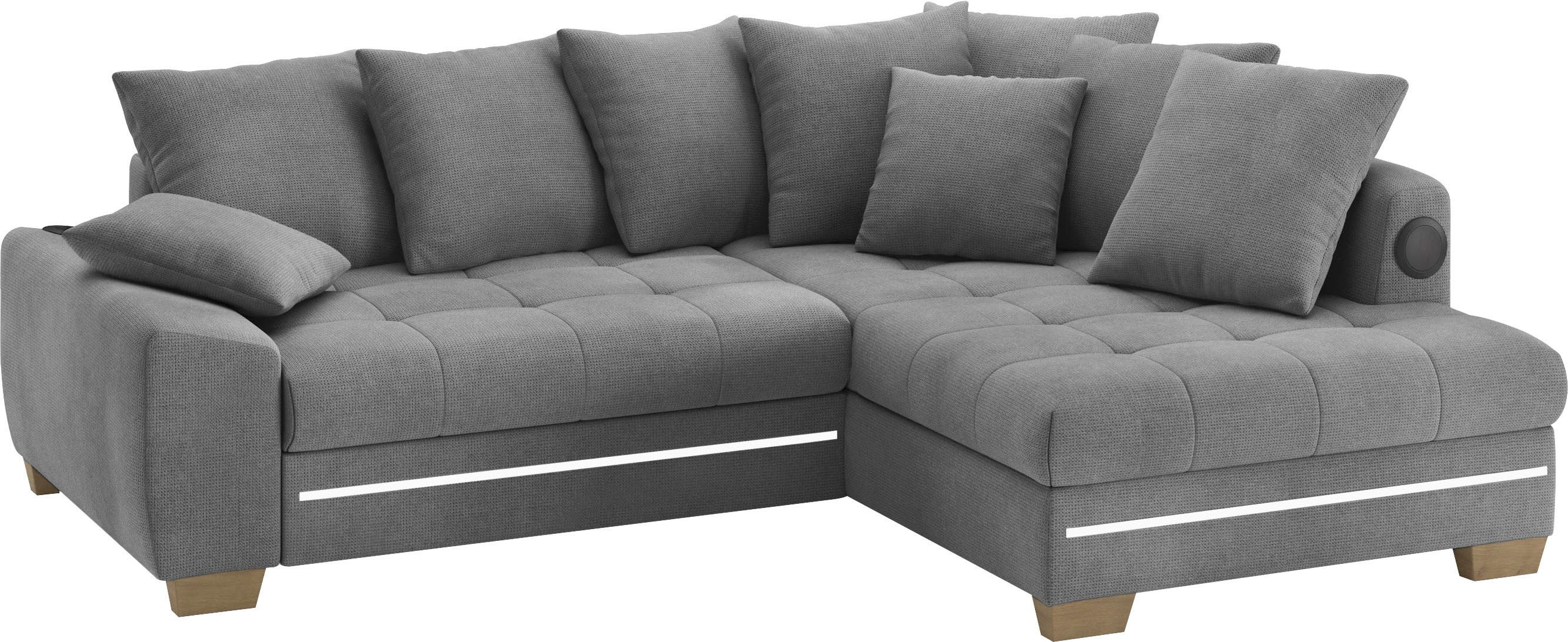 Lieferumfang | 2 Zierkissen 7 Rückenkissen Polsterecke mit Kaltschaum, RGB-LED Beleuchtung inkl. Fernbedienung und Bluetooth-Soundsystem mit Subwoofer und USB-Port |