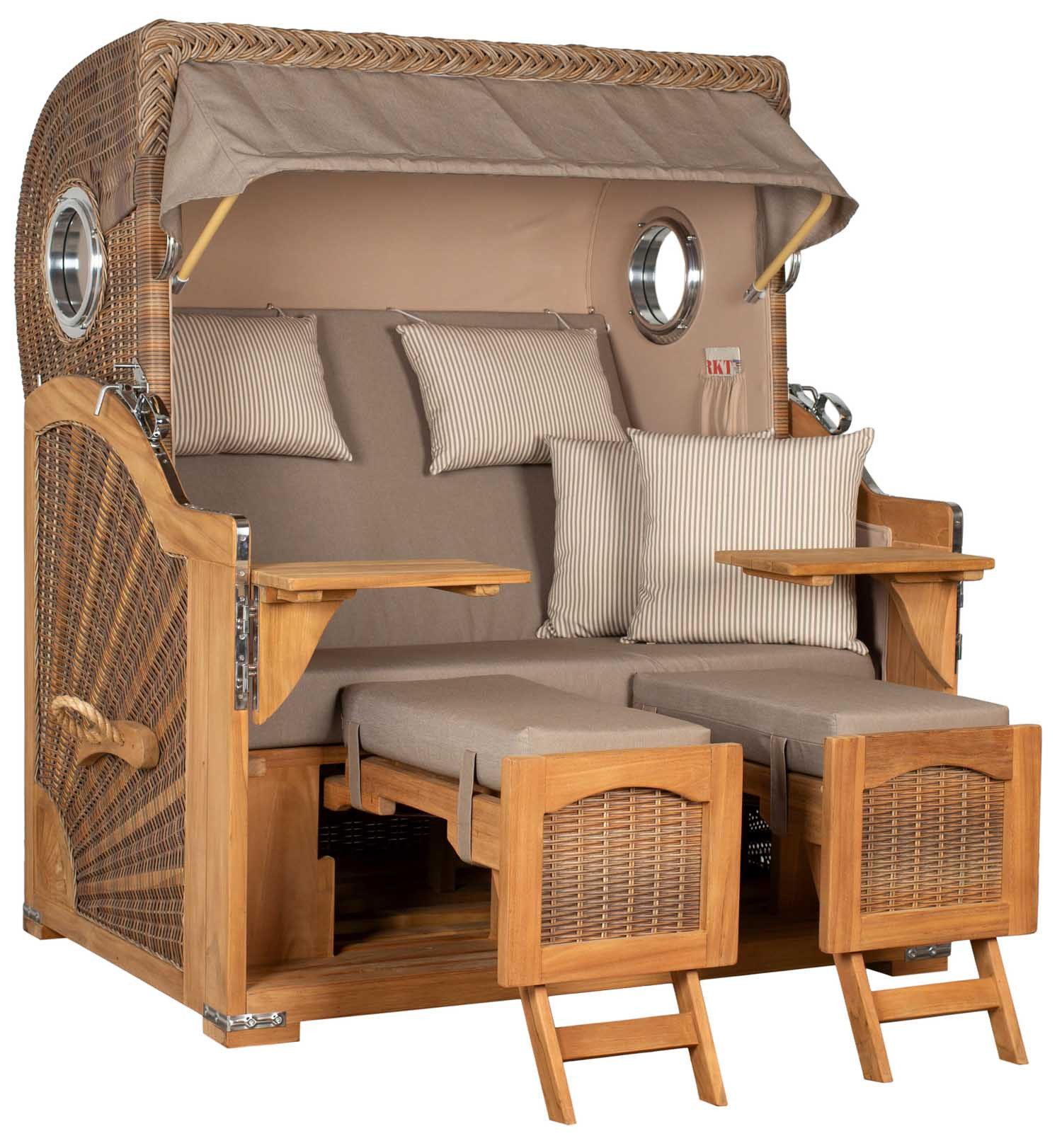 Die durchdachte Konstruktion des Düne Grande Bullauge sorgt für höchsten Liegekomfort. Mit einem praktischen Volllieger ausgestattet, ermöglicht dieser Strandkorb erholsame Auszeiten, sei es für ein Nickerchen oder einfach zur Entspannung beim Lesen. Die zwei herausziehbaren Fußstützen tragen zur individuellen Anpassbarkeit des Liegegefühls bei. Rostfreie V2A Edelstahlbeschläge garantieren zusätzliche Stabilität, was ein unbeschwertes Entspannen ermöglicht.