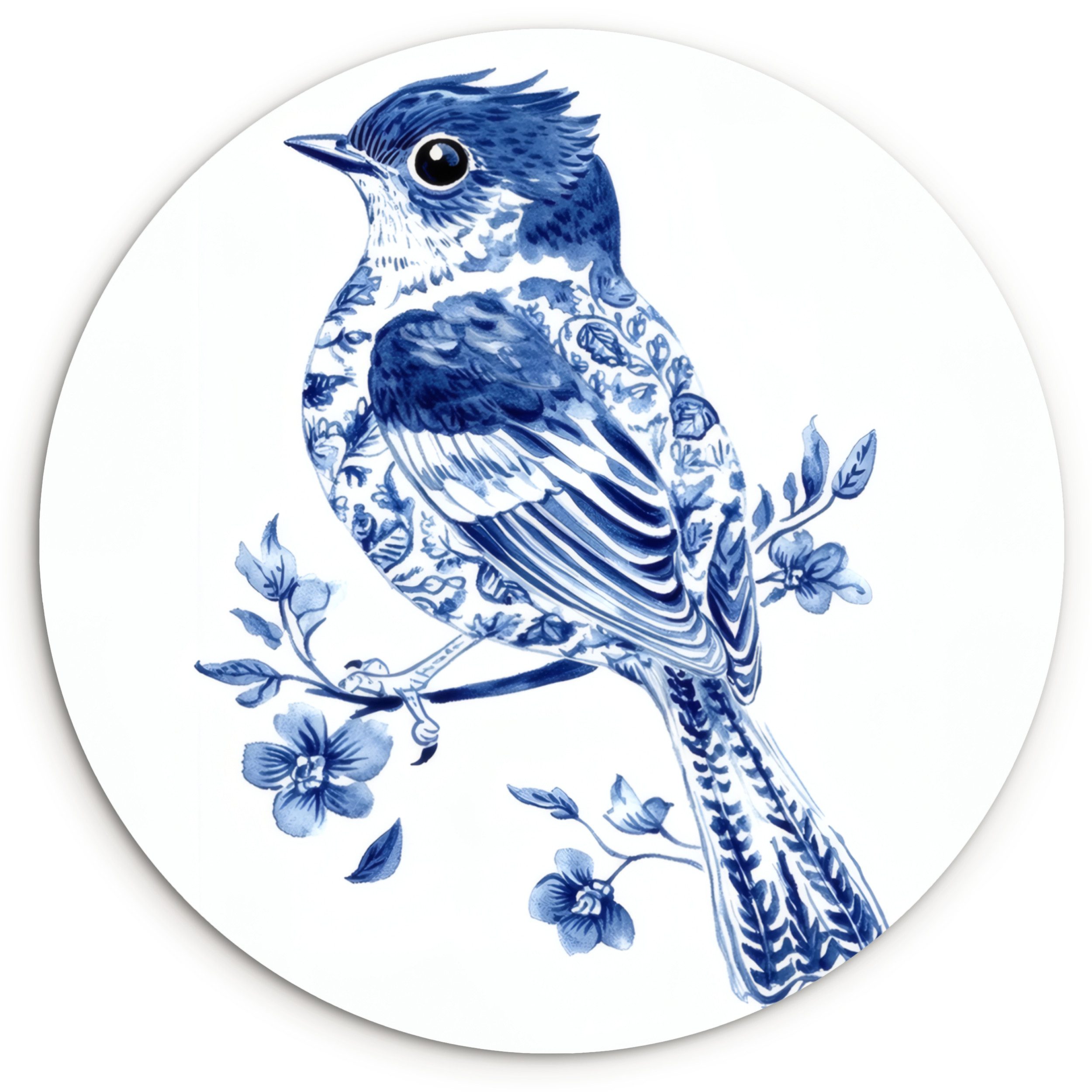 Eine künstlerische Darstellung einer Giraffe mit weißem Sockel, die vollständig mit detaillierten delfterblauen Blumenmustern bedeckt ist. Die kunstvollen Muster folgen den Konturen von Hals und Kopf, während die großen, ausdrucksstarken Augen für Kontrast sorgen. Der minimalistische weiße Hintergrund unterstreicht das dekorative und elegante Aussehen dieses einzigartigen Kunstwerks.