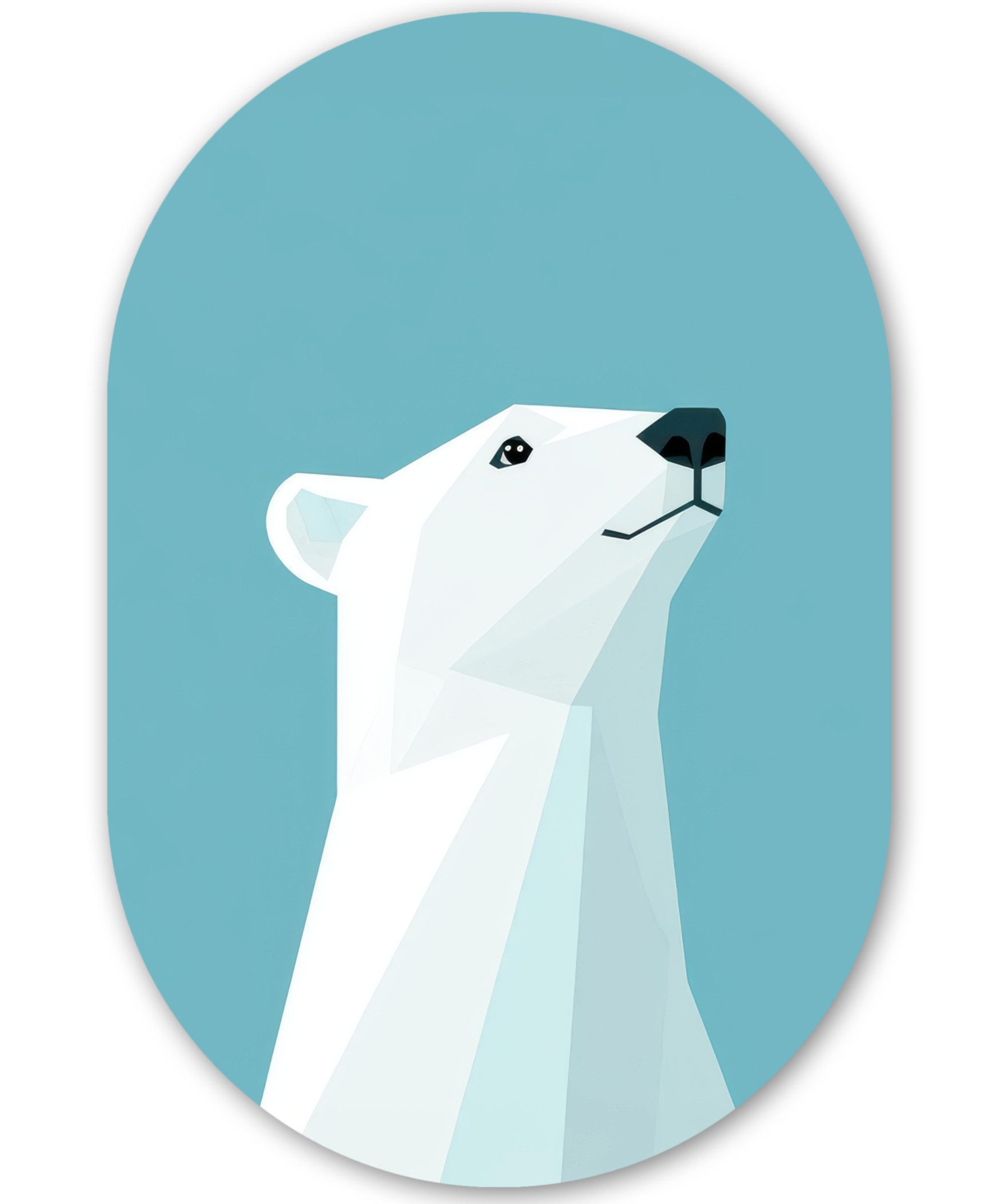 Ein weißer Eisbär blickt stolz nach oben, gezeichnet in flachen, klaren Linien mit hellblauen Schatten vor einem schlichten hellblauen Hintergrund.Kunstgenre | Modern, Natur, Tiere, Abstrakt, Kinderzimmer |