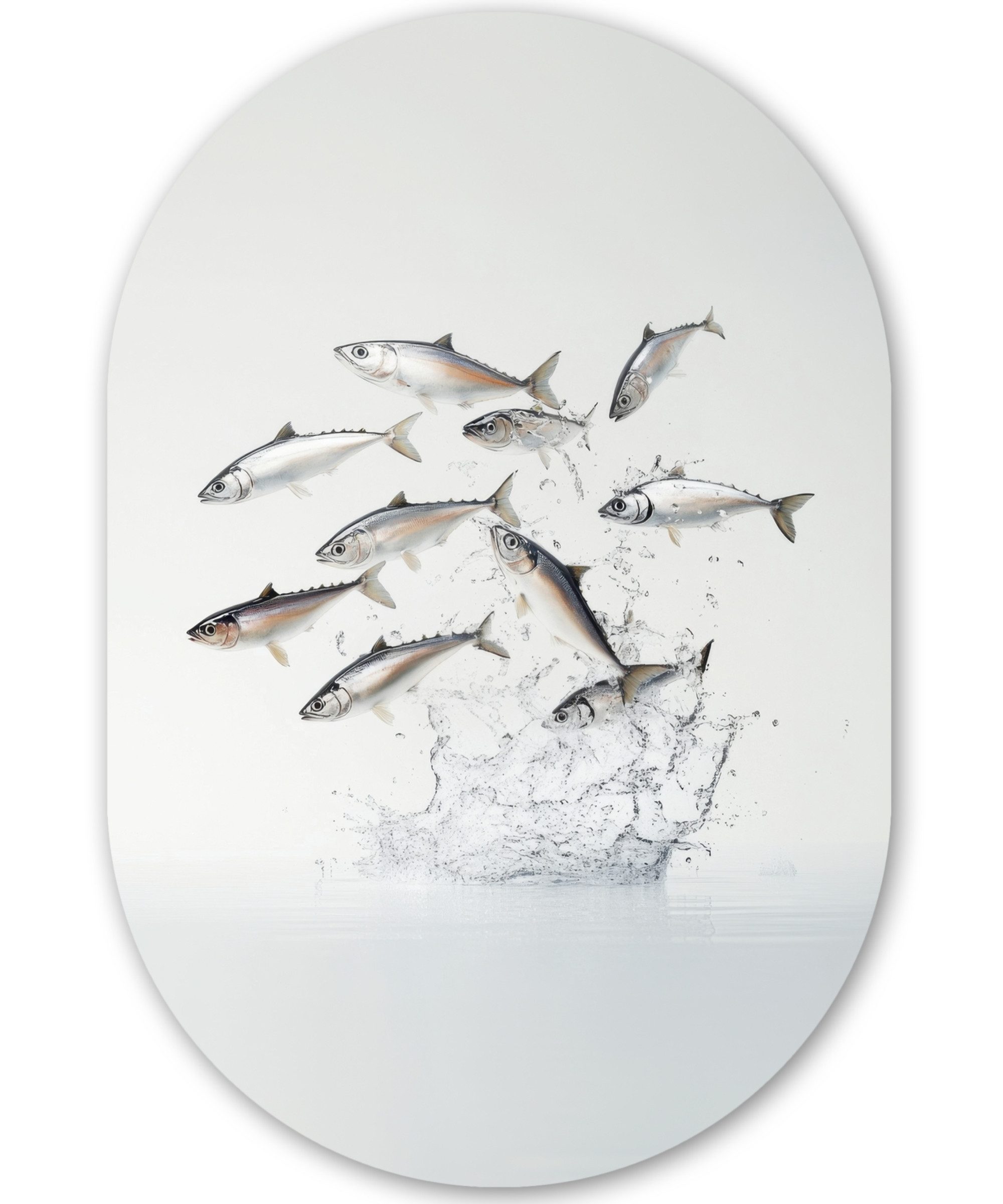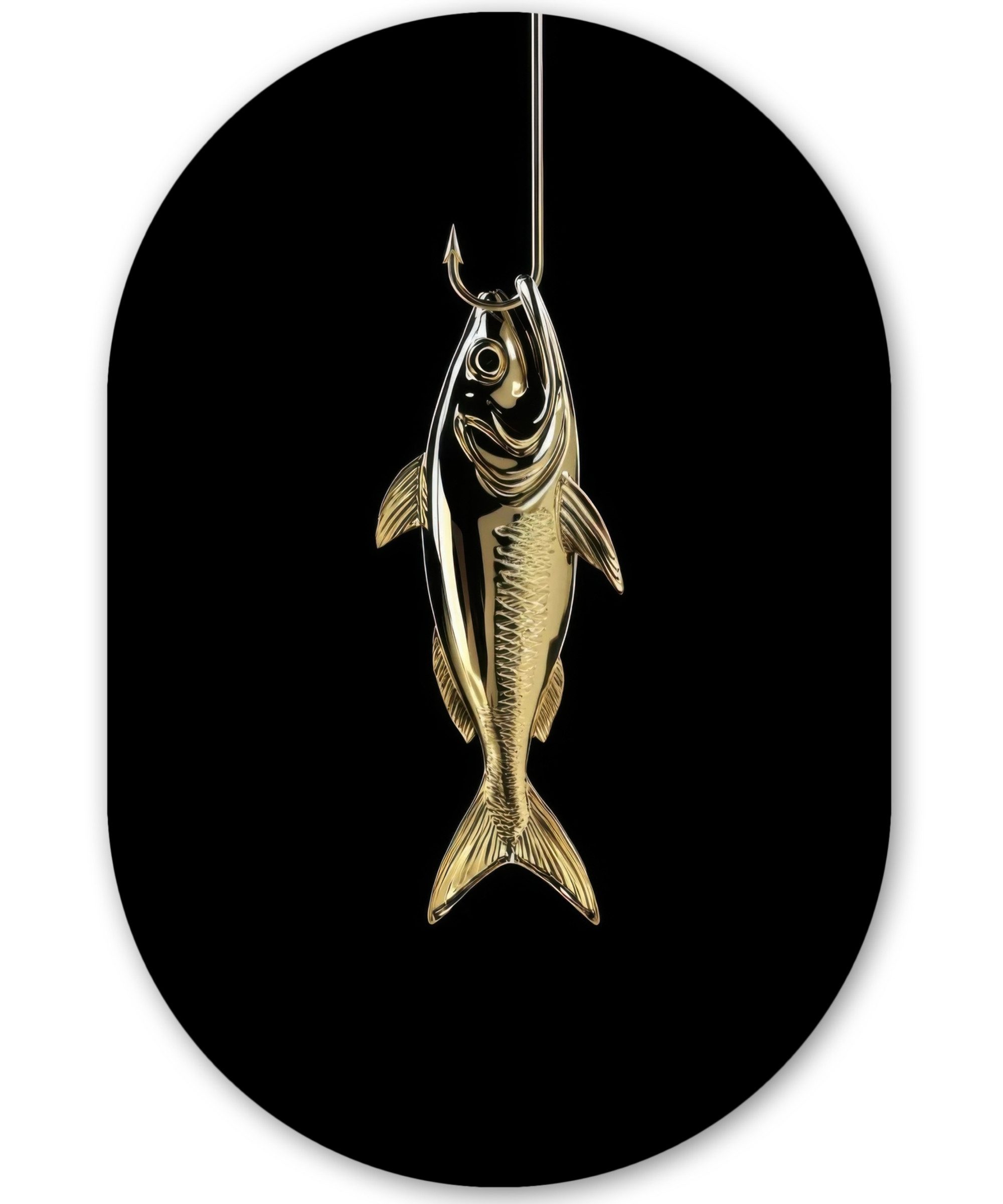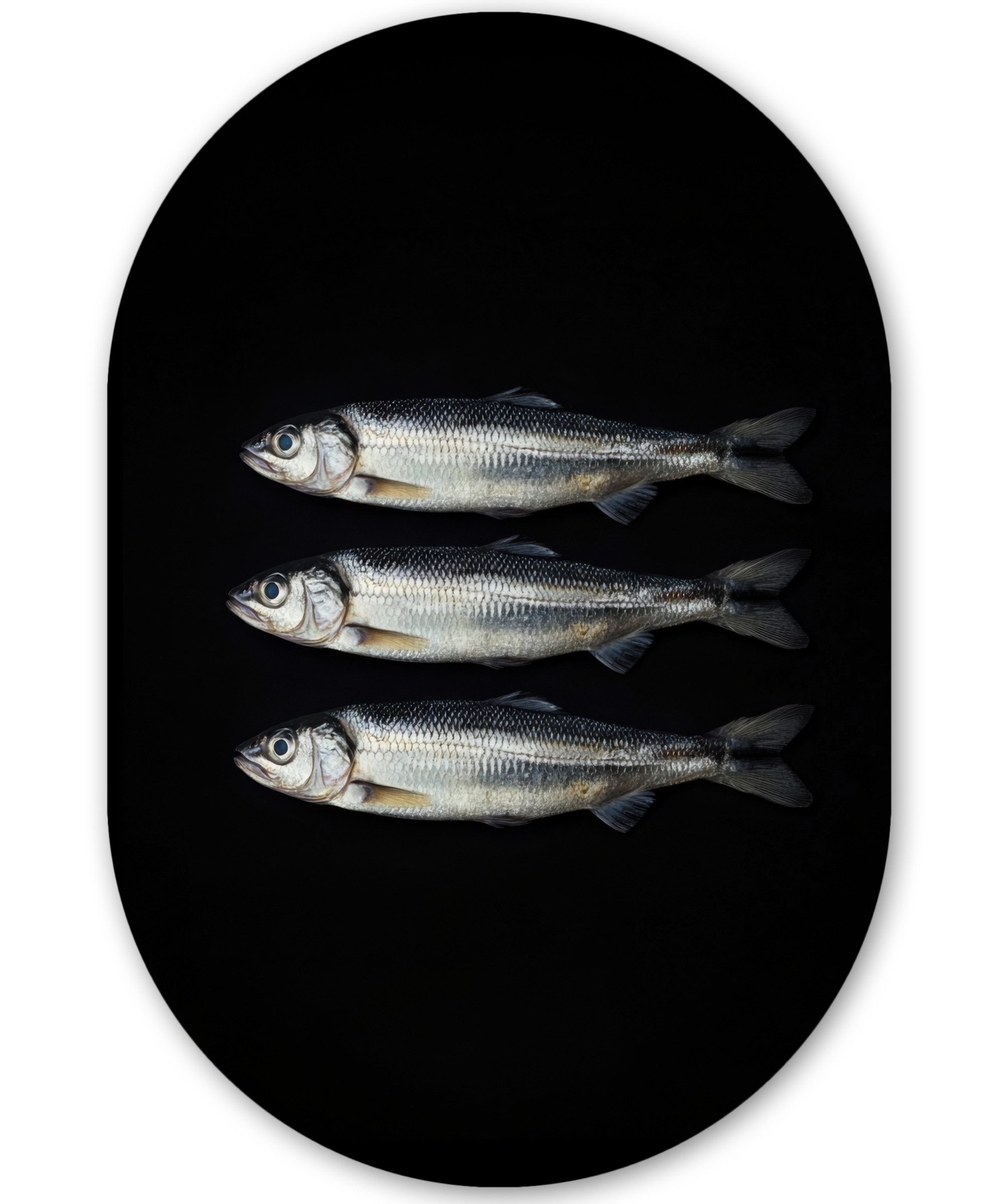 Drei glänzende Pflöcke liegen waagerecht und sauber aufgereiht vor einem schwarzen Hintergrund. Ihre silbrigen Schuppen reflektieren subtil das Licht, während ihre großen, runden Augen ein Gefühl der Wachsamkeit ausstrahlen. Die Textur der Schuppen und die fließenden Konturen ihrer Körper werden durch die minimalistische Komposition sorgfältig hervorgehoben.Kunstgenre | Modern, Natur, Tiere, Abstrakt, Kinderzimmer |