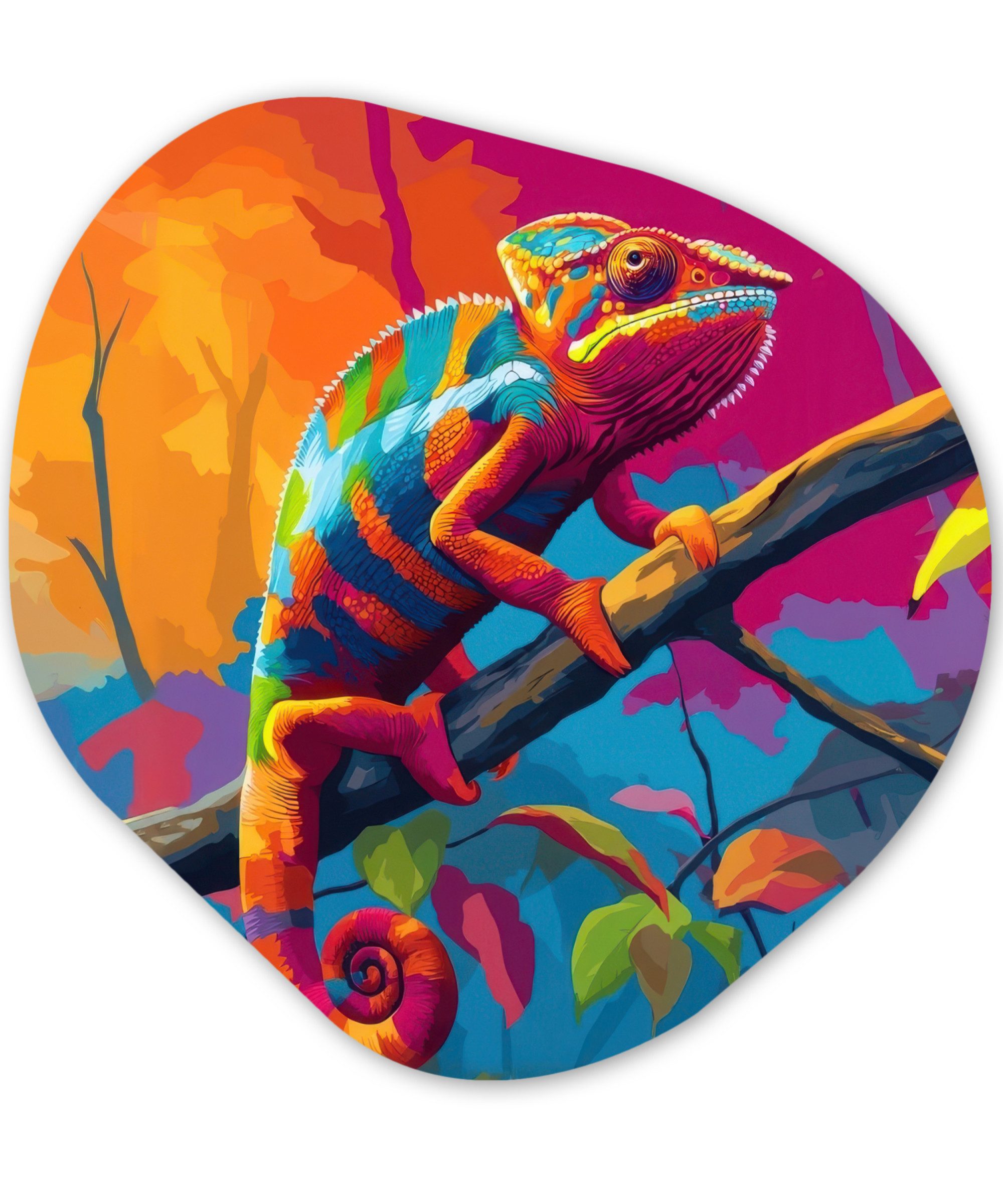 3Ein Chamäleon ruht auf einem Ast in einem lebhaften Wald. Sein Körper ist in leuchtendem Orange, Blau und Grün gestreift und passt perfekt zu den warmen und kühlen Tönen des Laubes hinter ihm. Der Sonnenuntergang im Hintergrund schafft eine verträumte Atmosphäre.Kunstgenre | Modern, Natur, Tiere, Abstrakt, Kinderzimmer |