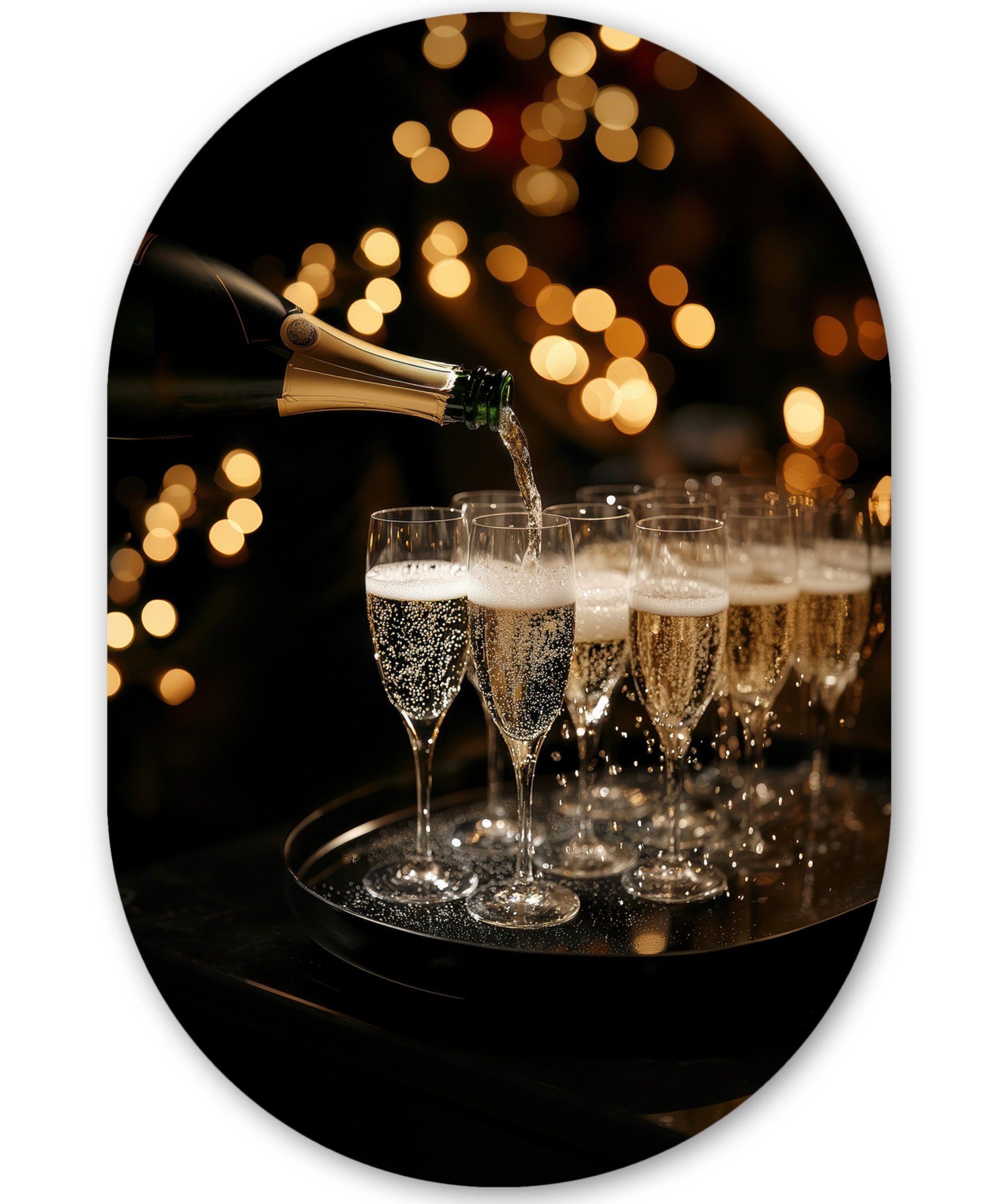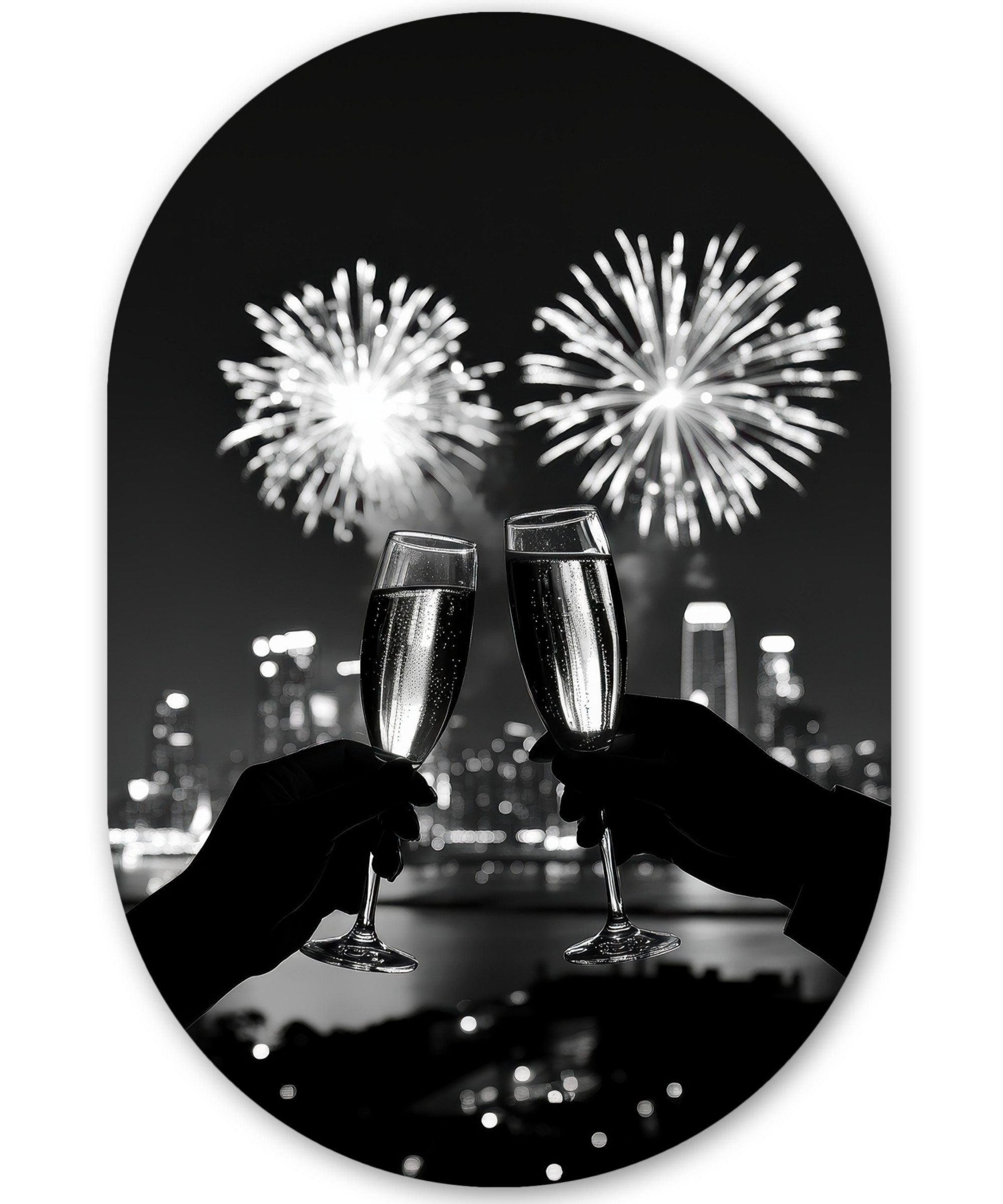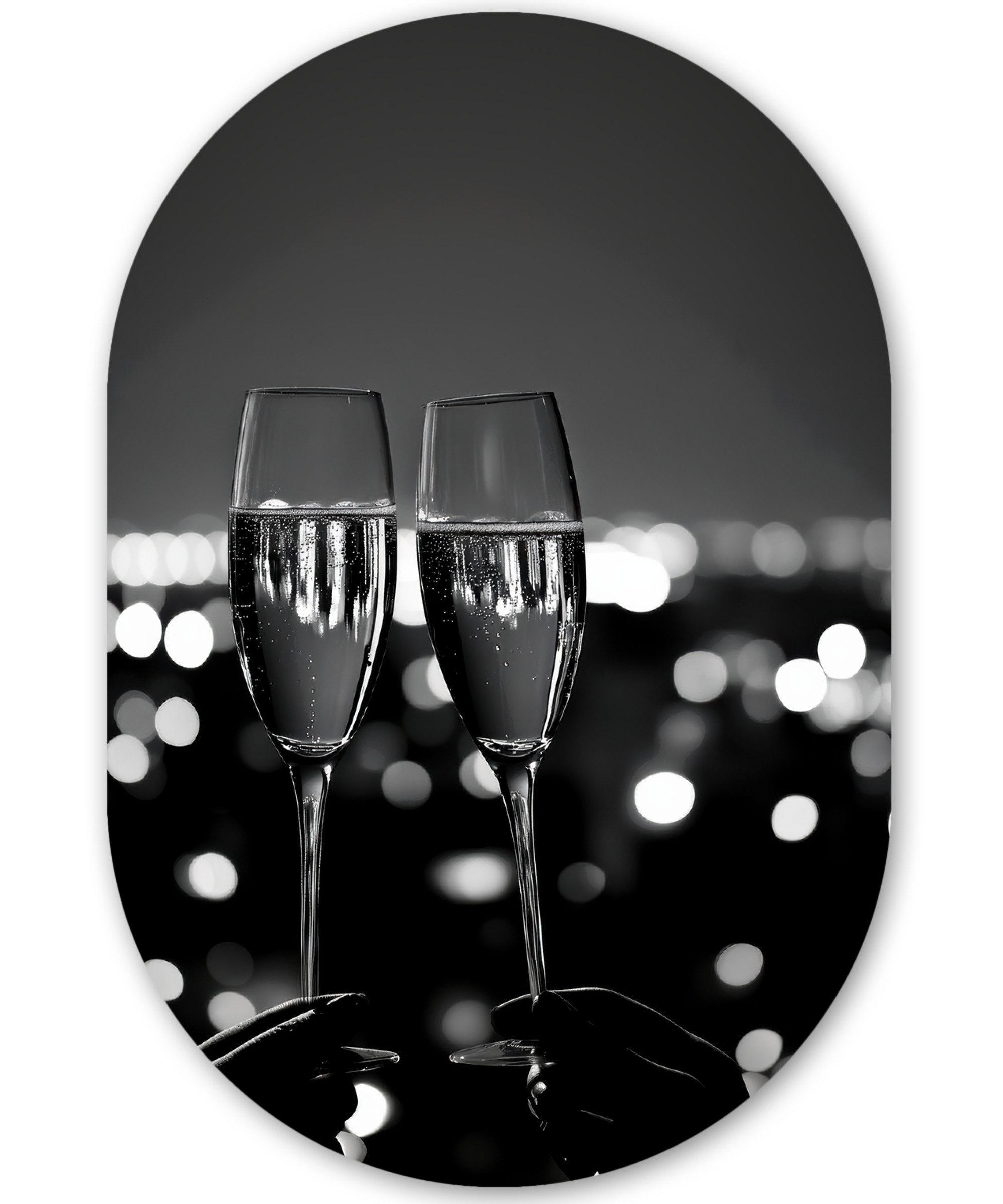 Zwei mit sprudelnder Flüssigkeit gefüllte Sektgläser stehen nebeneinander, eingerahmt von verschwommenen Stadtlichtern. Die Lichtreflexe in den Gläsern sorgen für ein festliches und luxuriöses Aussehen.Kunstgenre | Modern, Natur, Tiere, Abstrakt, Kinderzimmer |