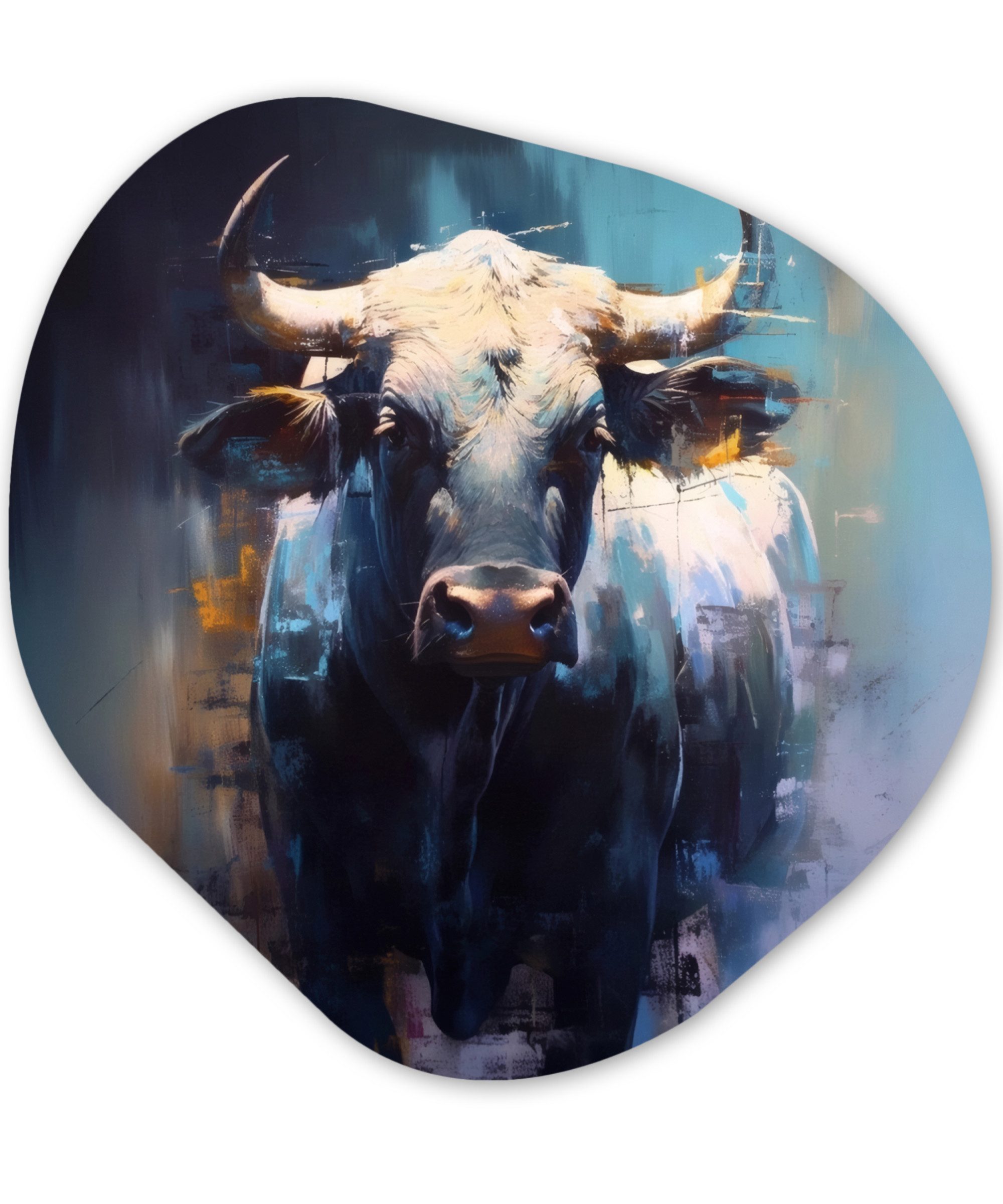 Ein imposanter schwarzer Stier mit großen Hörnern, dramatisch beleuchtet vor einem abstrakten Hintergrund in Blau- und Grautönen.Kunstgenre | Modern, Natur, Tiere, Abstrakt, Kinderzimmer |