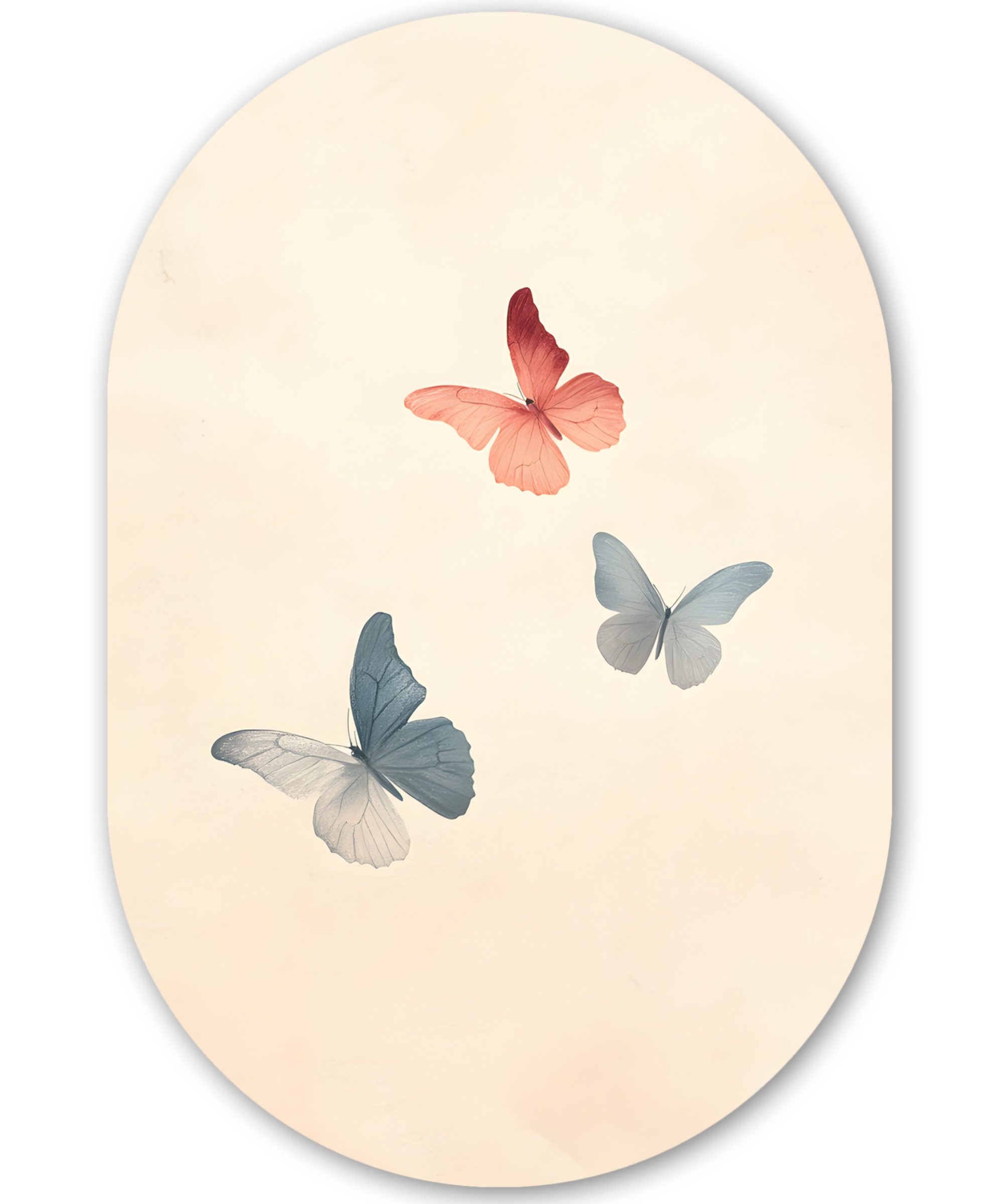 Drei Schmetterlinge schweben in einem weichen, beigen Raum; ein leuchtend orangefarbener in der Mitte, flankiert von zwei in verschiedenen Blautönen, mit zarten Flügeln, die Licht durchlassen.Kunstgenre | Modern, Natur, Tiere, Abstrakt, Kinderzimmer |